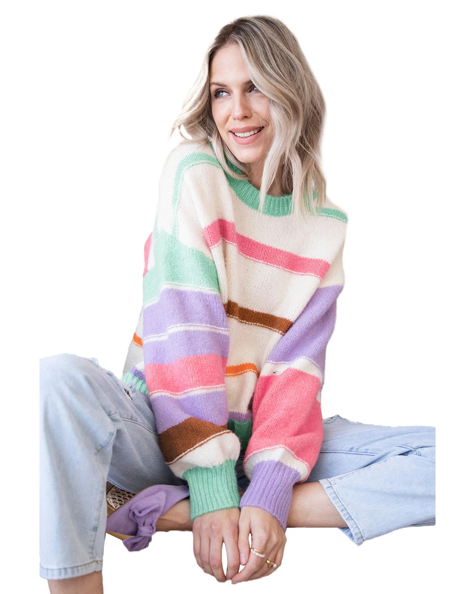 Multicolor Striped Colorblock Drop Shoulder Sweater – M