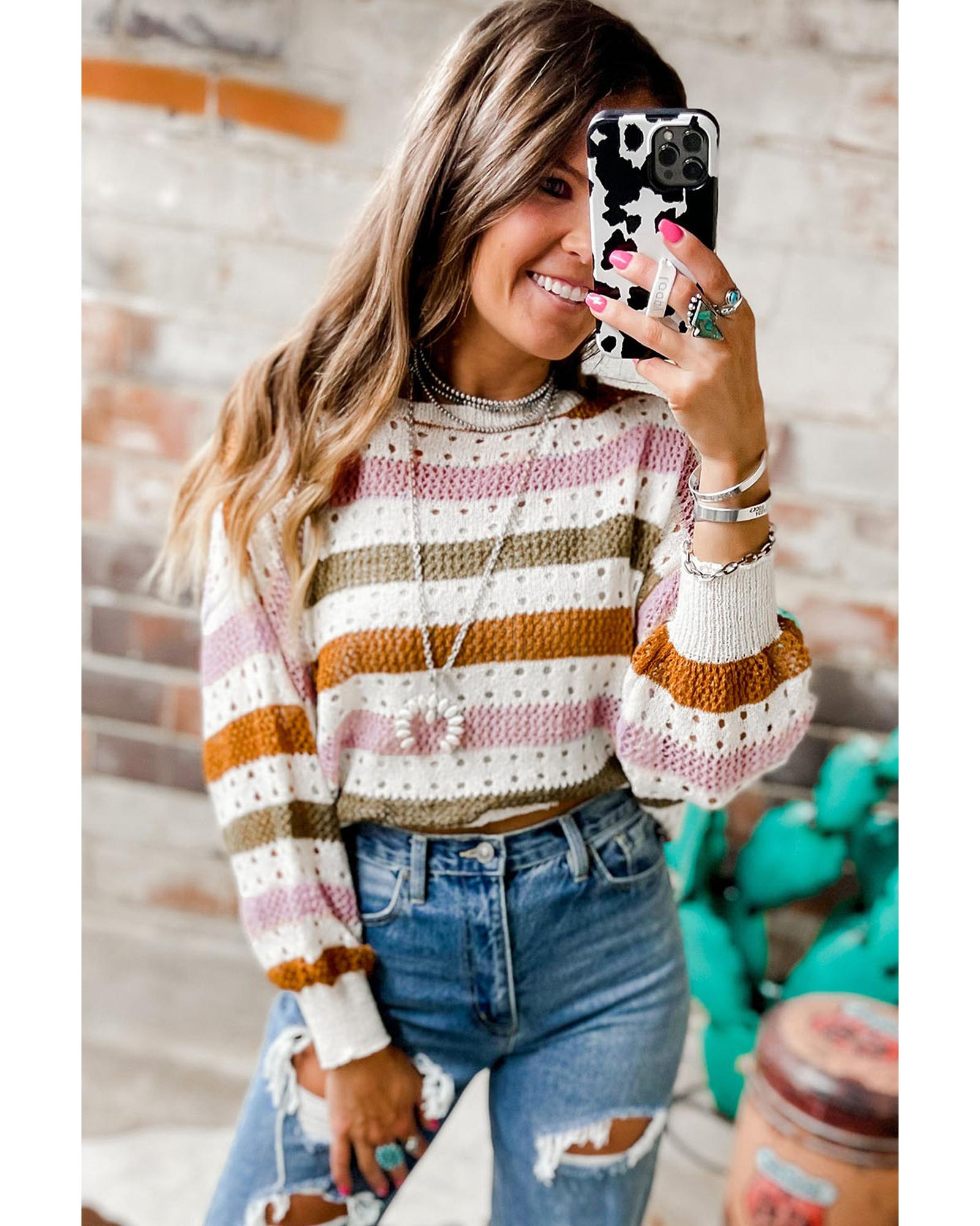 Multicolor Striped Hollowed Knitted Loose Sweater – L