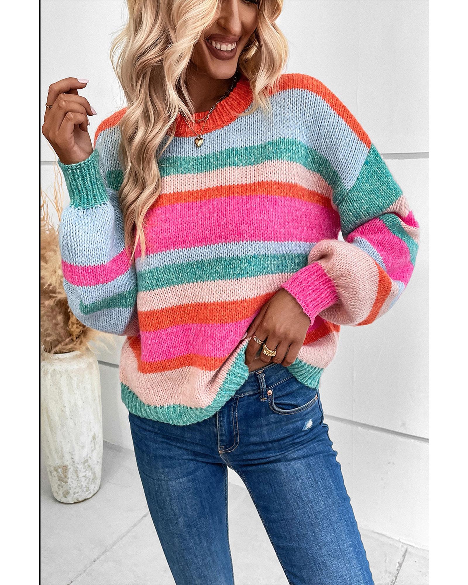 Multicolor Striped Knit Drop Shoulder Puff Sleeve Sweater – S
