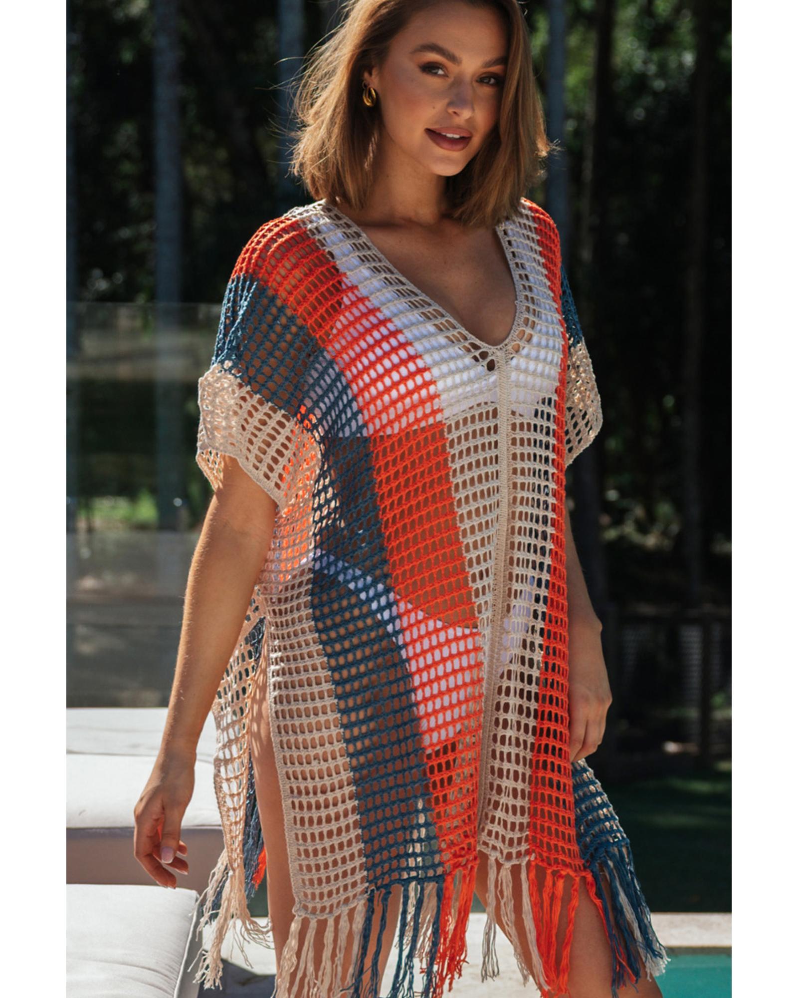 Multicolor Striped Tassel Crochet V Neck Beach Cover Up – M