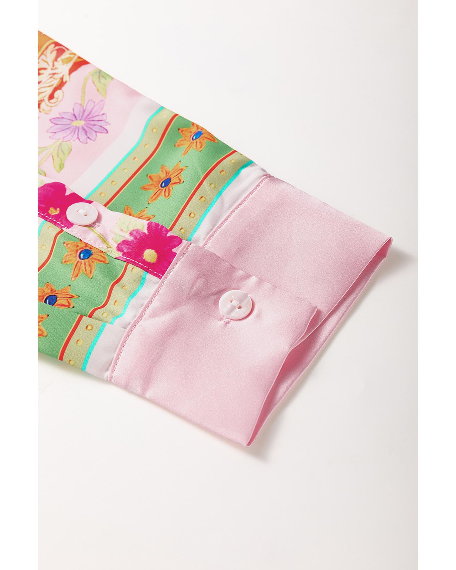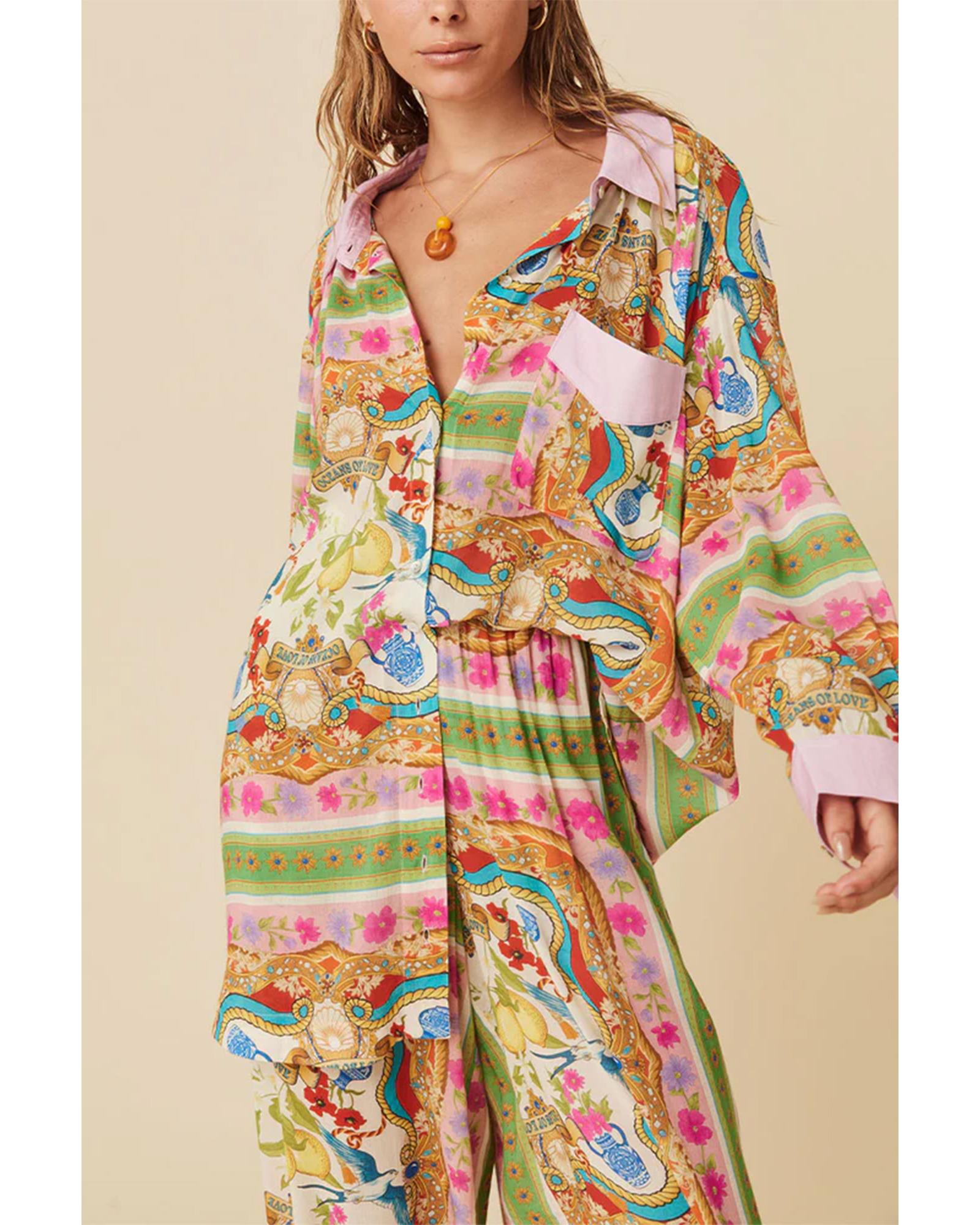 Multicolour Boho Floral Print Buttoned Long Sleeve Shirt Dress - M