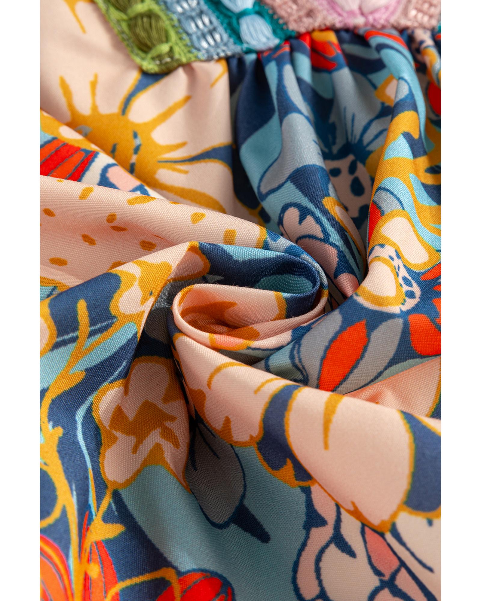 Multicolour Boho Floral Print Crochet Patchwork V Neck Loose Mini Dress – S