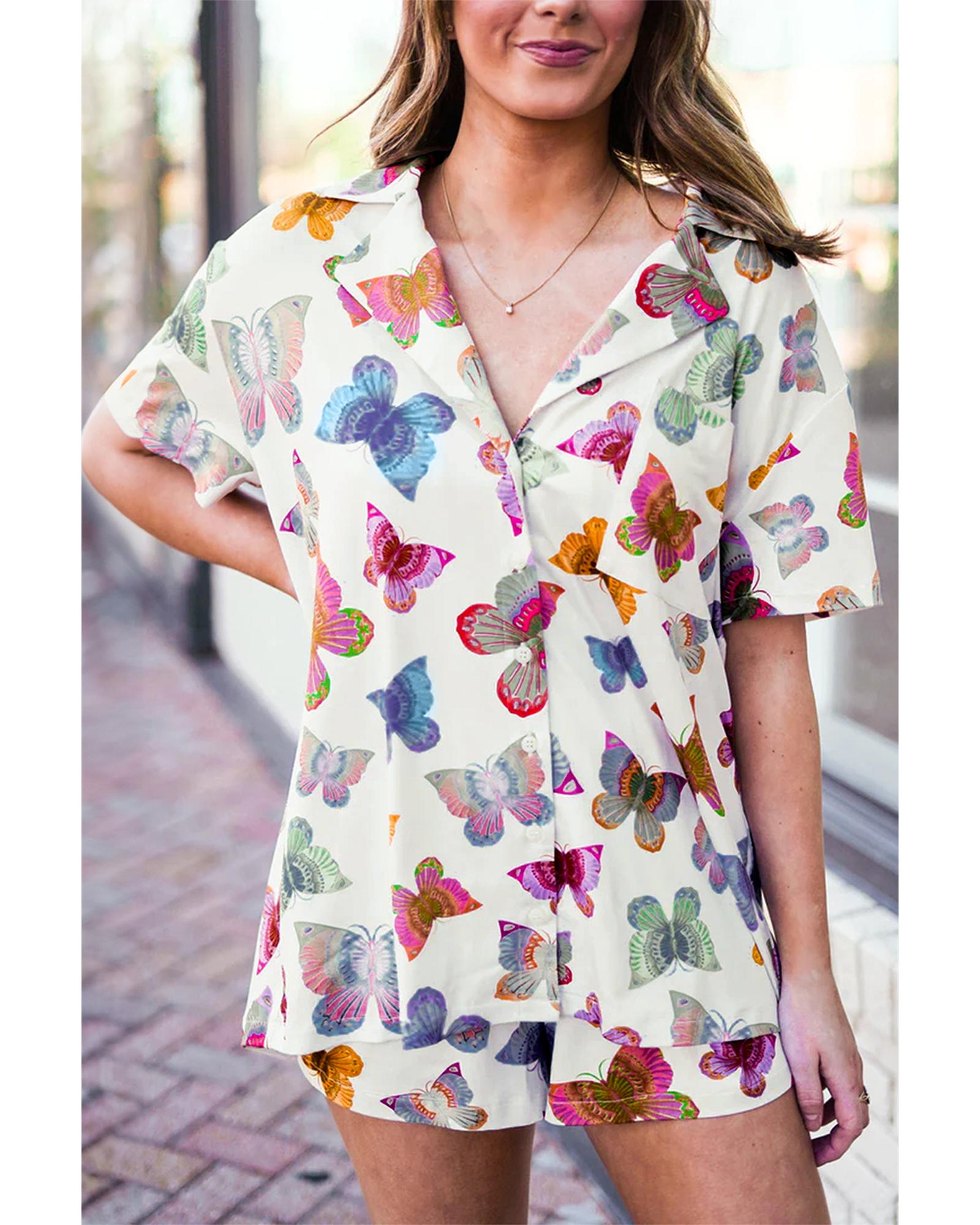 Multicolour Butterfly Pattern Short Sleeve Shirt Pajamas Set – L