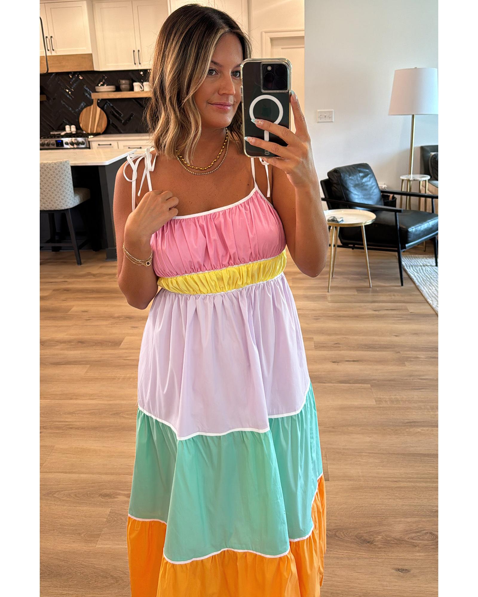 Multicolour Colorblock Self-tie Straps High Waist Flowy Maxi Dress with Pockets – M