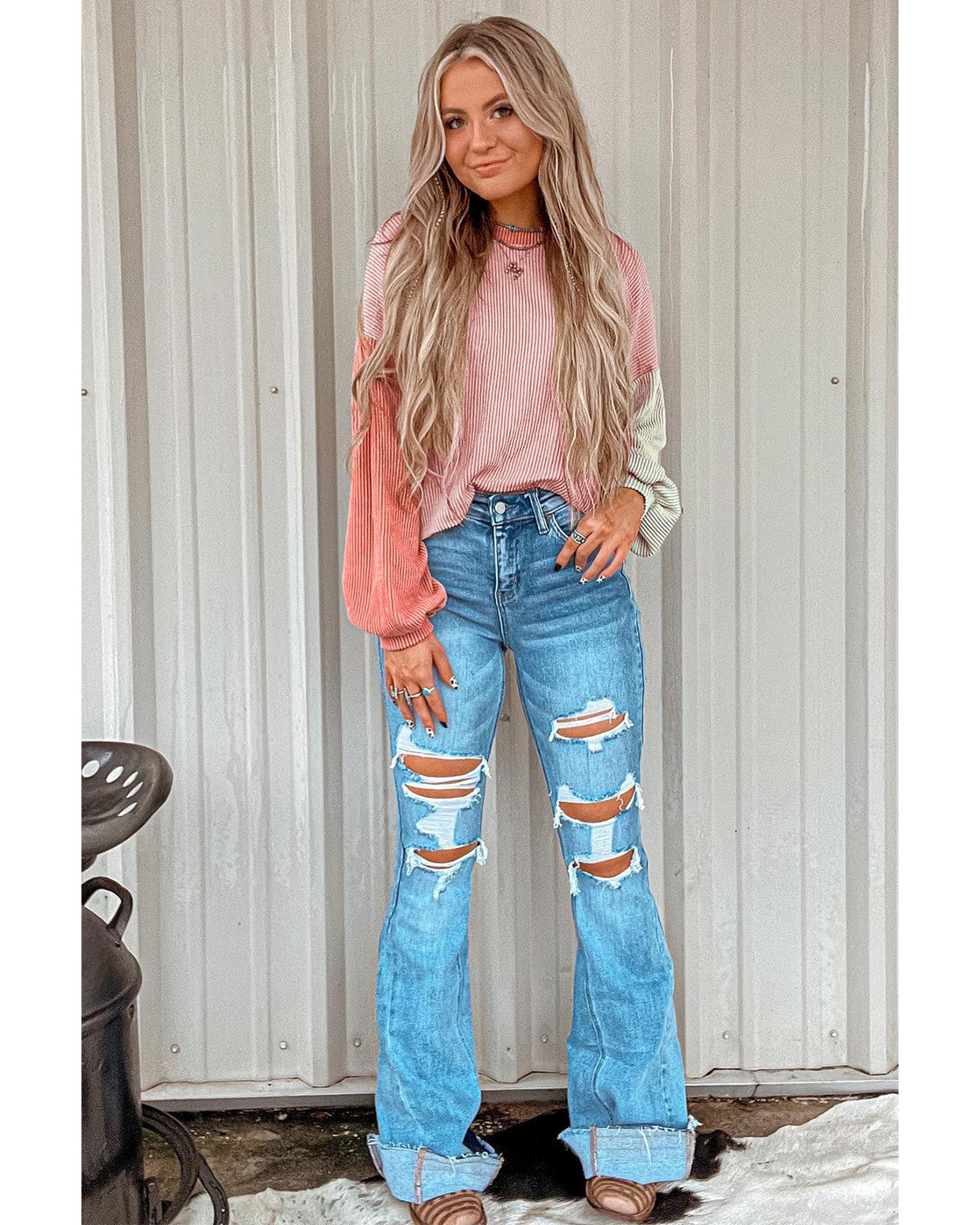 Multicolour Corded Colorblock Patchwork Drop Shoulder Long Sleeve Top – M