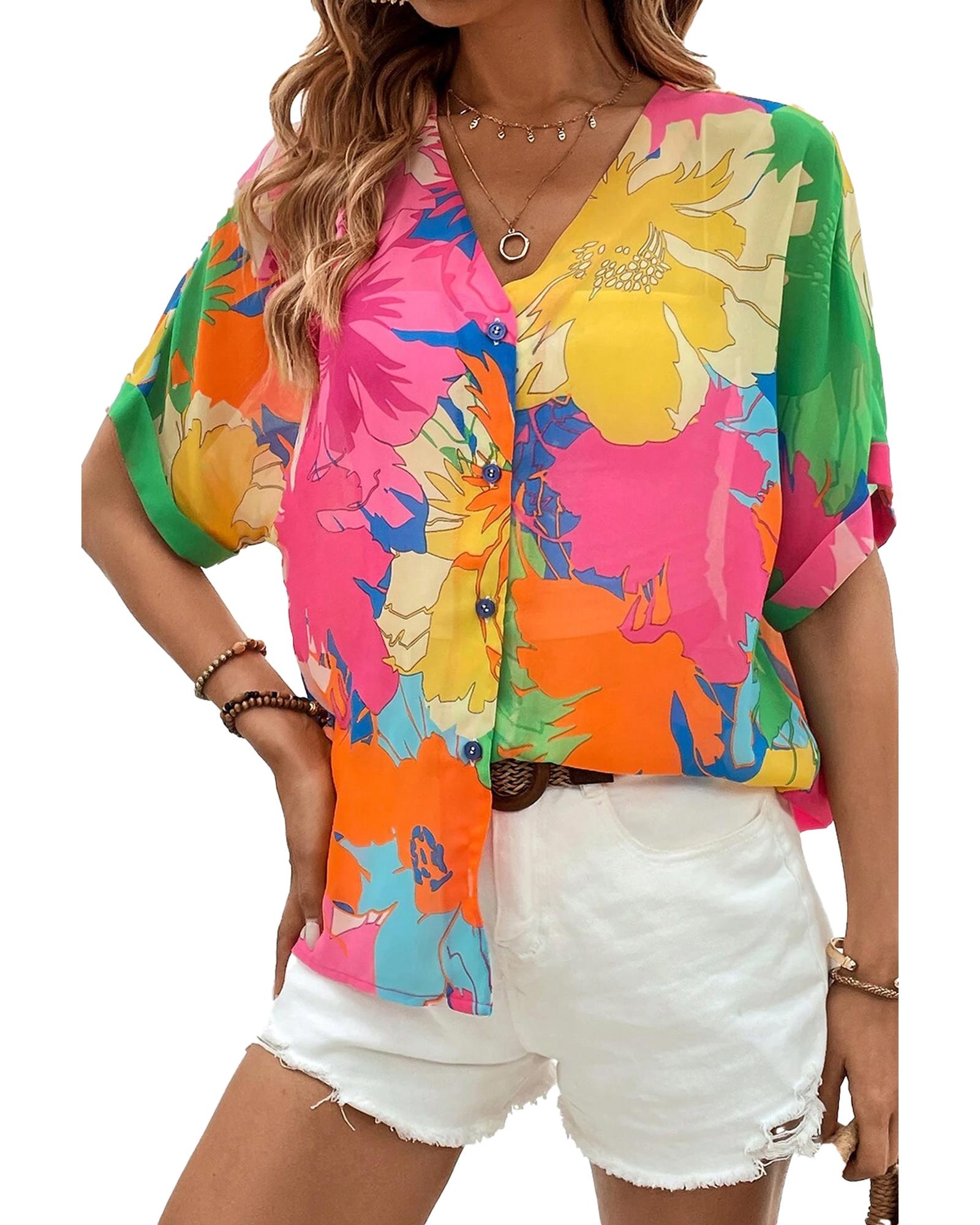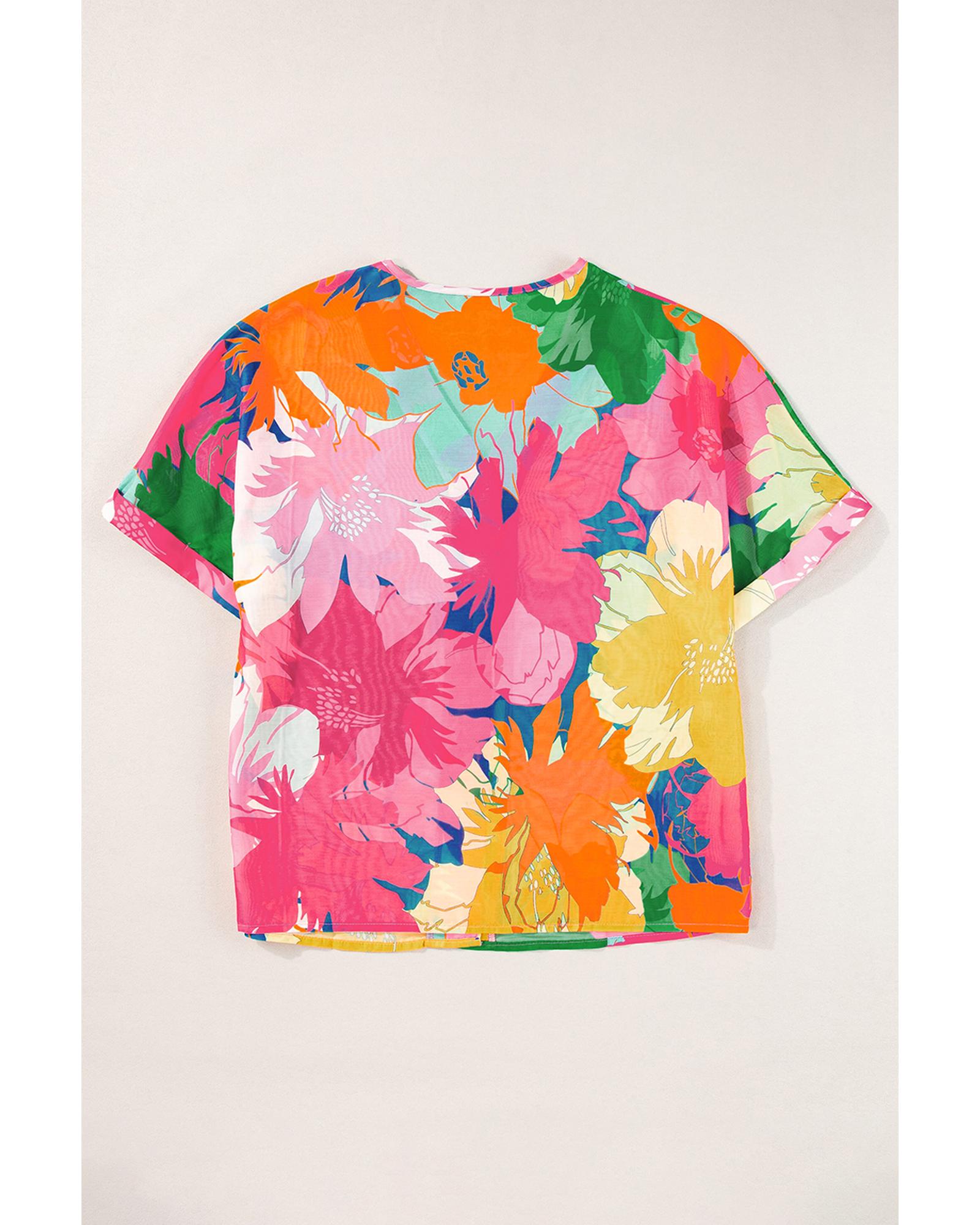 Multicolour Floral Print Folded Short Sleeve Shirt – XL