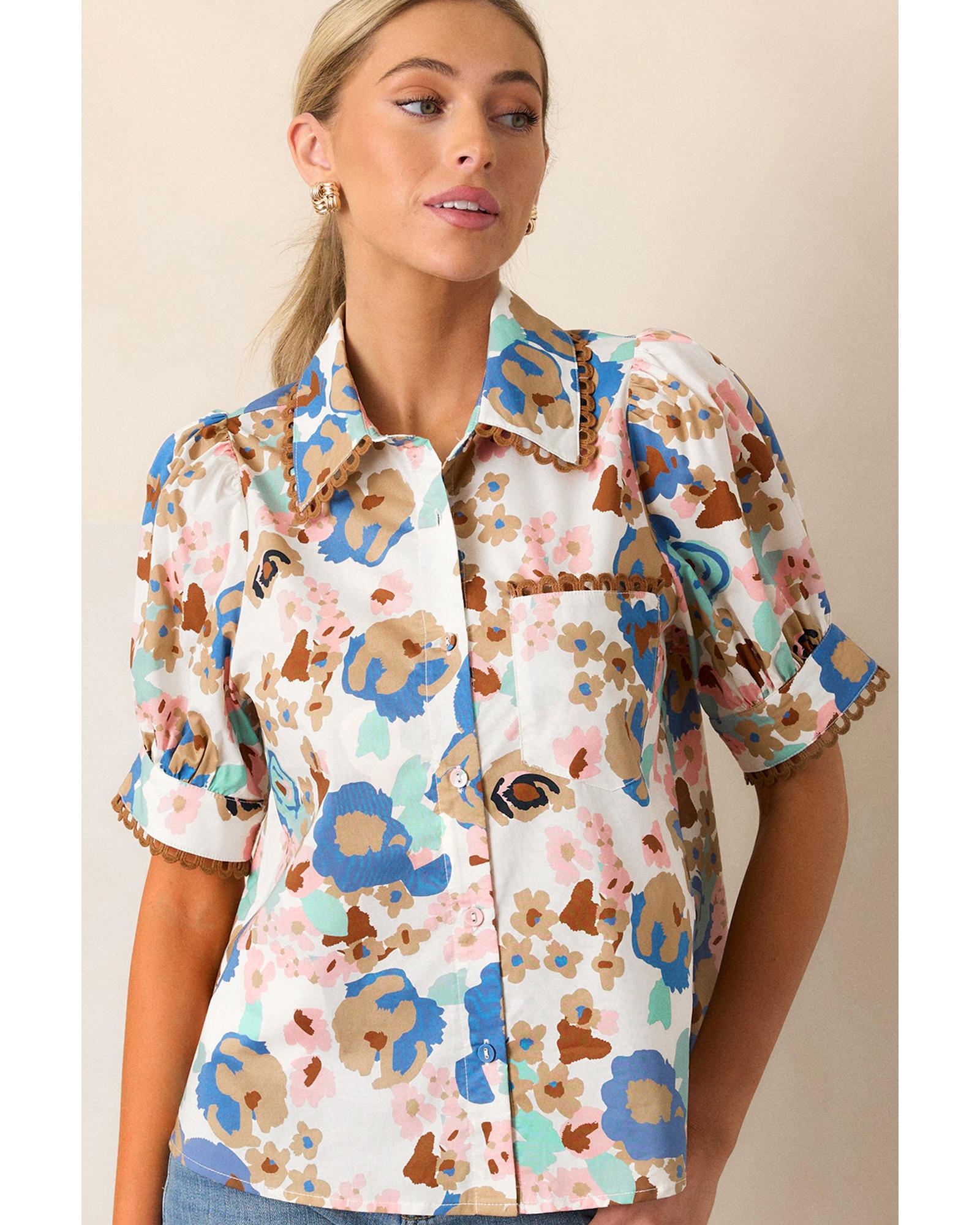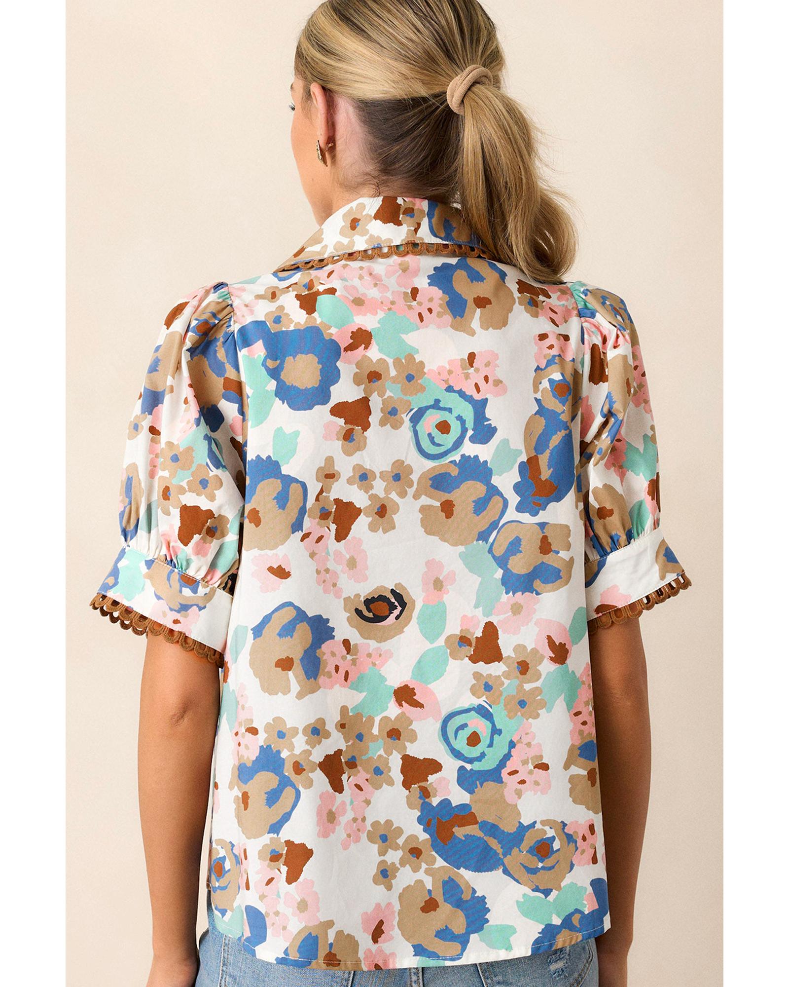 Multicolour Floral Print Ricrac Trim Collared Puff Short Sleeve Shirt – XL