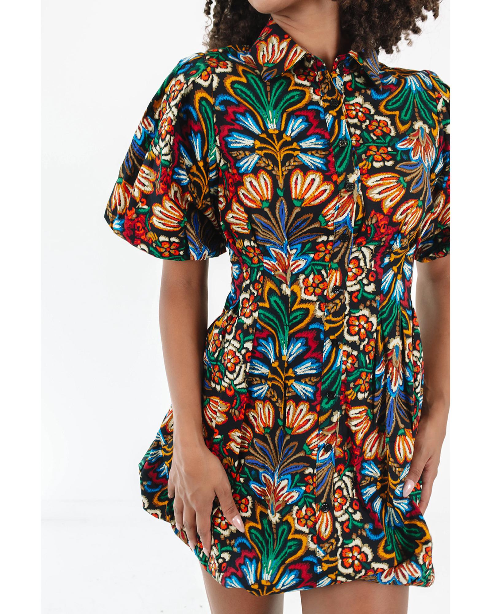 Multicolour Floral Puff Short Sleeve Shirt Mini Dress – L