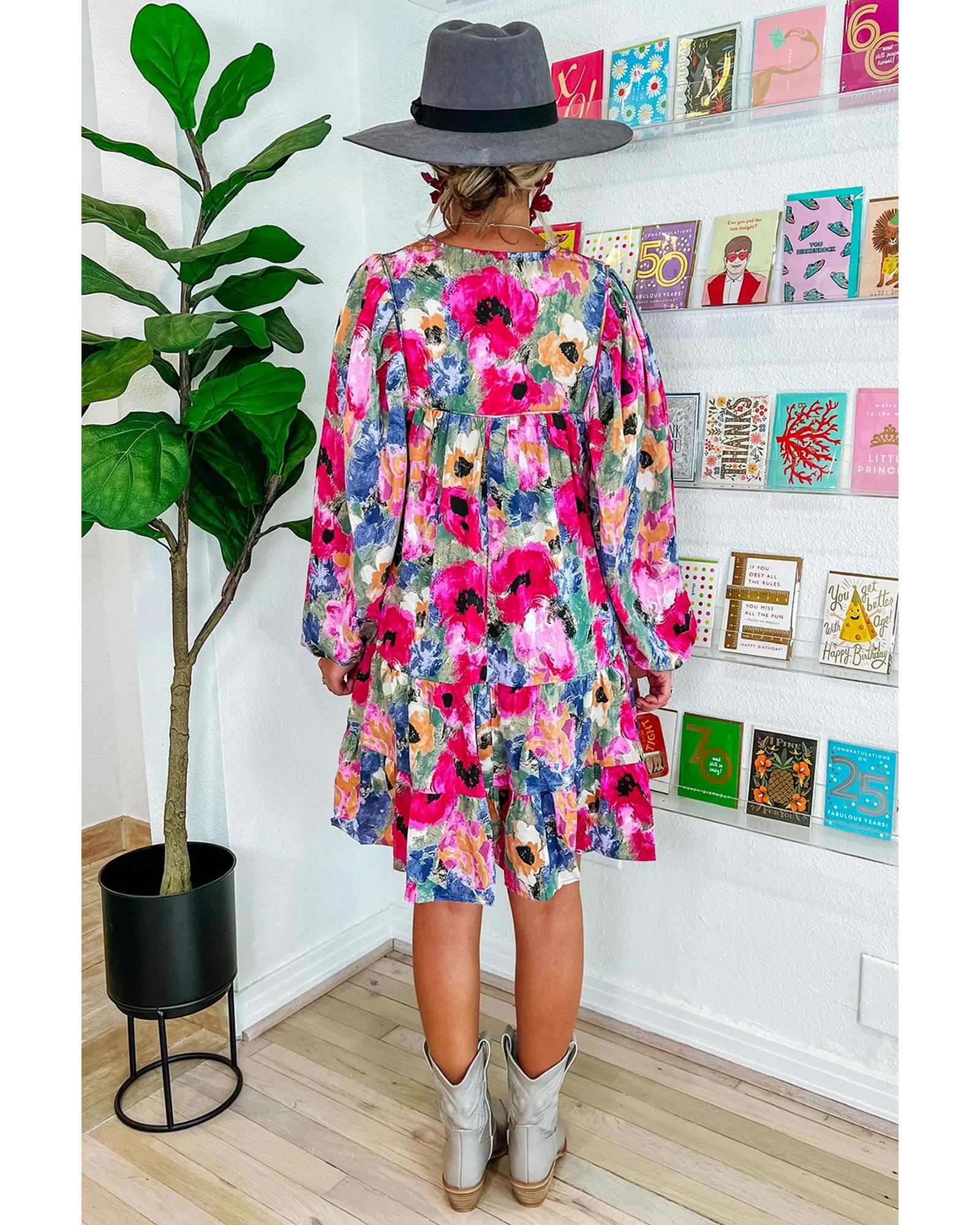 Multicolour Floral Tie Neck Bubble Sleeve Shift Dress – XL