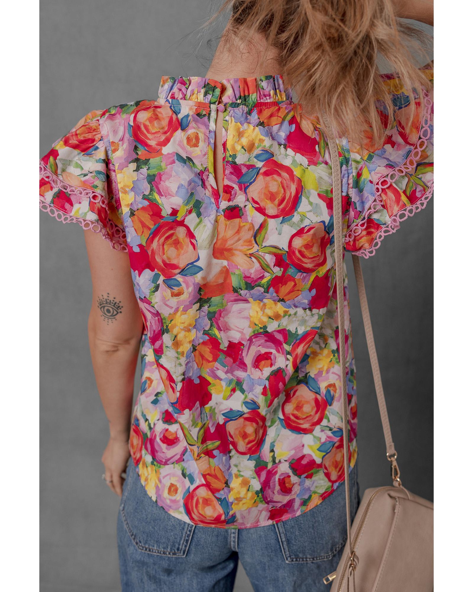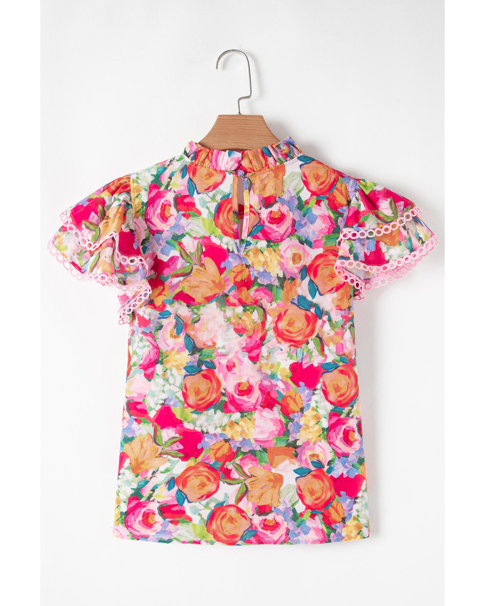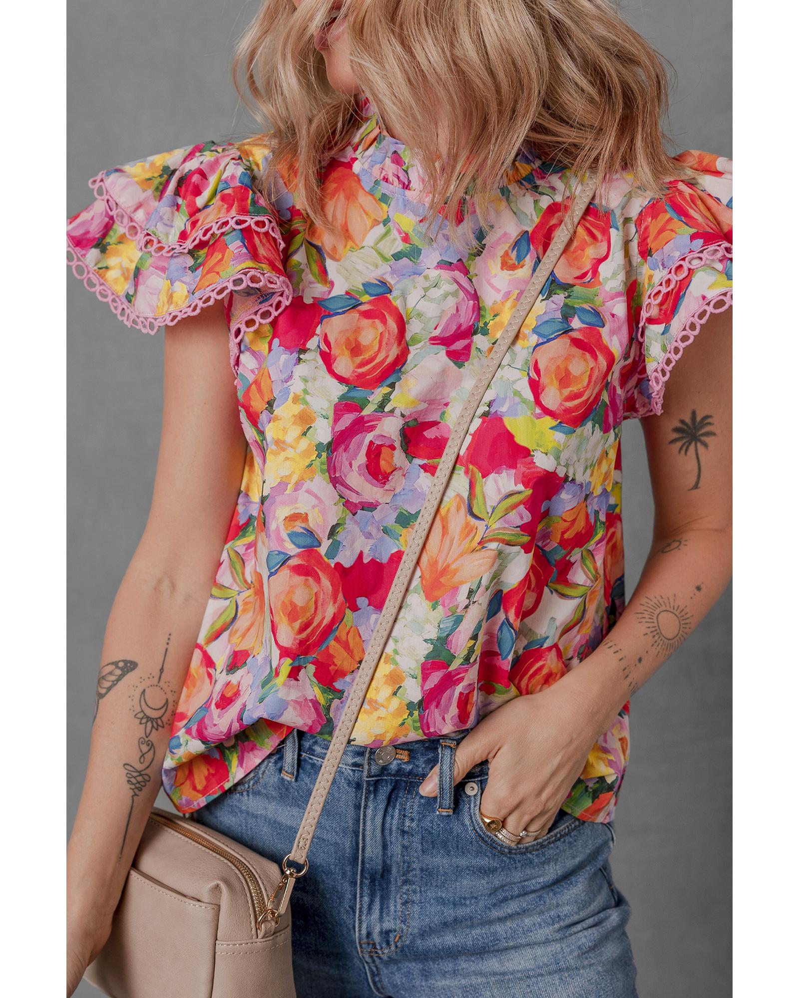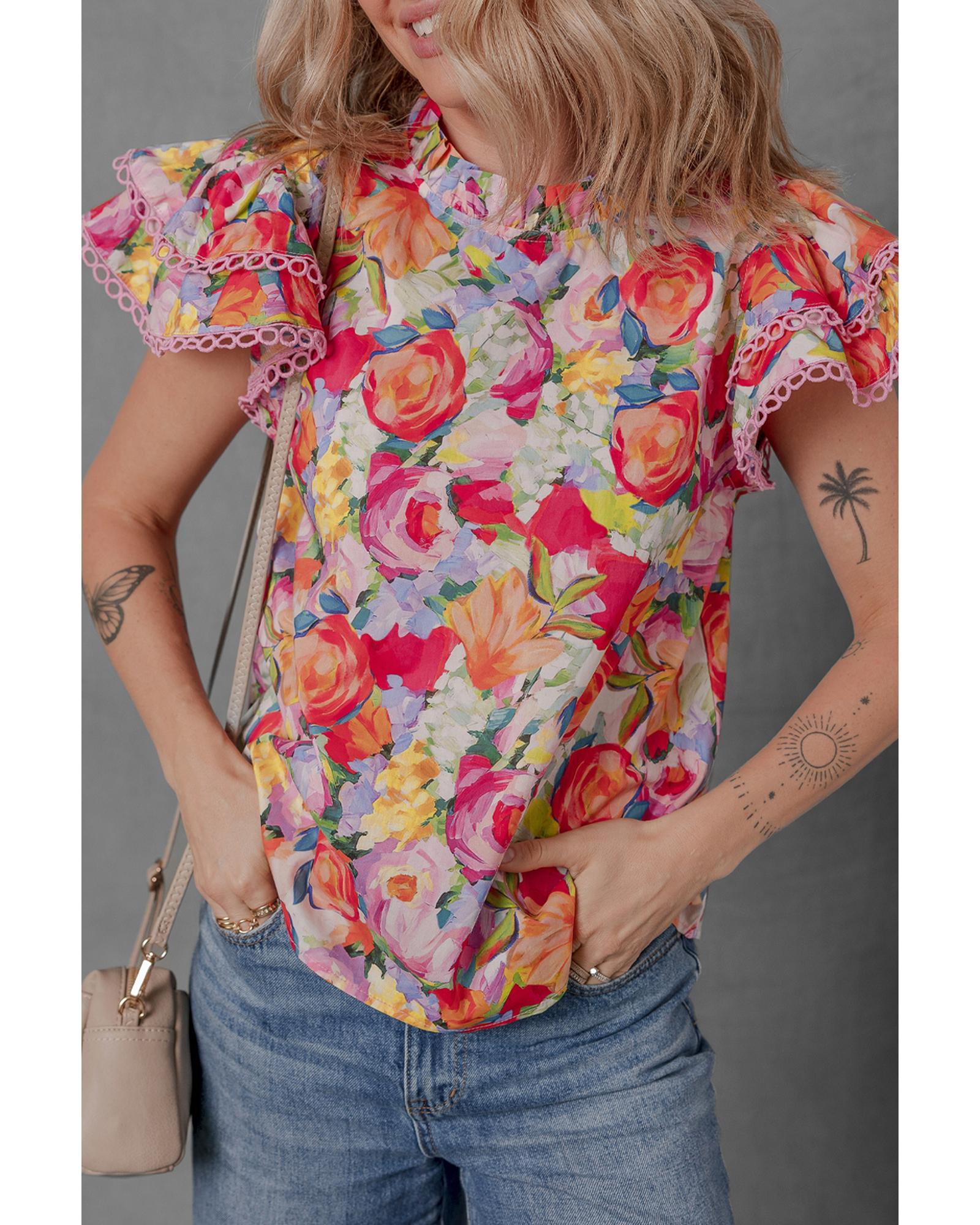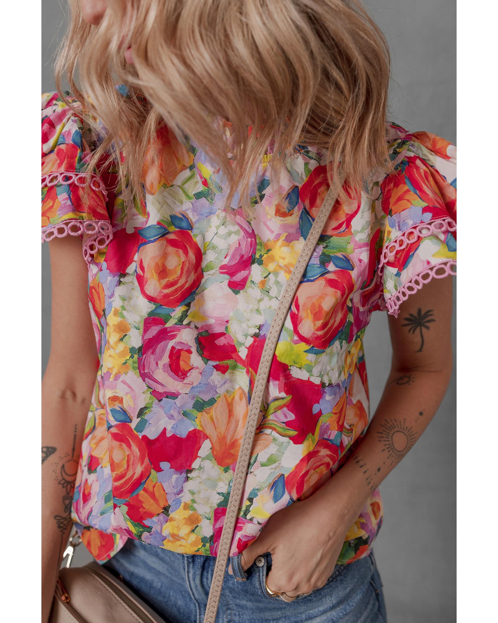 Multicolour Lace Trim Ruffle Short Sleeve Floral Blouse – XL