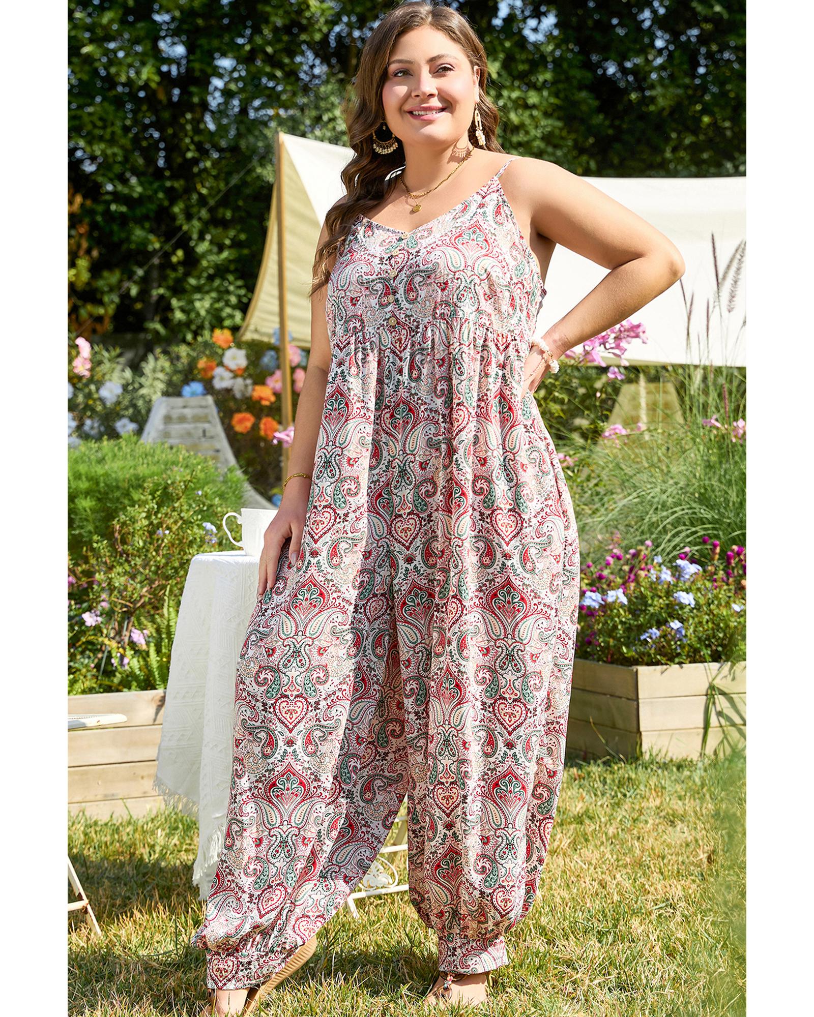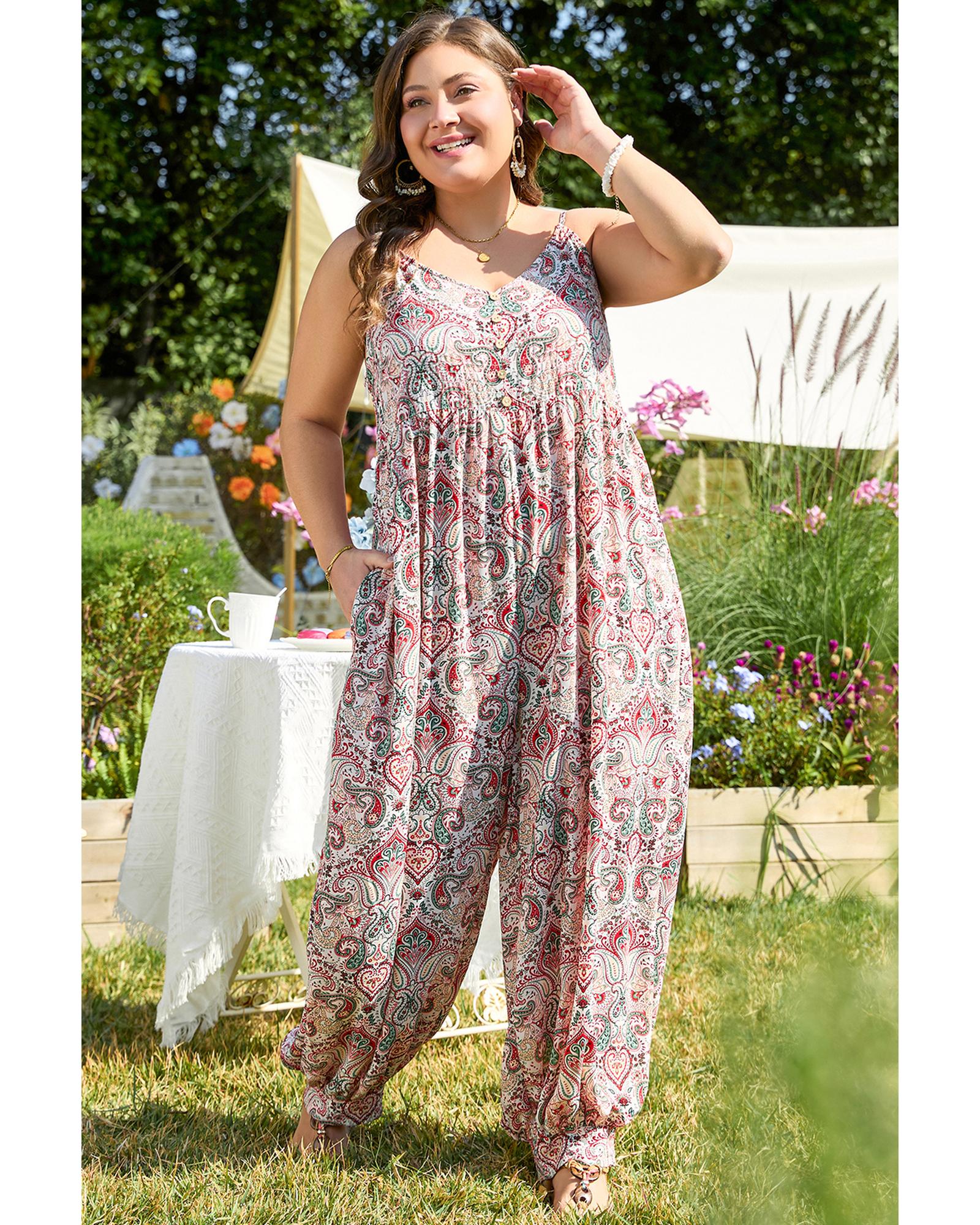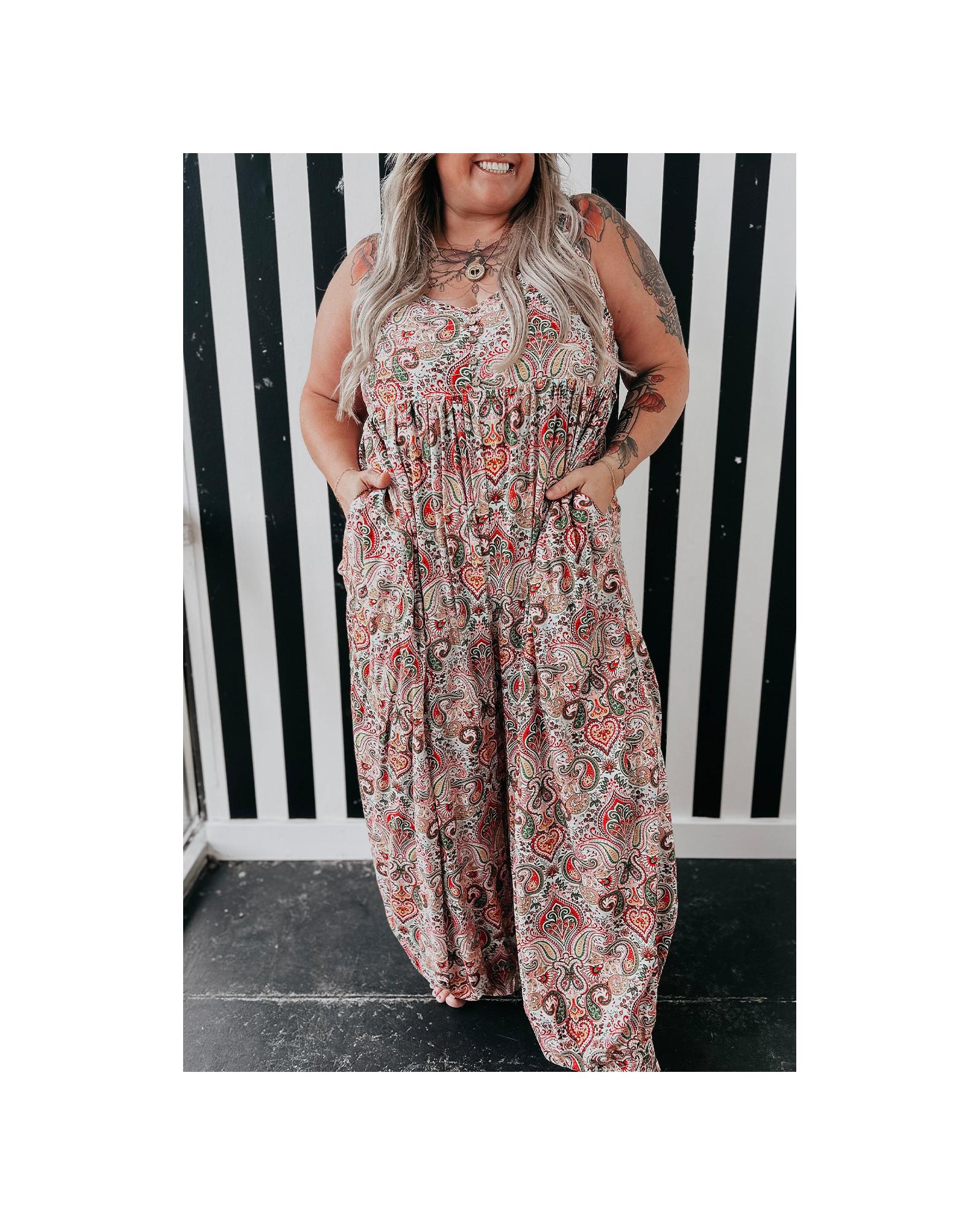 Multicolour Plus Size Paisley Print Sleeveless V Neck Jogger Jumpsuit – 3X