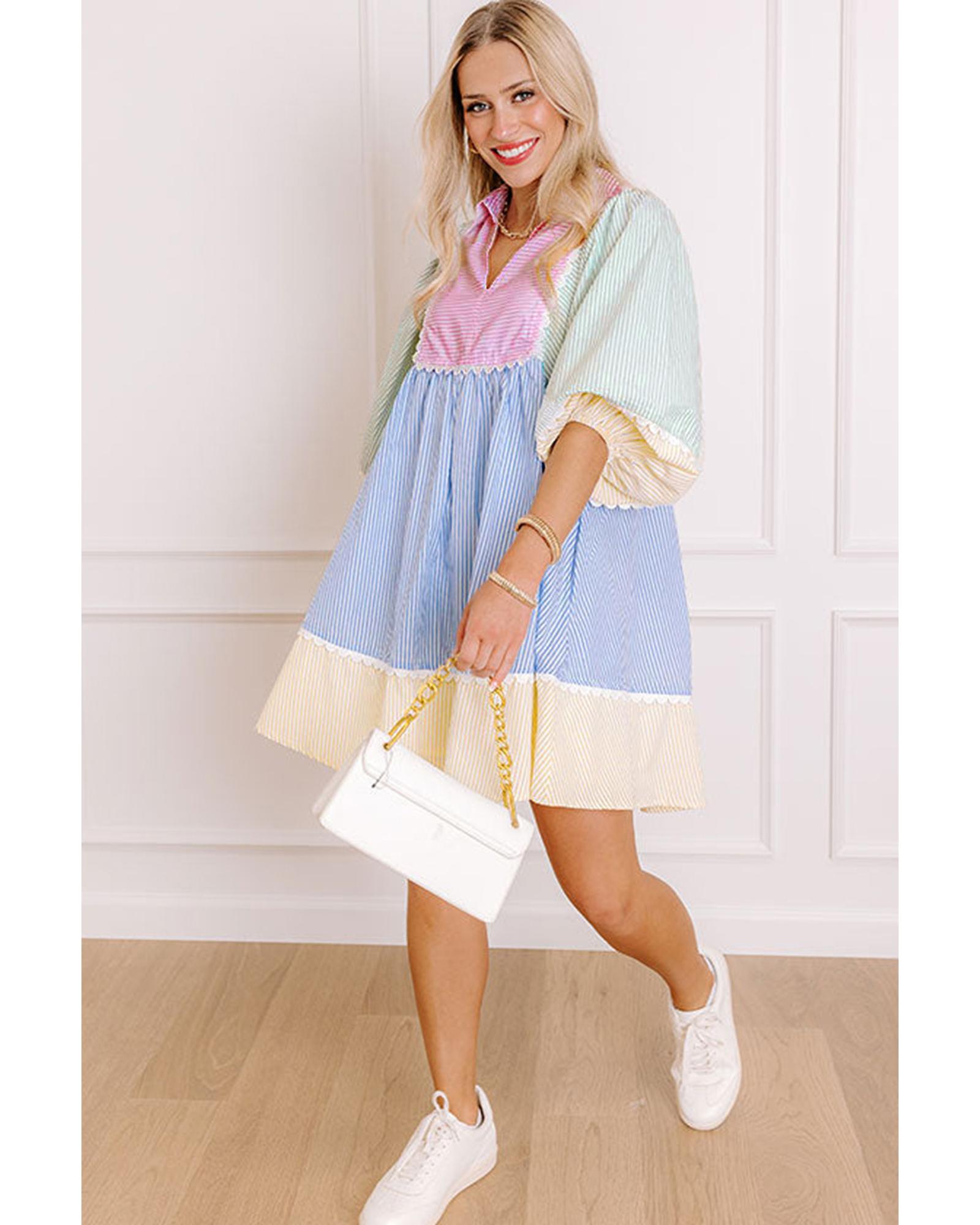 Multicolour Striped Patchwork Ric Rac Puff Sleeve Collared Mini Dress – L