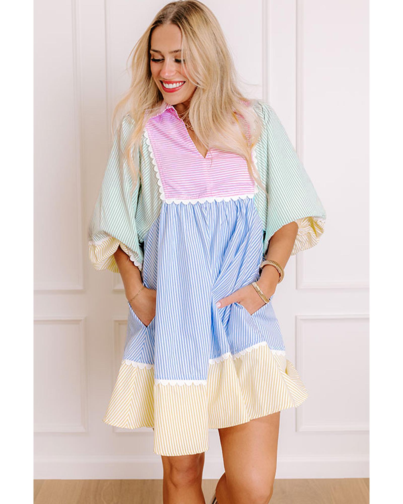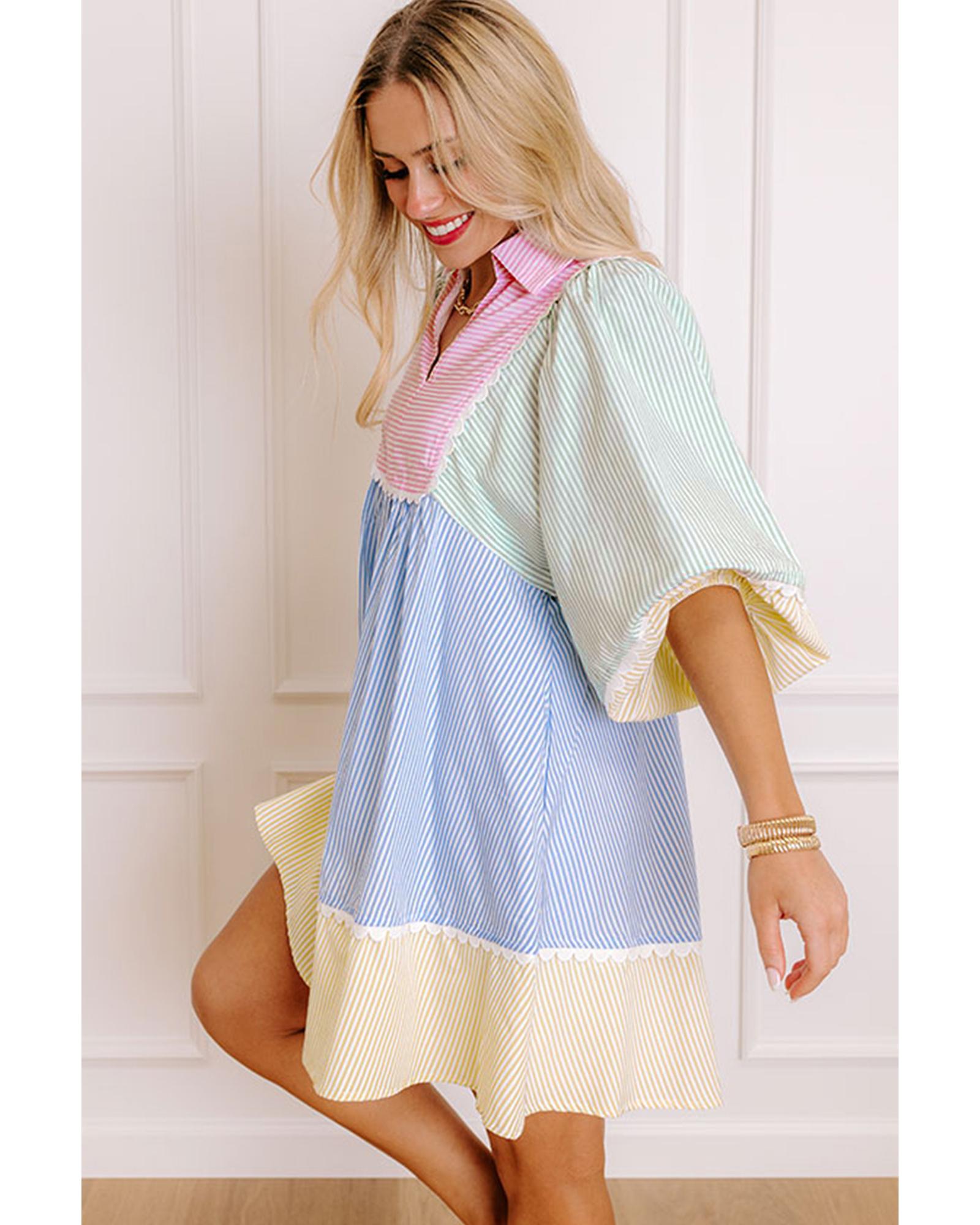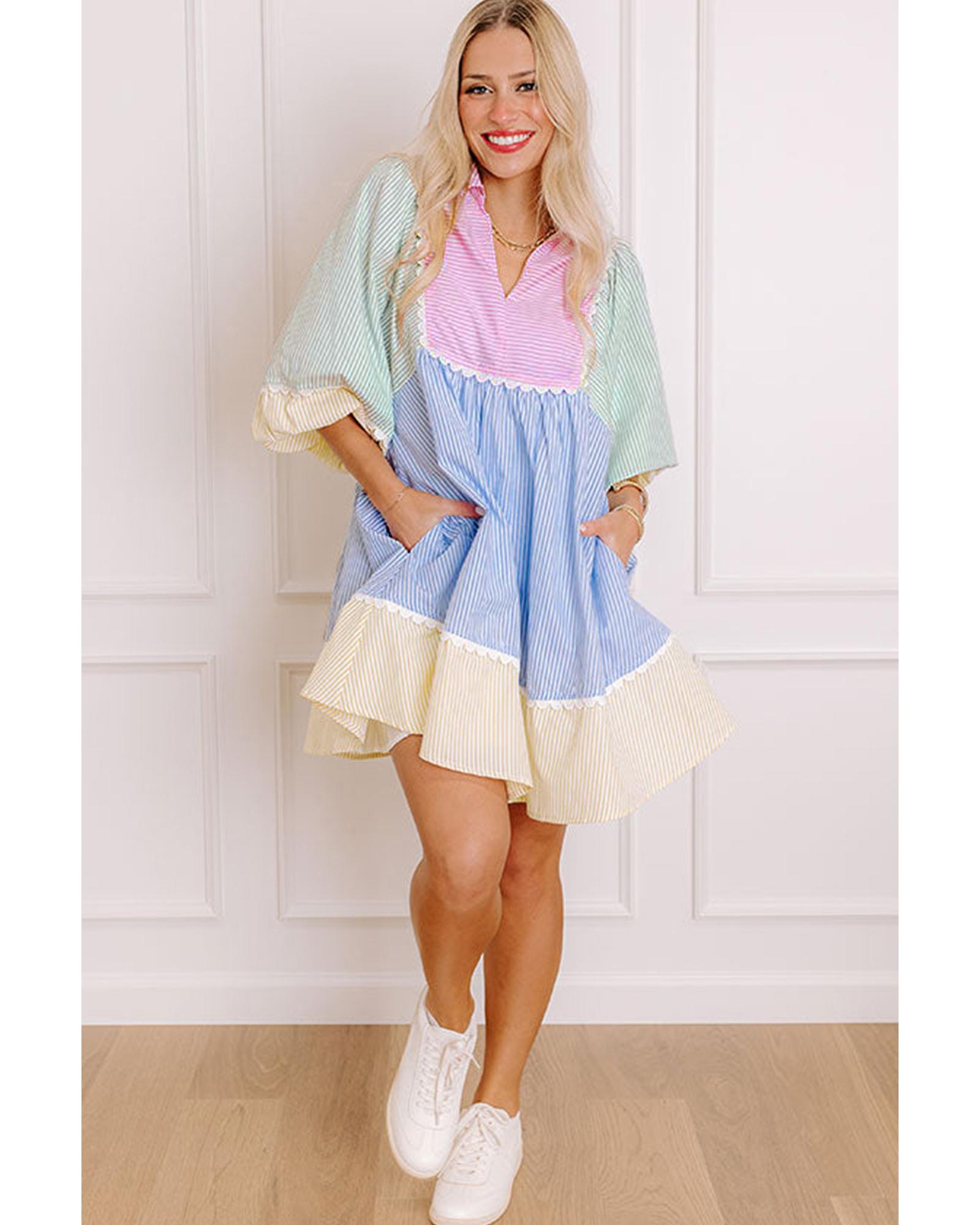 Multicolour Striped Patchwork Ric Rac Puff Sleeve Collared Mini Dress – M