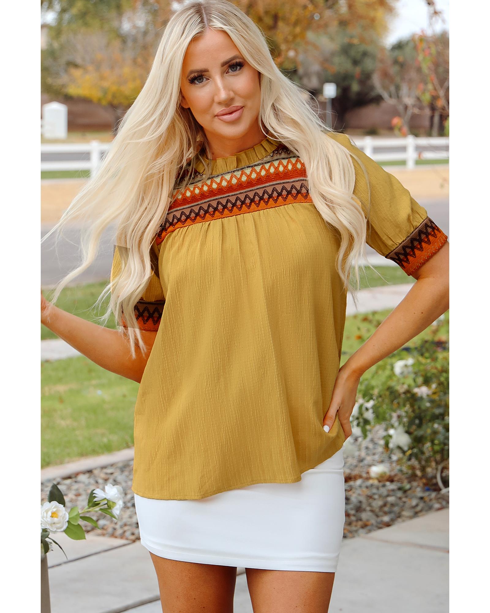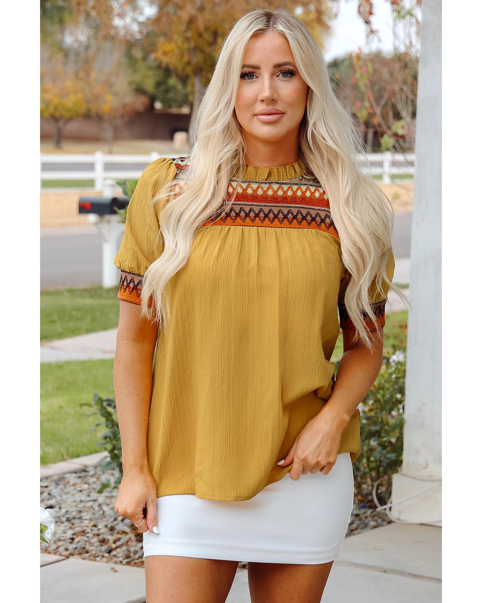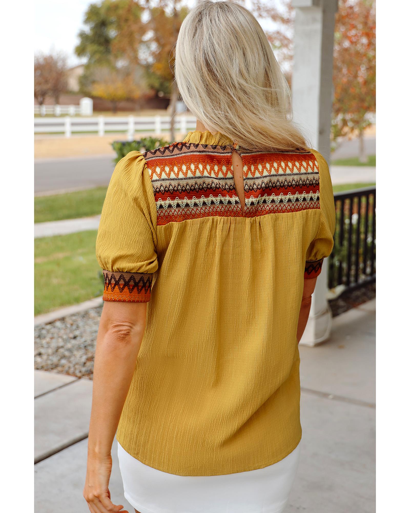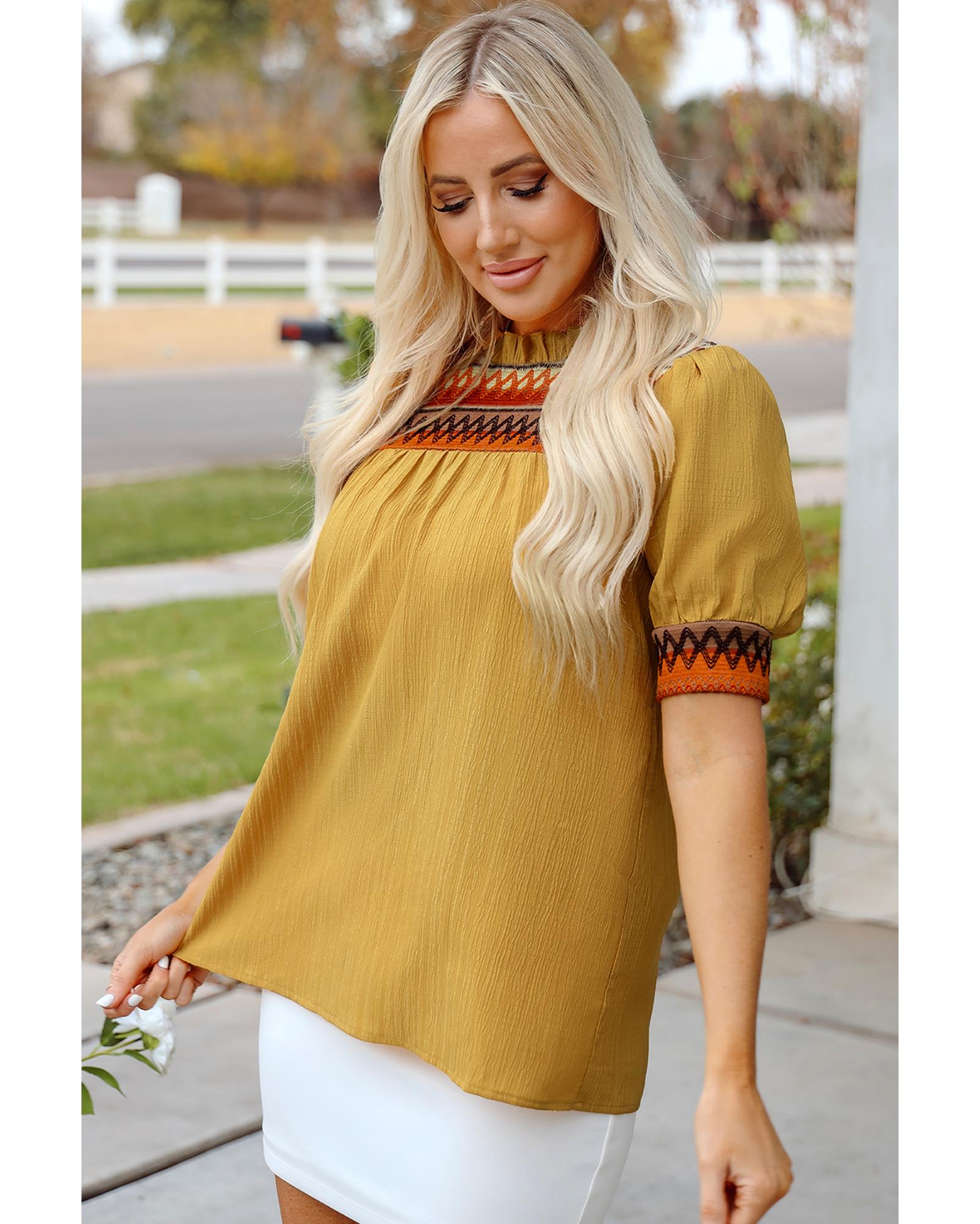 Mustard Geometric Short Puff Sleeve Frilled Collar Blouse – M