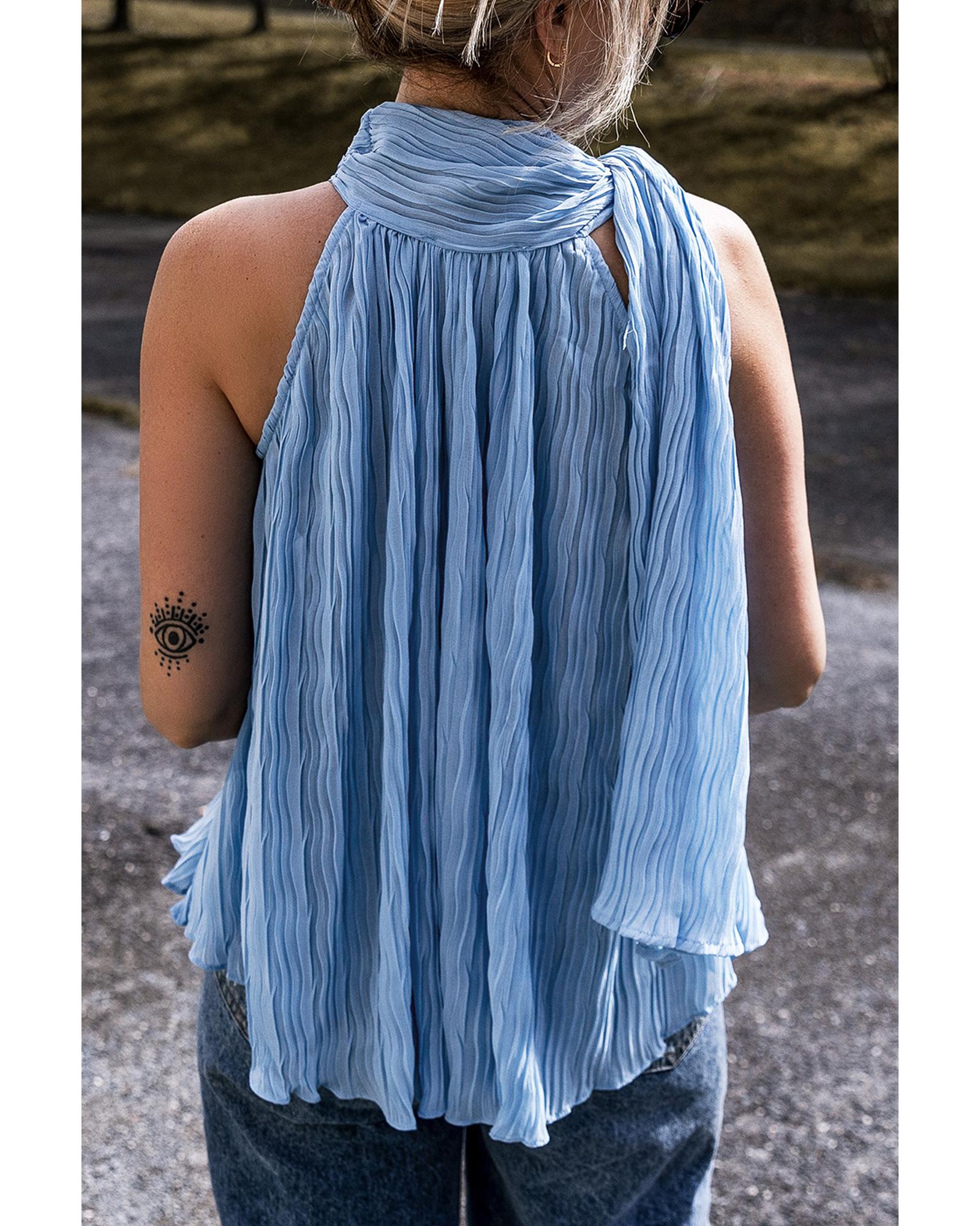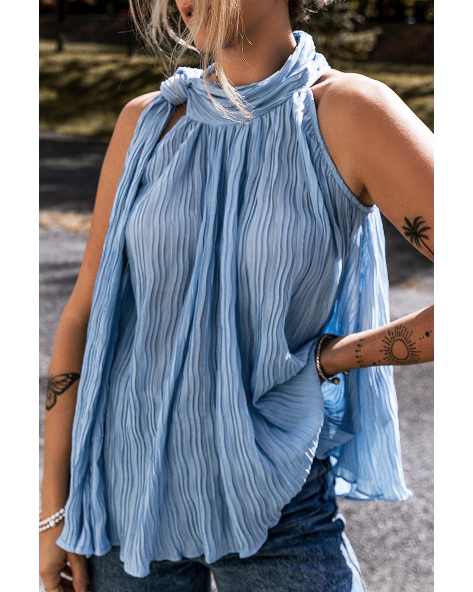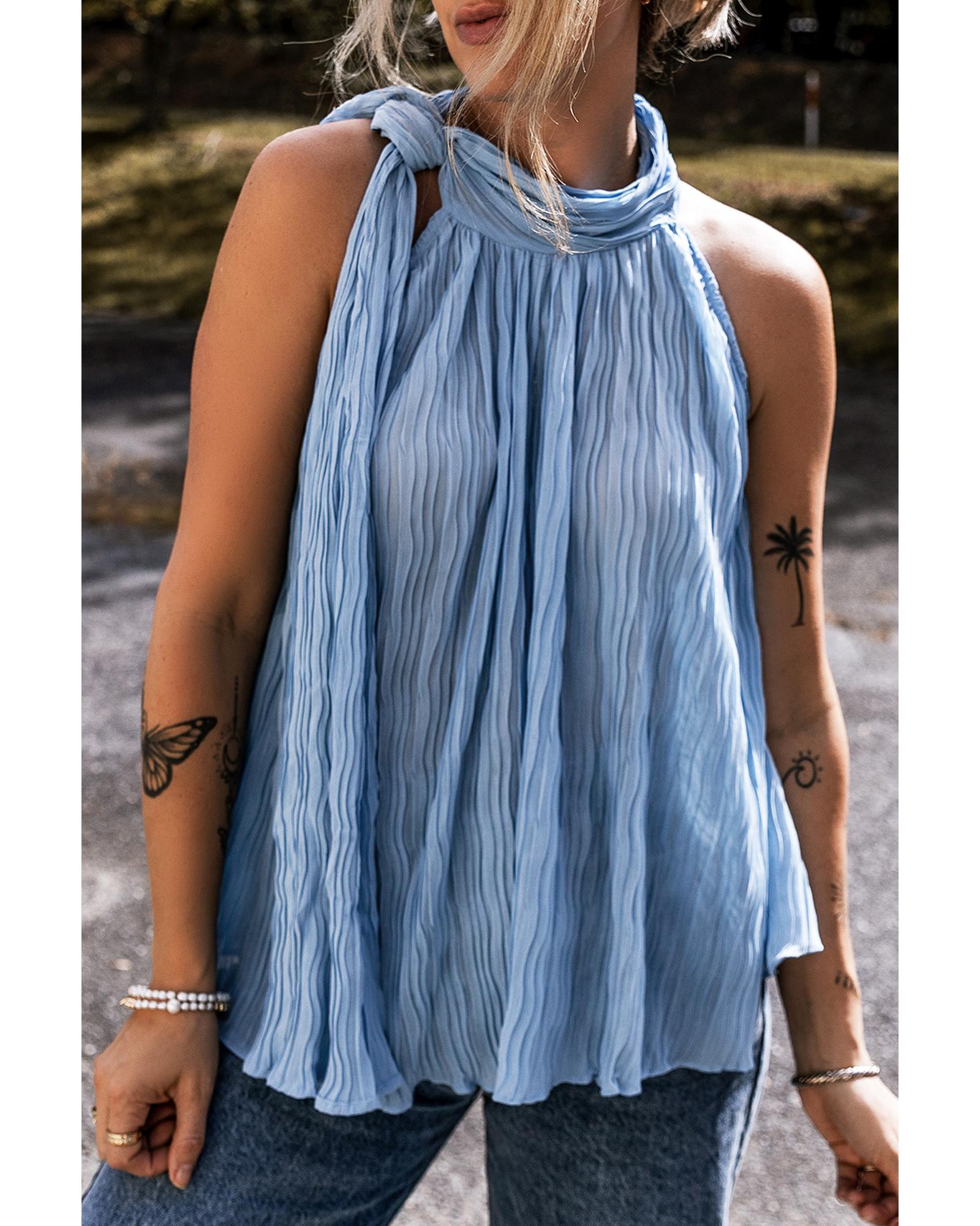 Myosotis Textured Pleated Tied Mock Neck Flowy Tank Top – M