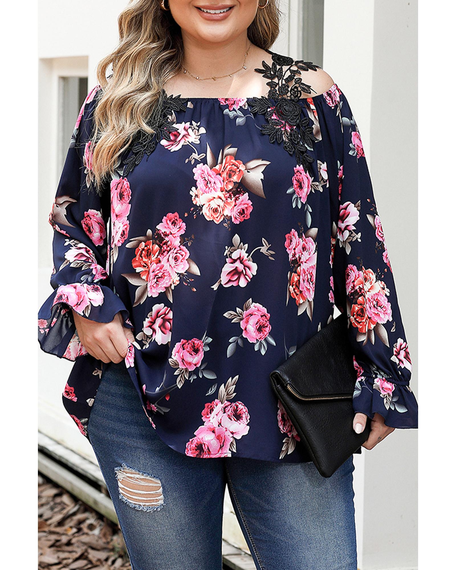 Navy Blue Plus Size Crochet Detail Cold shoulder Floral Blouse – 2X