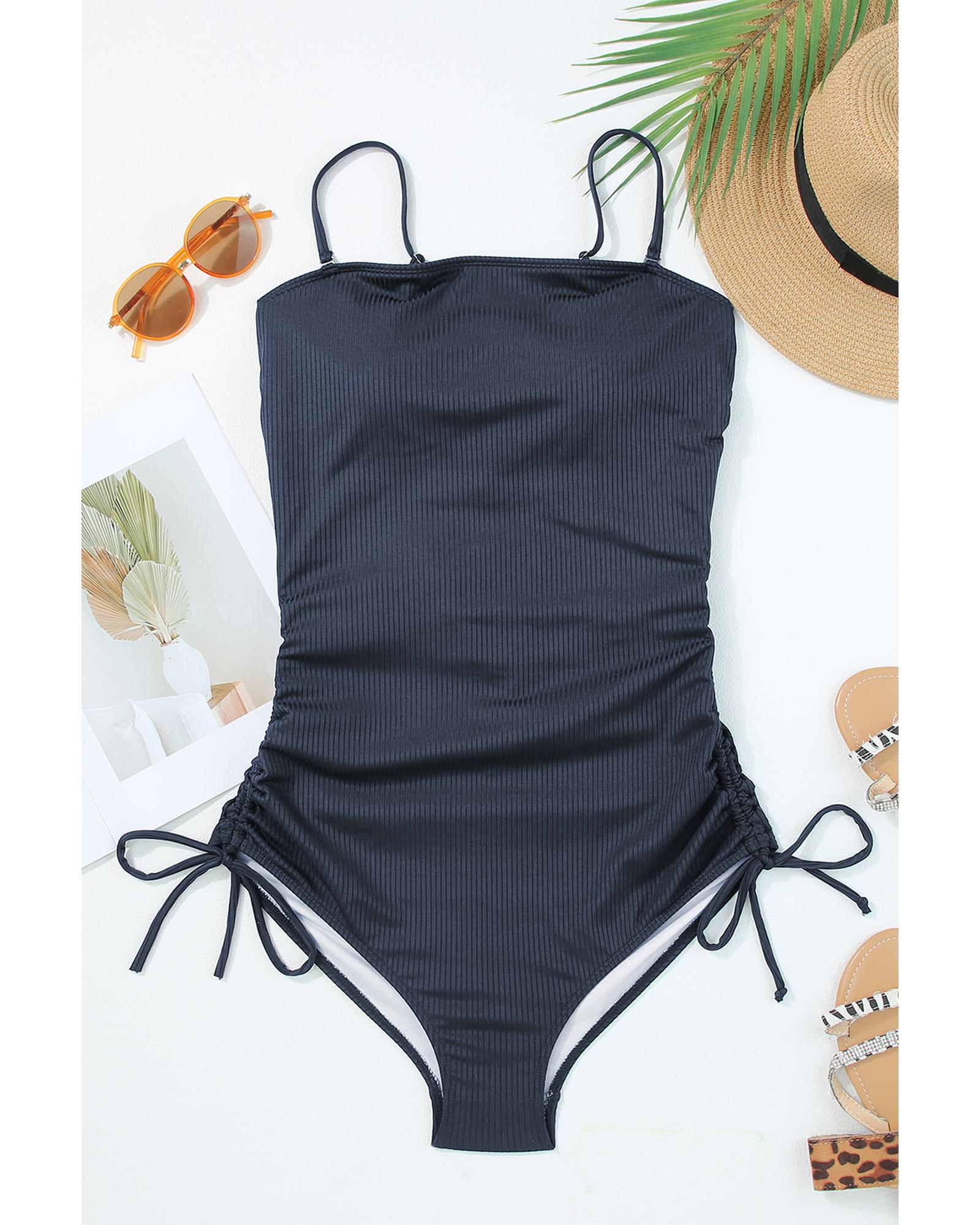 Navy Blue Ribbed Drawstring Sides Cutout One Piece Swimsuit – 2XL