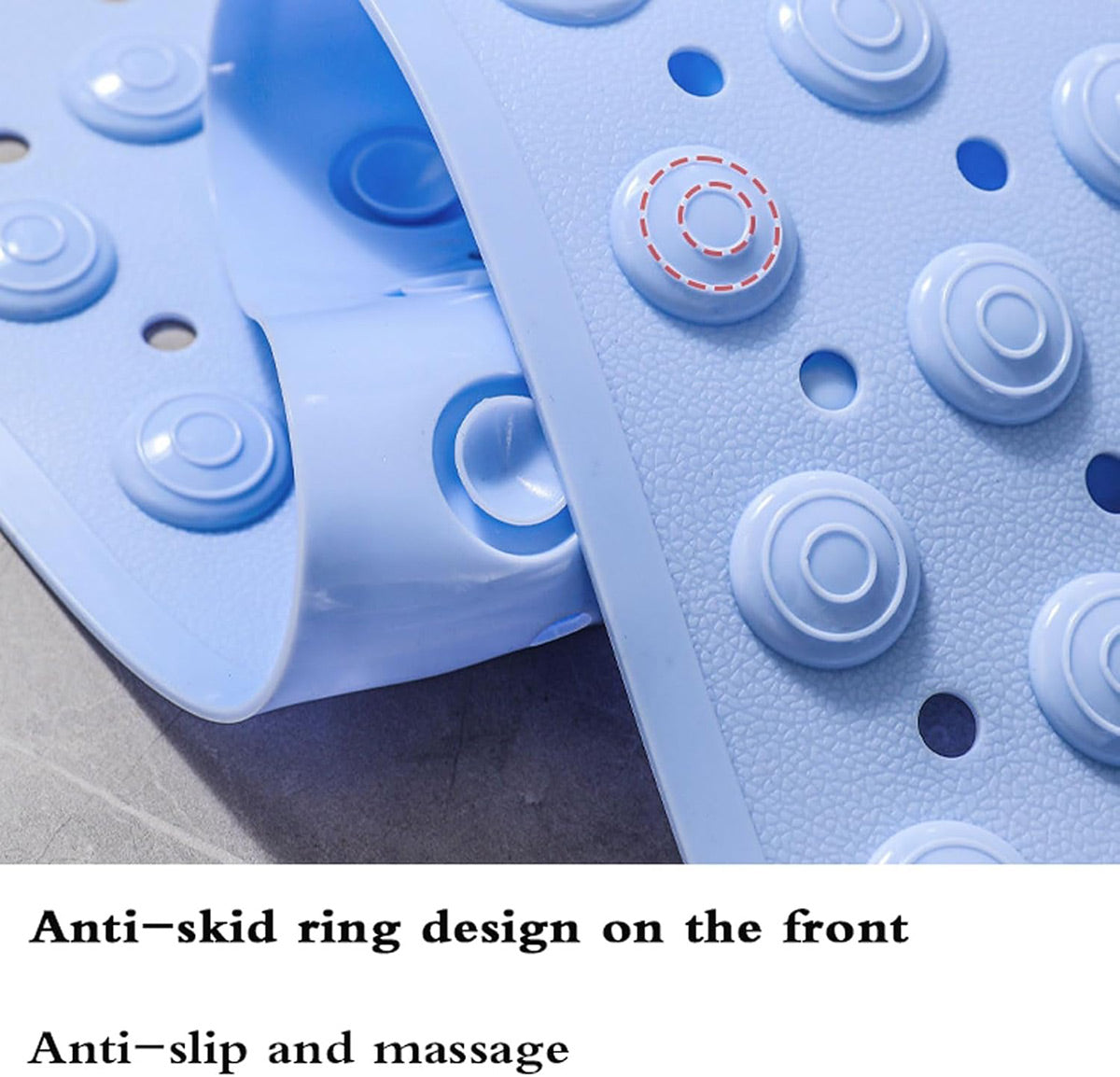 Enhance your bathroom comfort and stability with this non-slip mat made from soft and durable TPE.Designed with strong suction cups on the base and textured massage dots on the surface, it provides excellent grip and a soothing foot massage while you shower or bathe.With quick drainage holes and a generous surface area, it helps maintain hygiene and stability in wet environments such as toilets and showers.