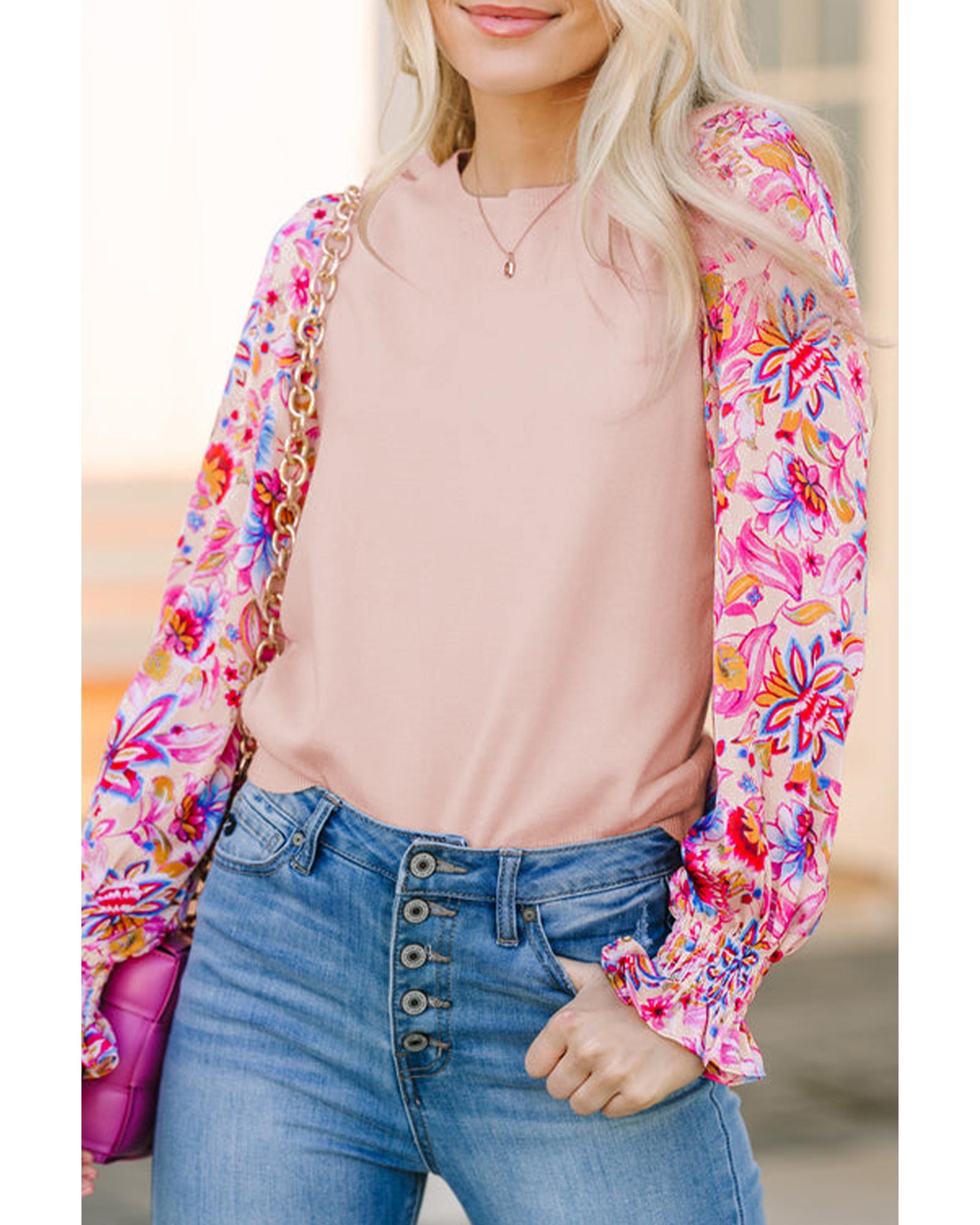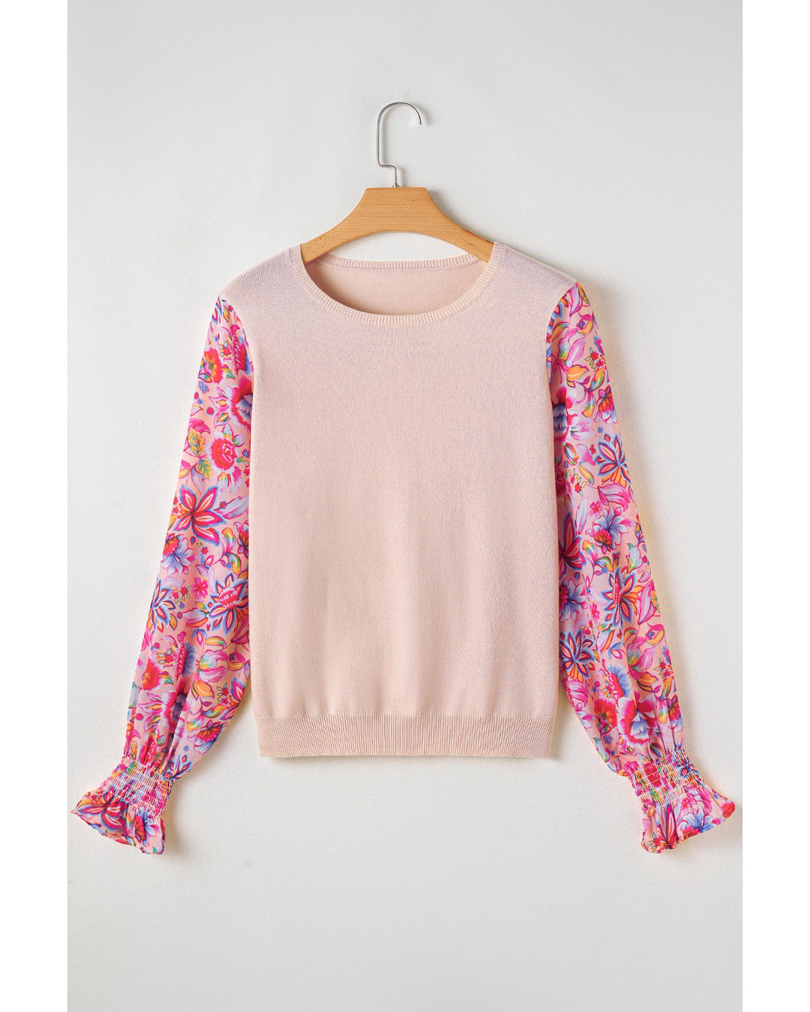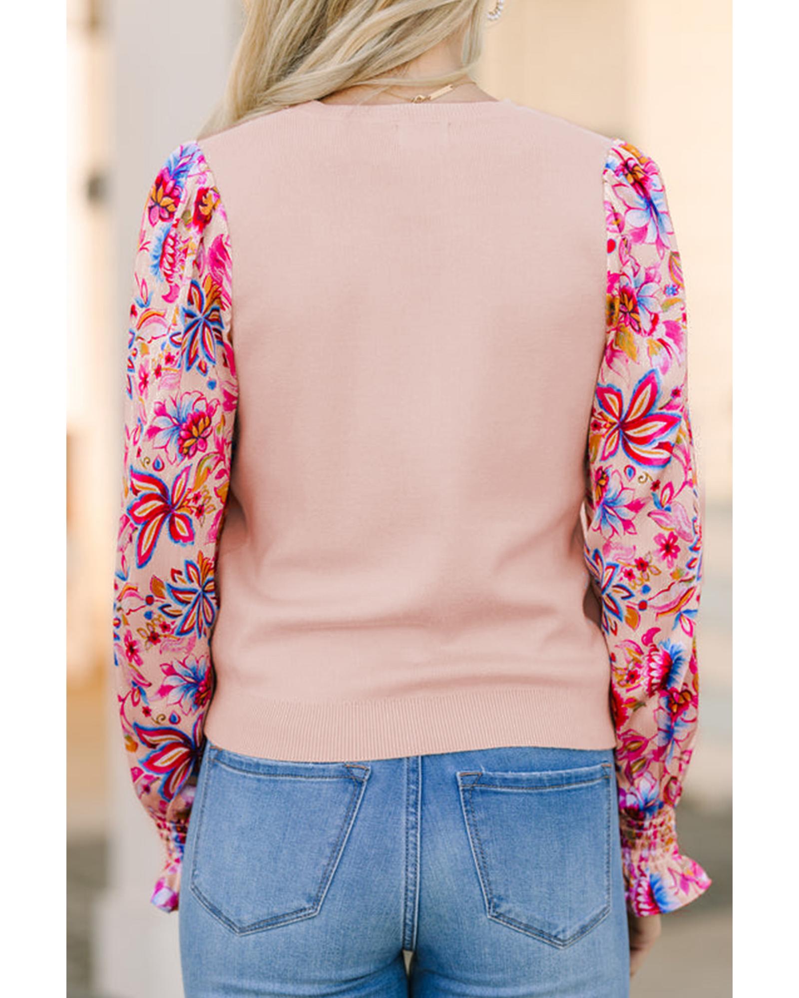 Oatmeal Floral Printed Patchwork Smocked Lantern Sleeve Knit Top – M