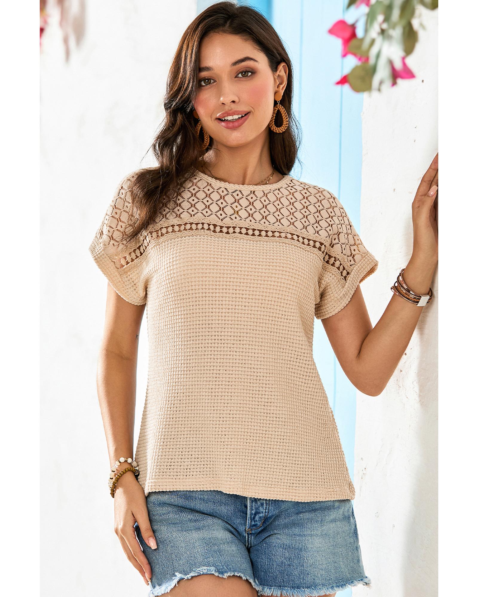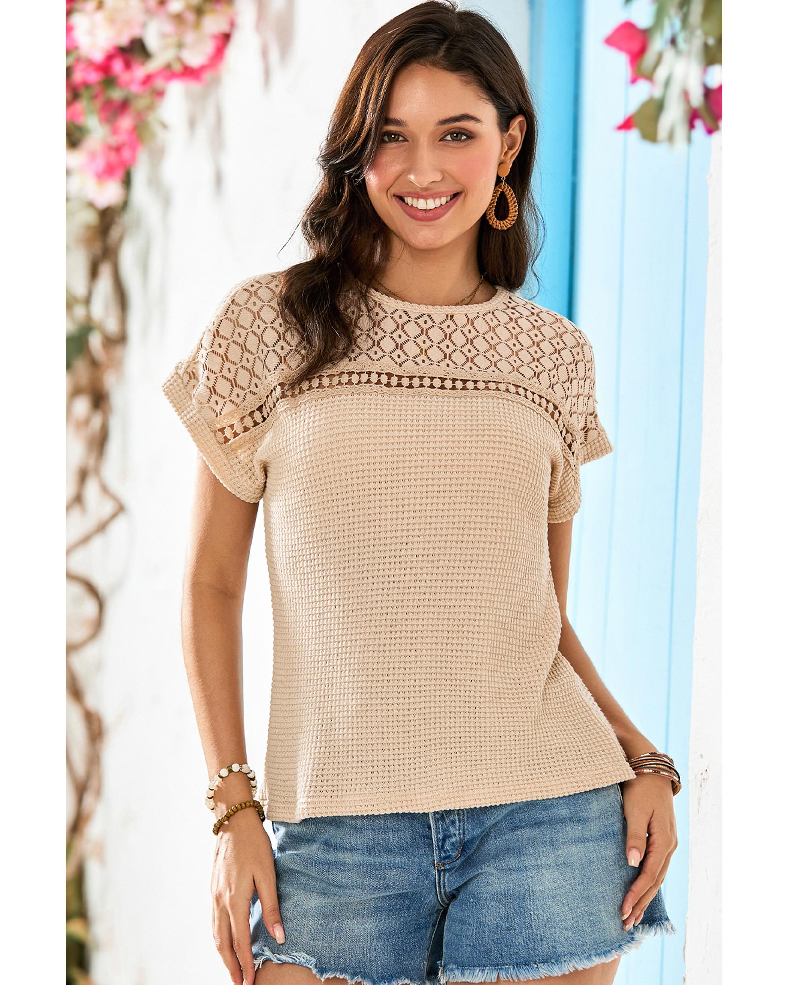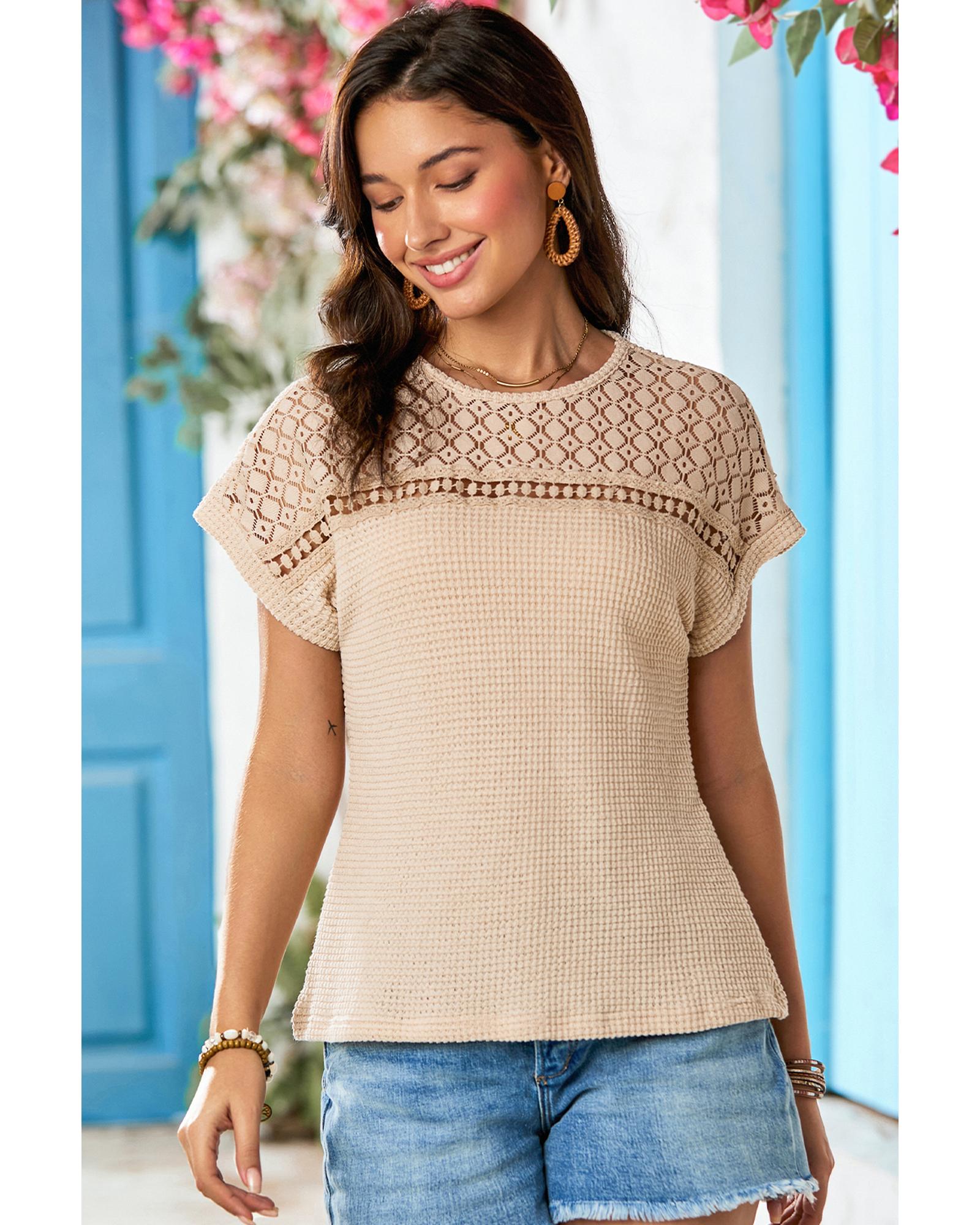 Oatmeal Lace Patchwork Waffle Short Sleeve Top – S