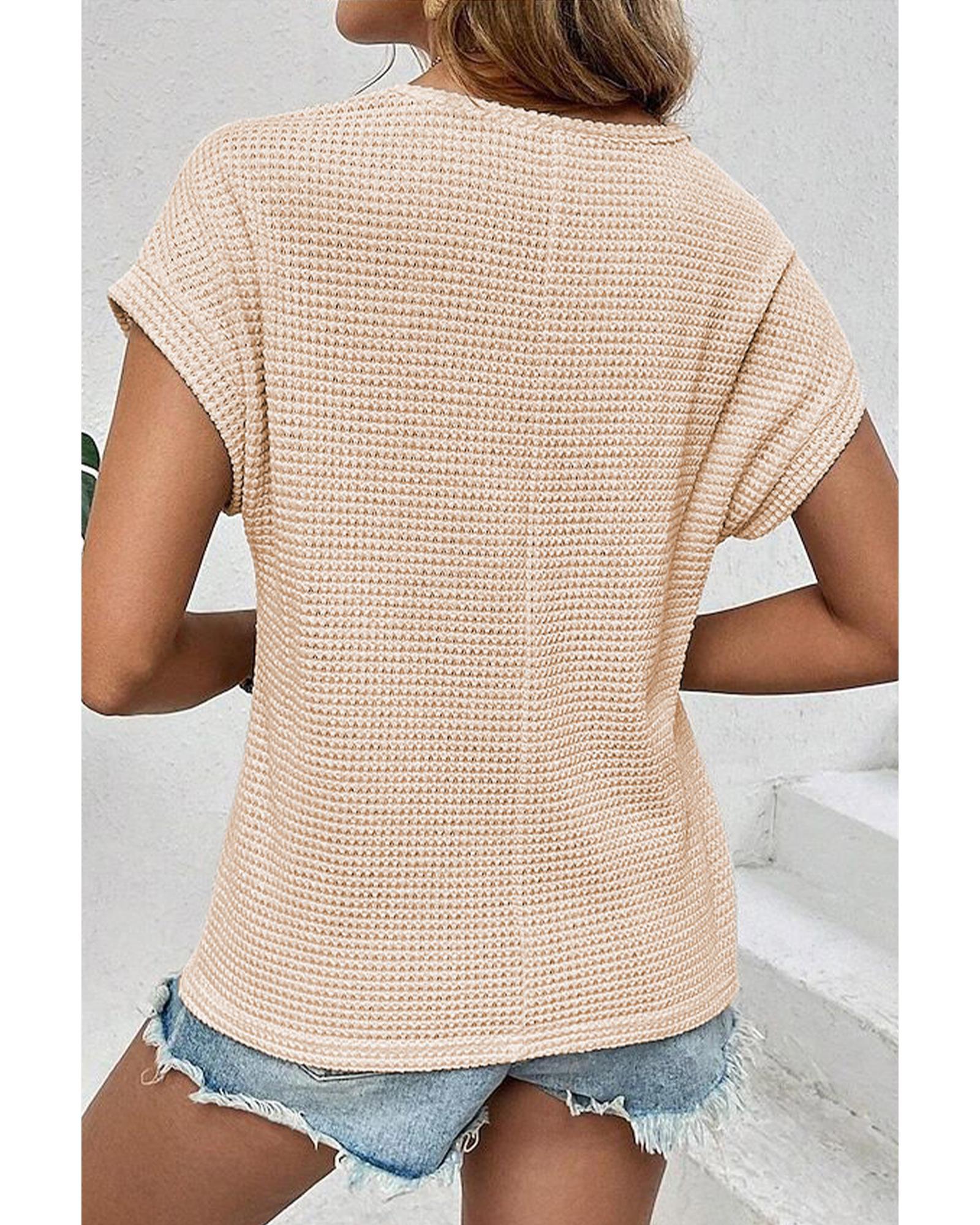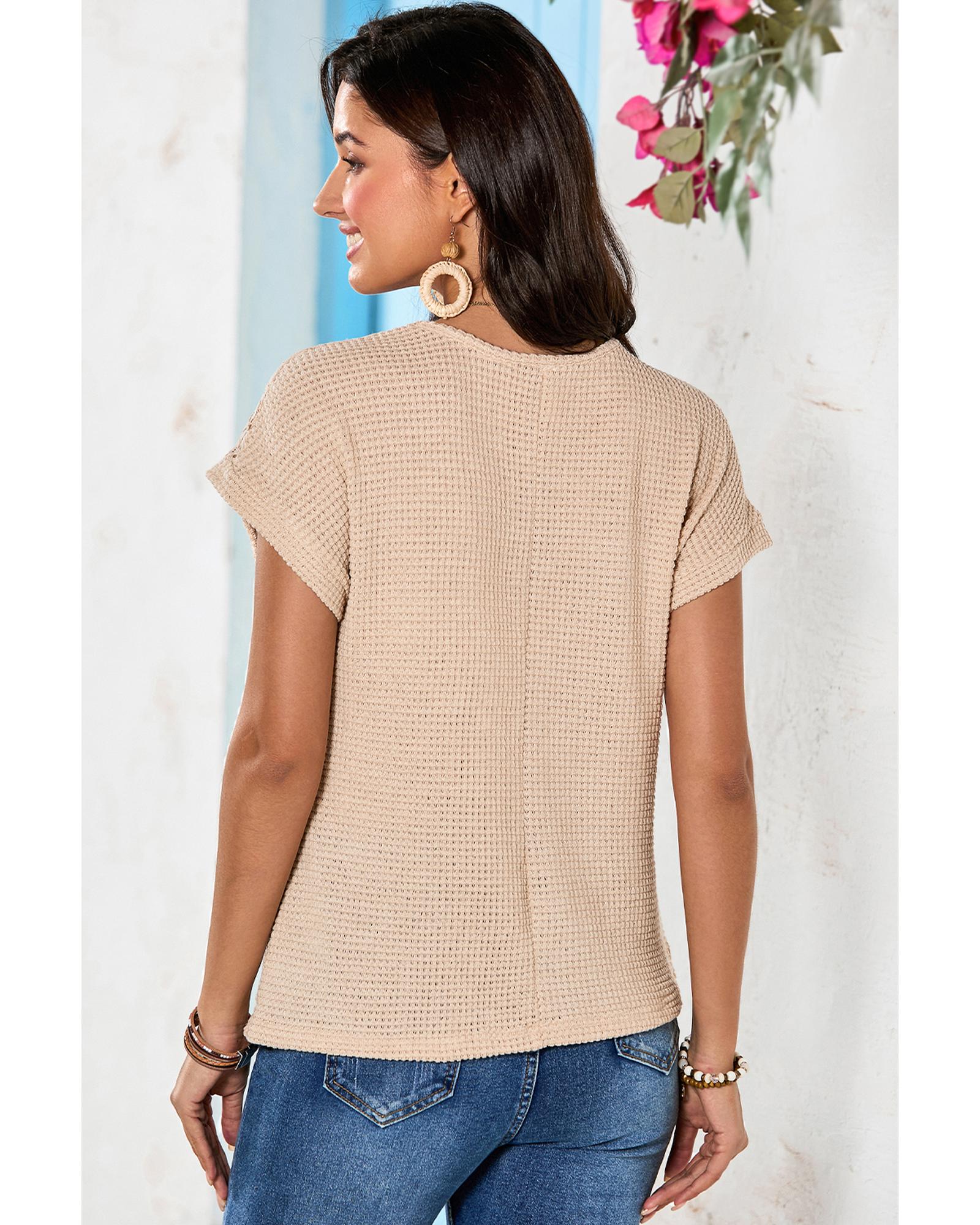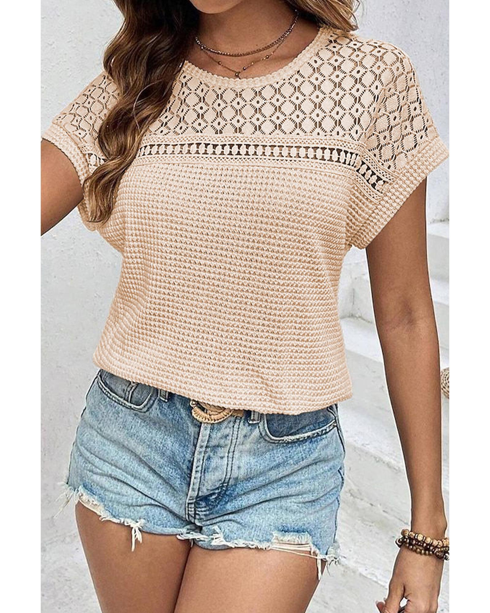 Oatmeal Lace Patchwork Waffle Short Sleeve Top – S