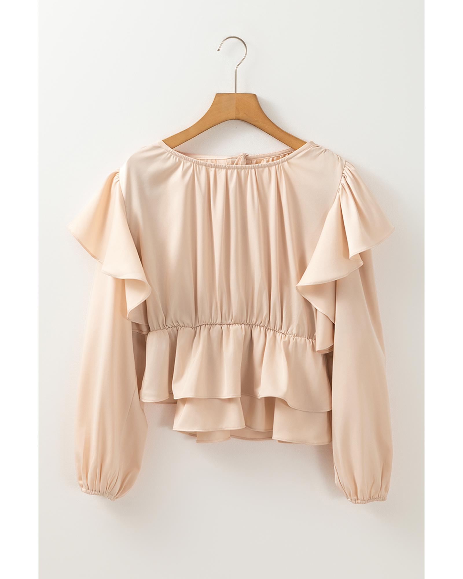 Oatmeal Lace-up Keyhole Back Ruffled Peplum Blouse – M