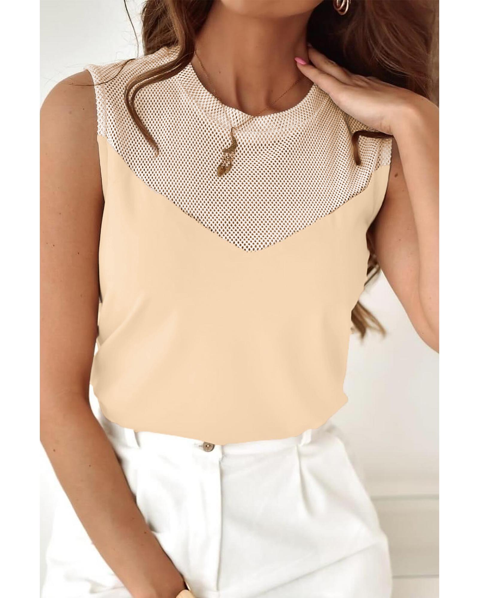 Oatmeal Solid Mesh Patchwork Crew Neck Tank Top – L
