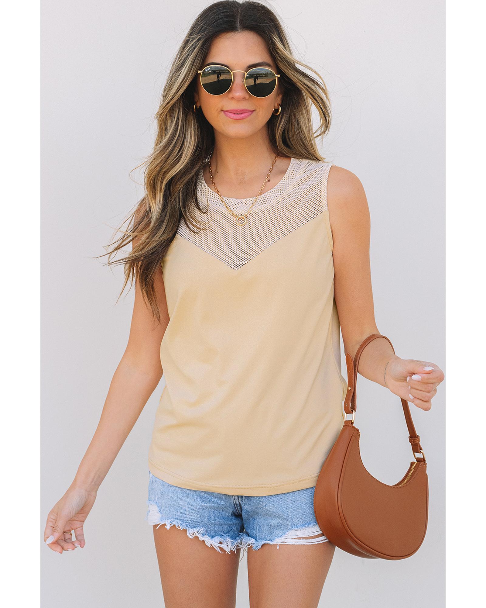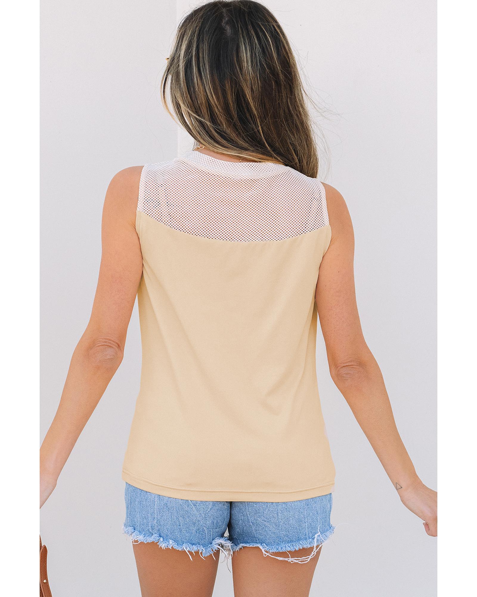 Oatmeal Solid Mesh Patchwork Crew Neck Tank Top – M