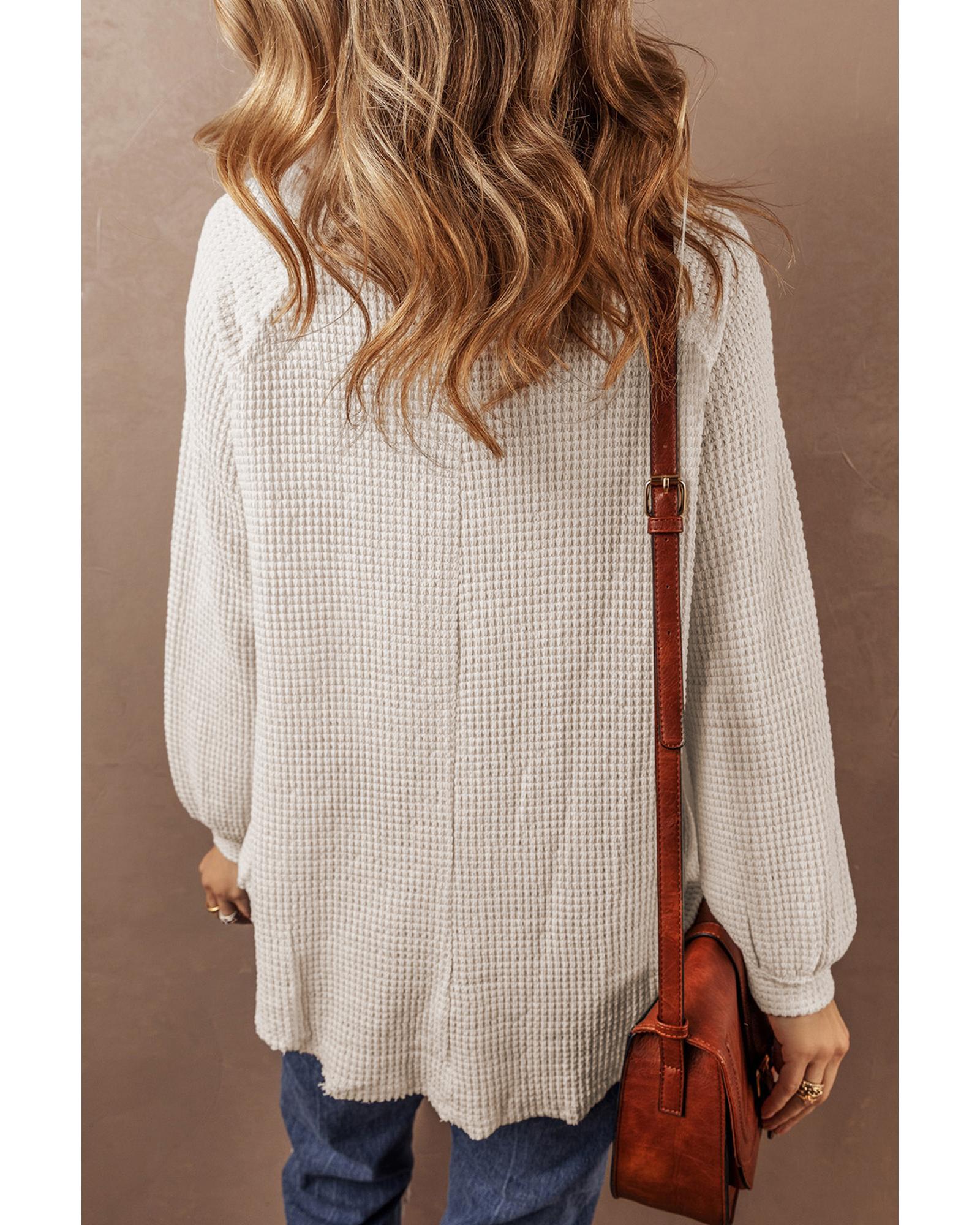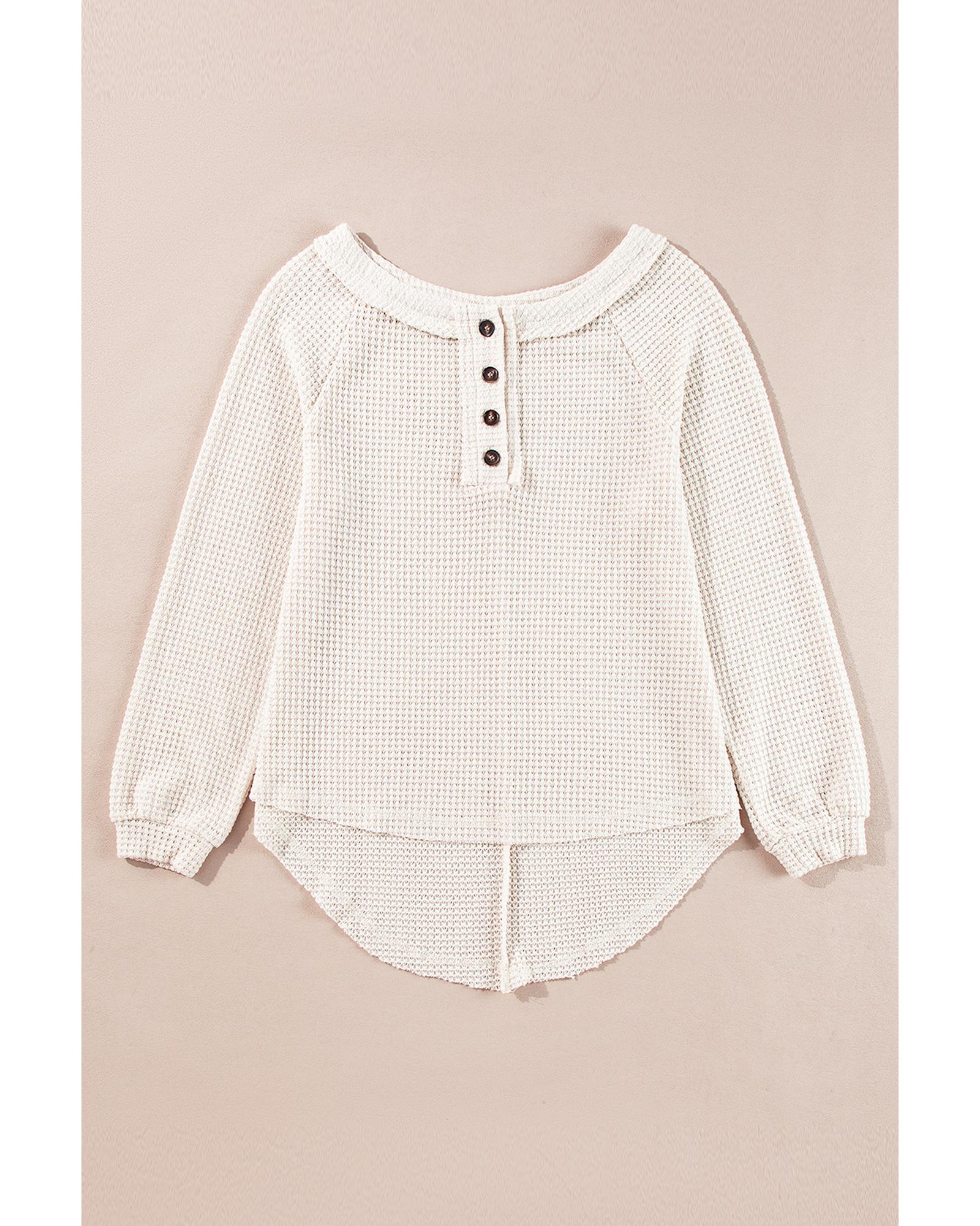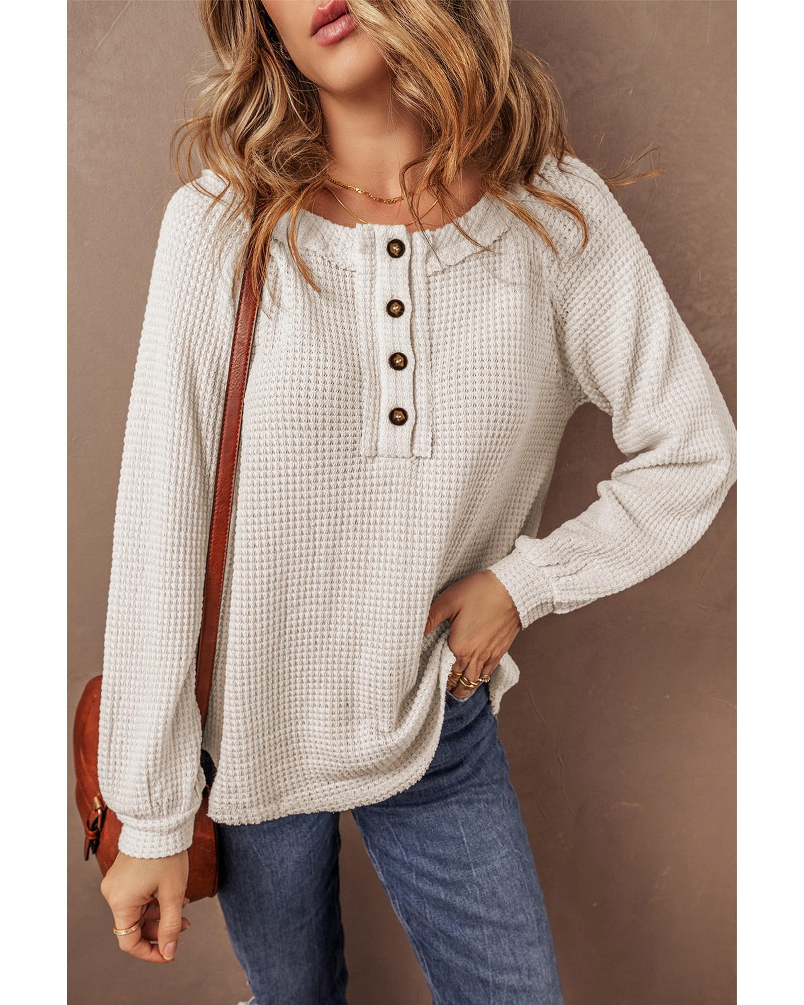 Oatmeal Waffle Knit Buttoned Front Raglan Sleeve Loose Blouse – M