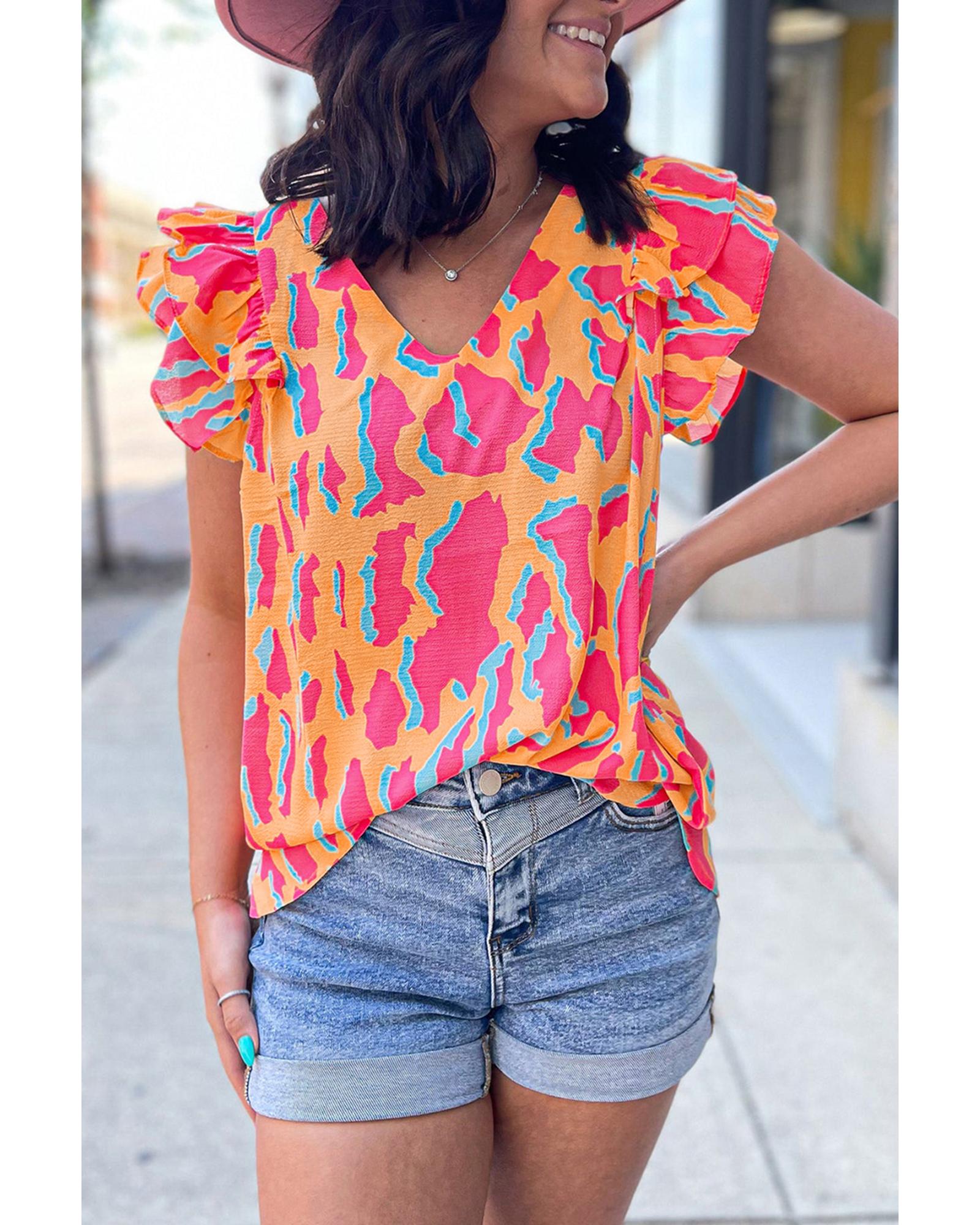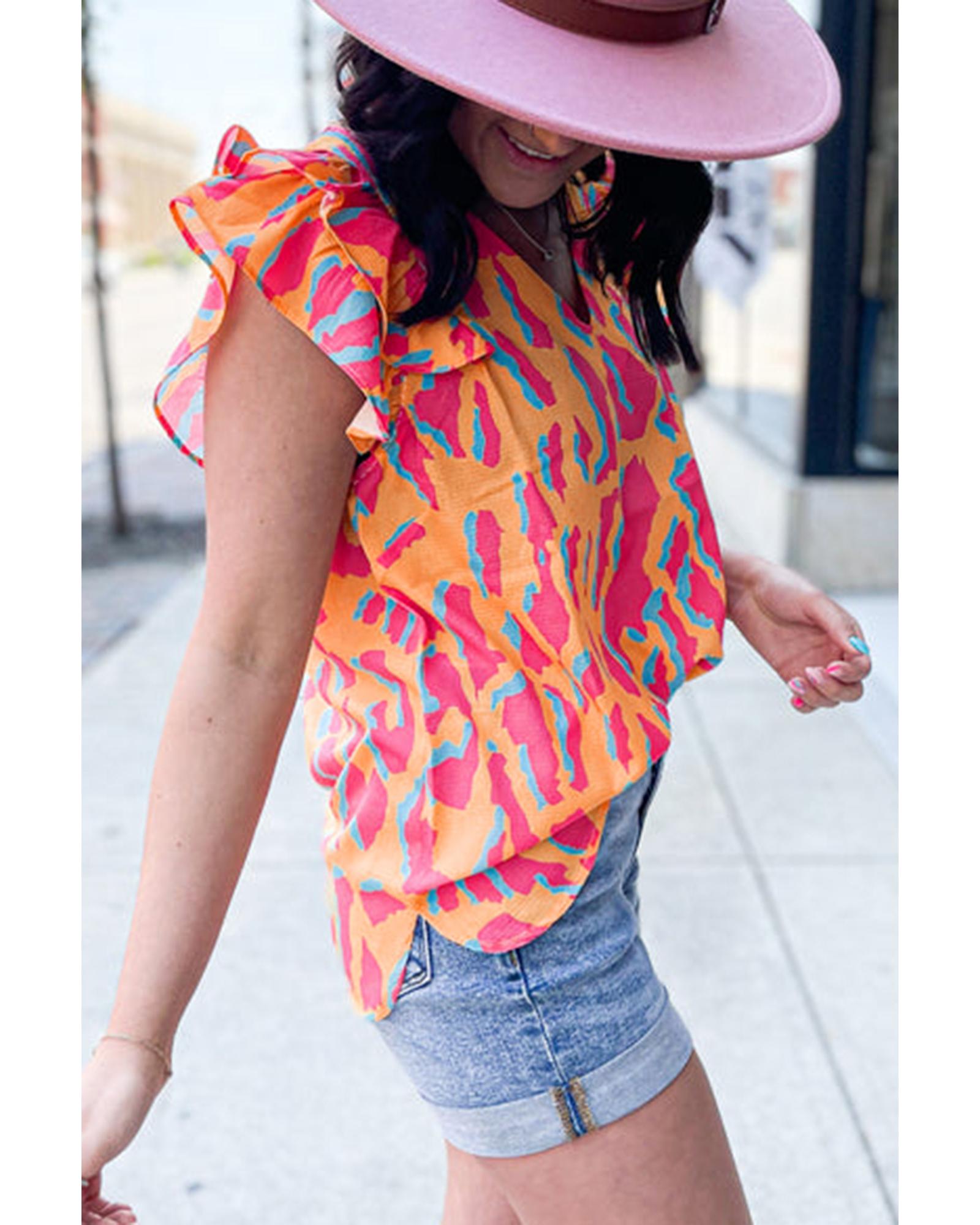 Orange Abstract Print V Neck Ruffled Sleeve Blouse – L