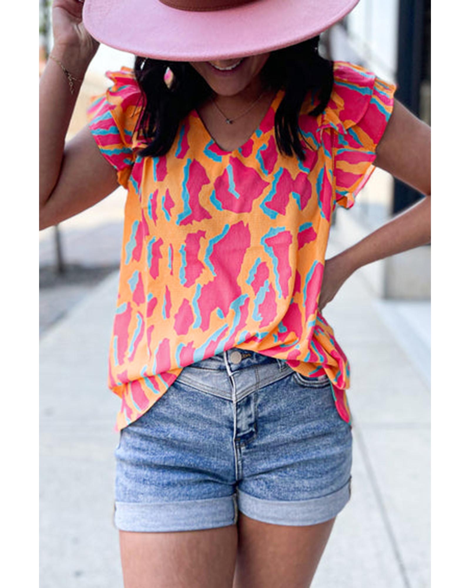 Orange Abstract Print V Neck Ruffled Sleeve Blouse – S