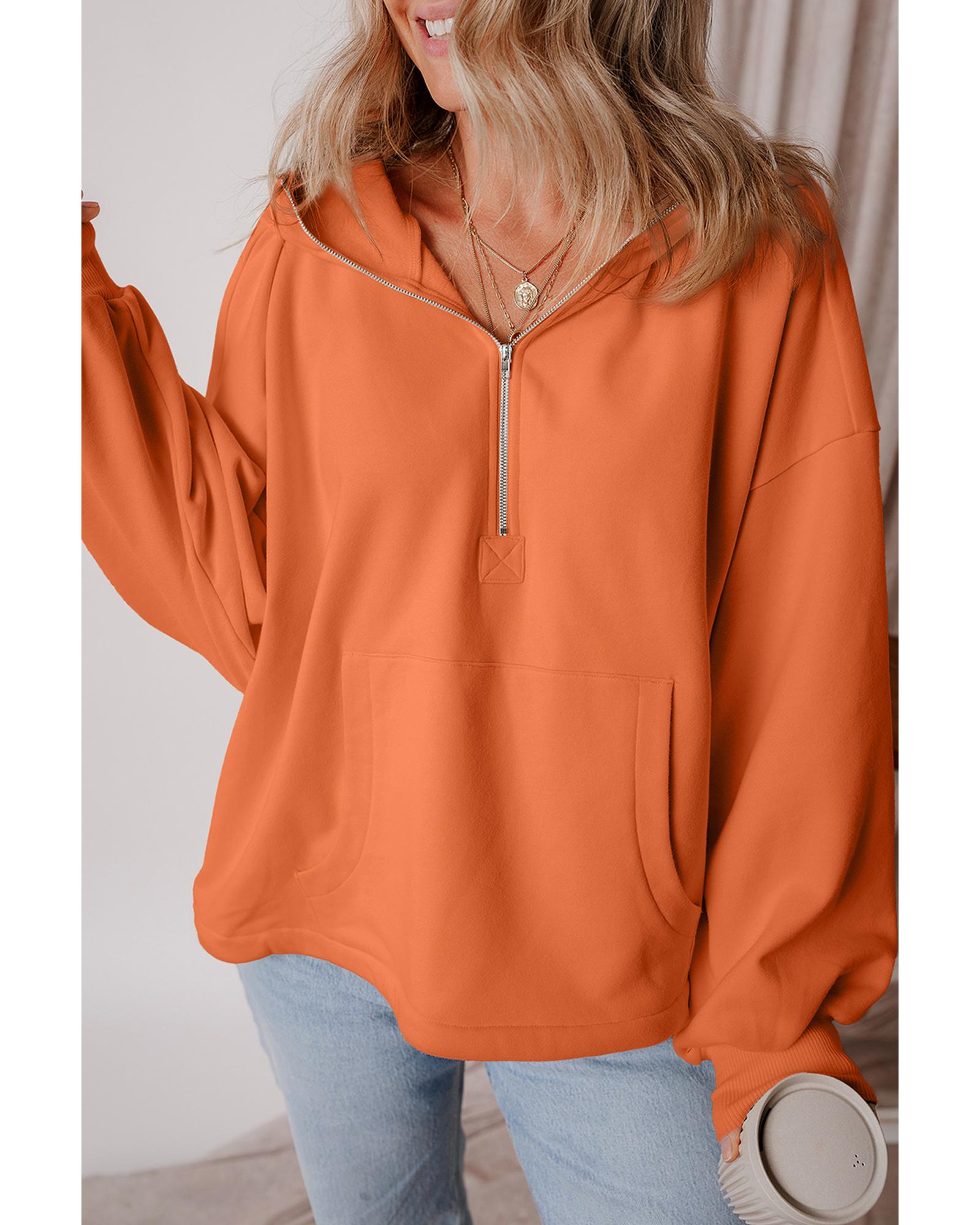 Orange Fleece Lined Half Zipper Kangaroo Pockets Loose Hoodie – S