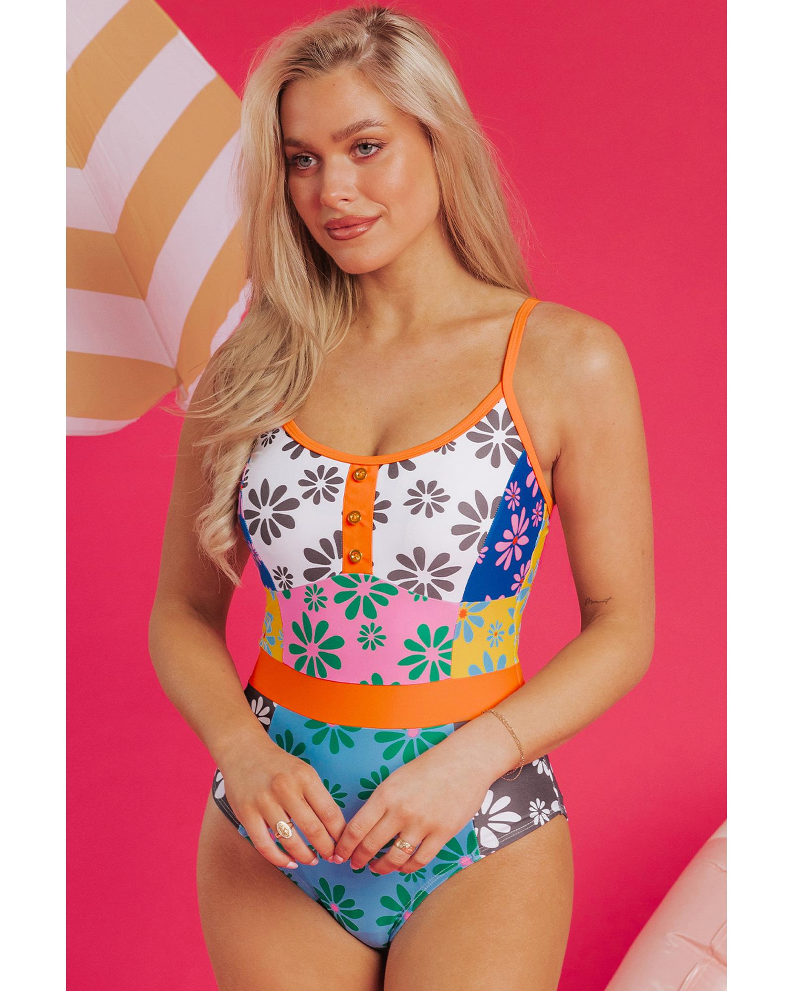 Orange Floral Colorblock Buttoned Decor Front Spaghetti Straps Teddy Swimsuit – M