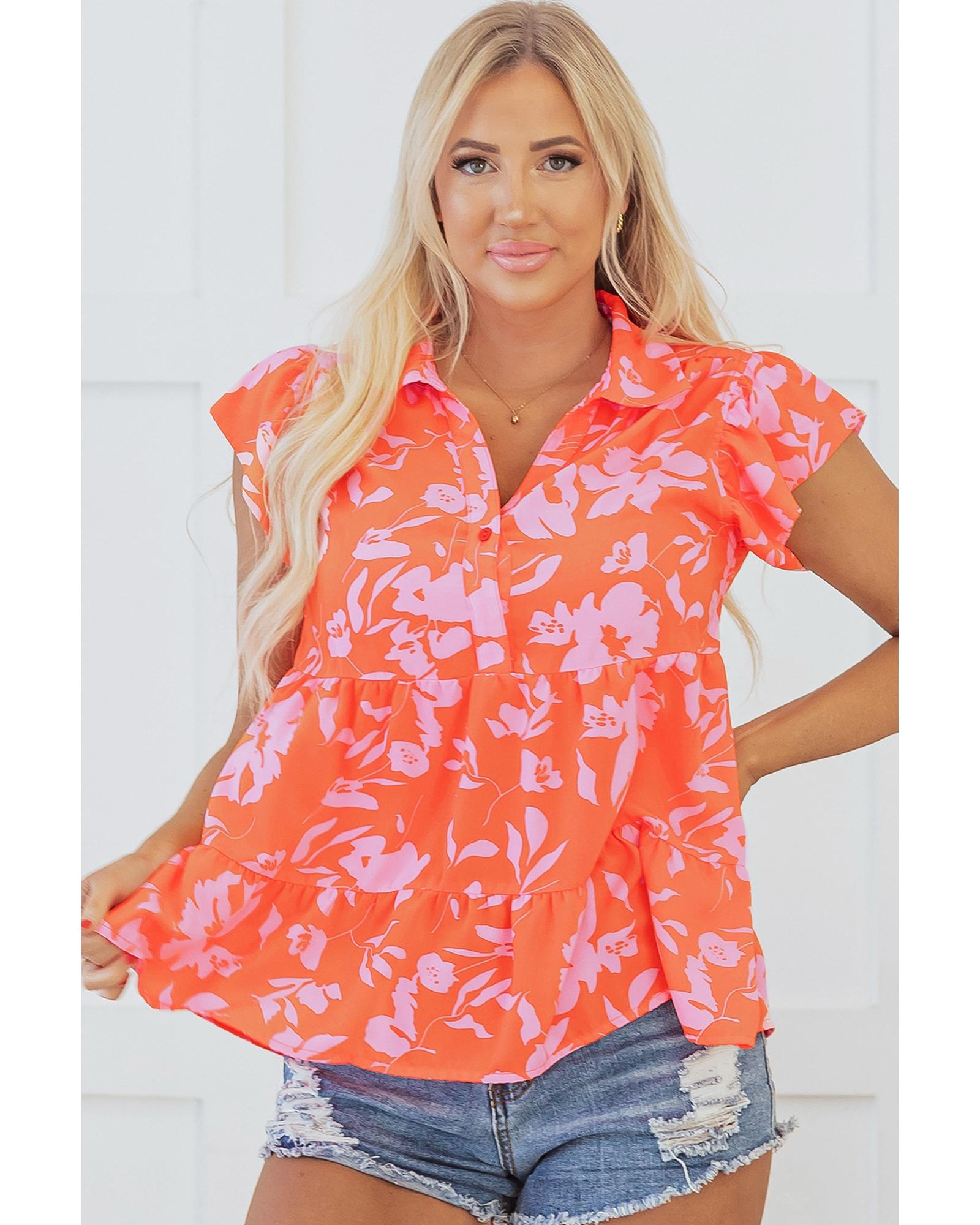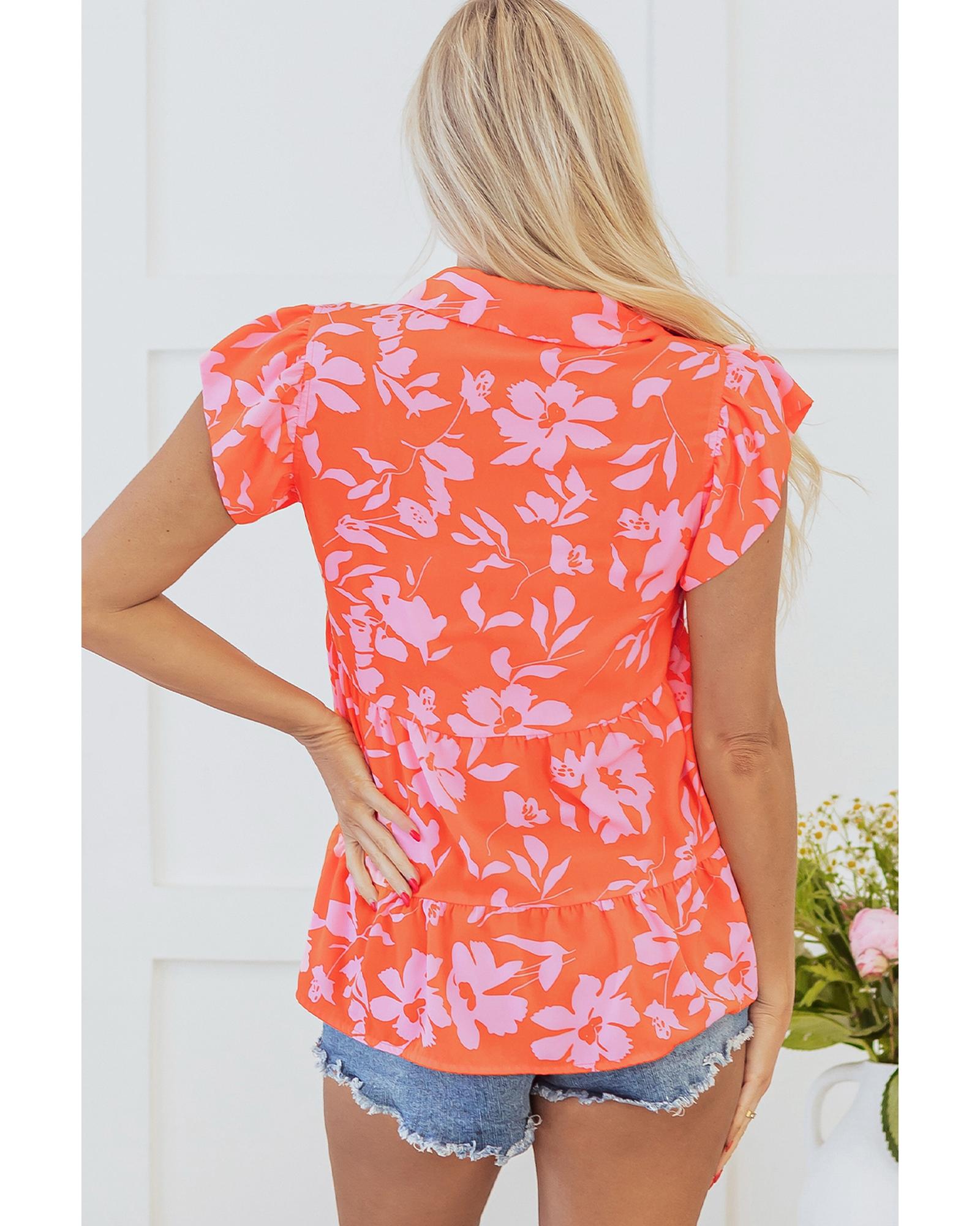 Orange Floral Print Collared Button Neckline Flutter Sleeve Blouse – S