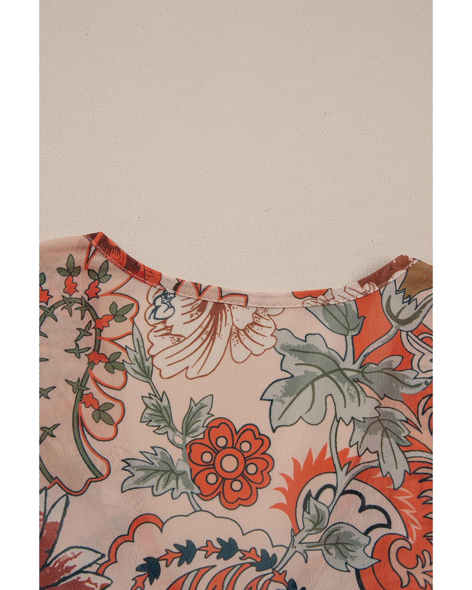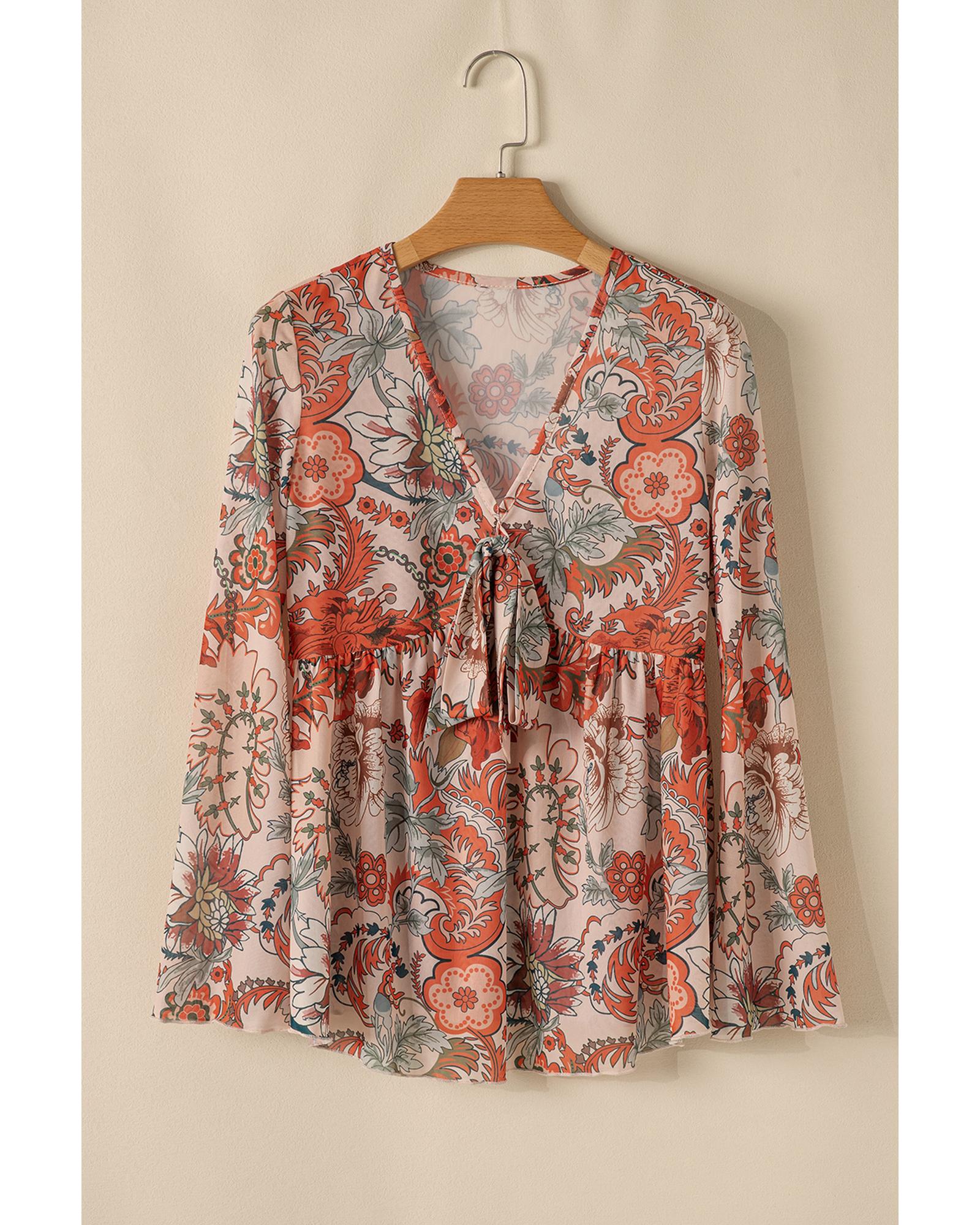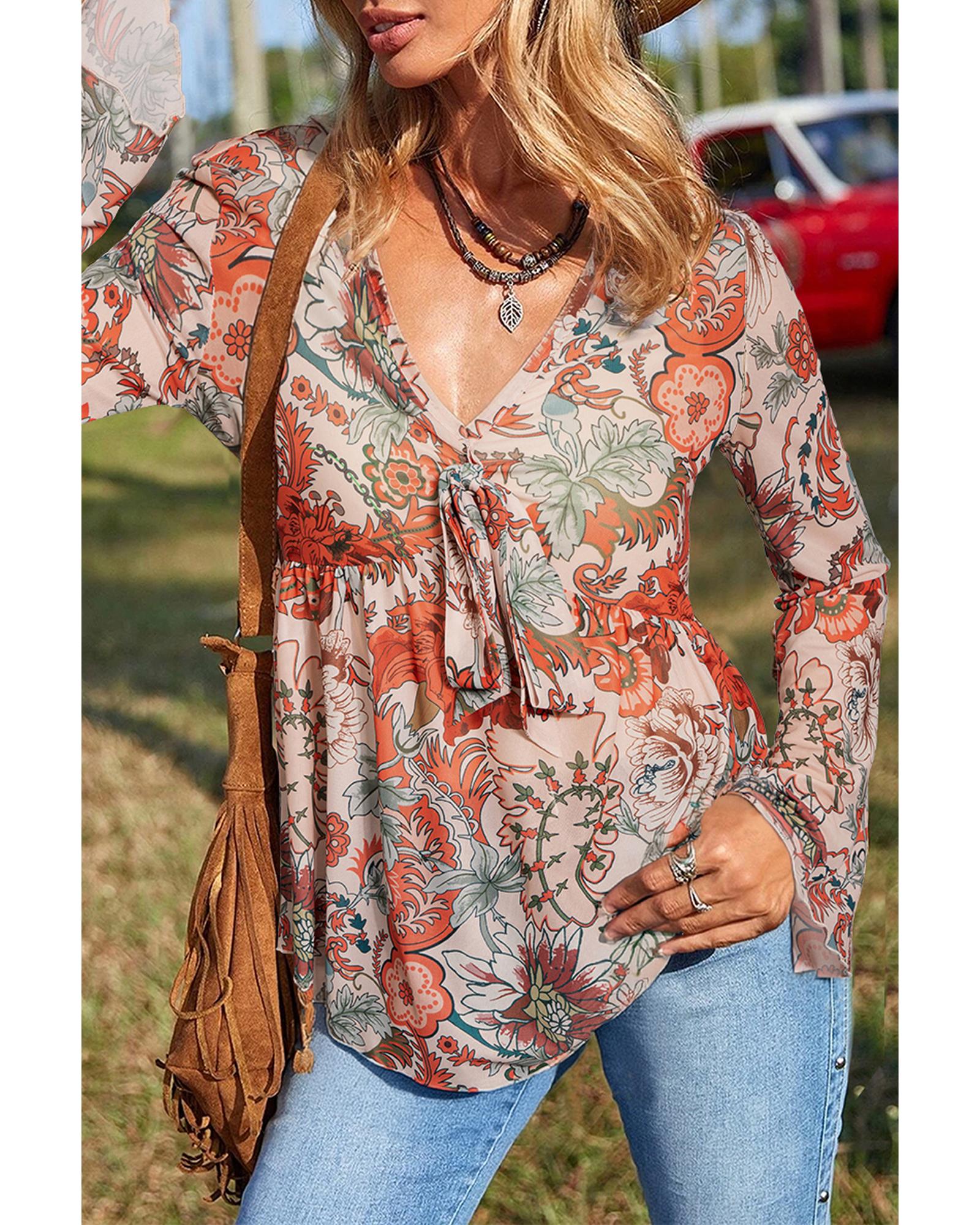 Orange Floral Print Deep V Neck Knot Bell Sleeve Blouse – M
