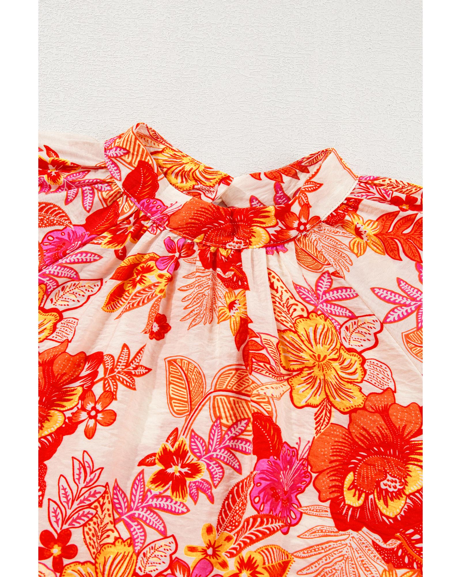 Orange Floral Print Pearl Button Keyhole Long Puff Sleeve Blouse – S