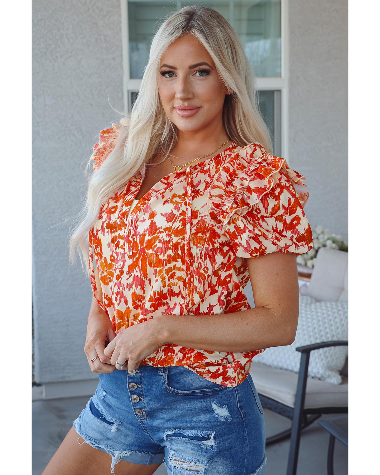 Orange Floral Print Ruffled Short Puff Sleeve Split Neck Blouse – M