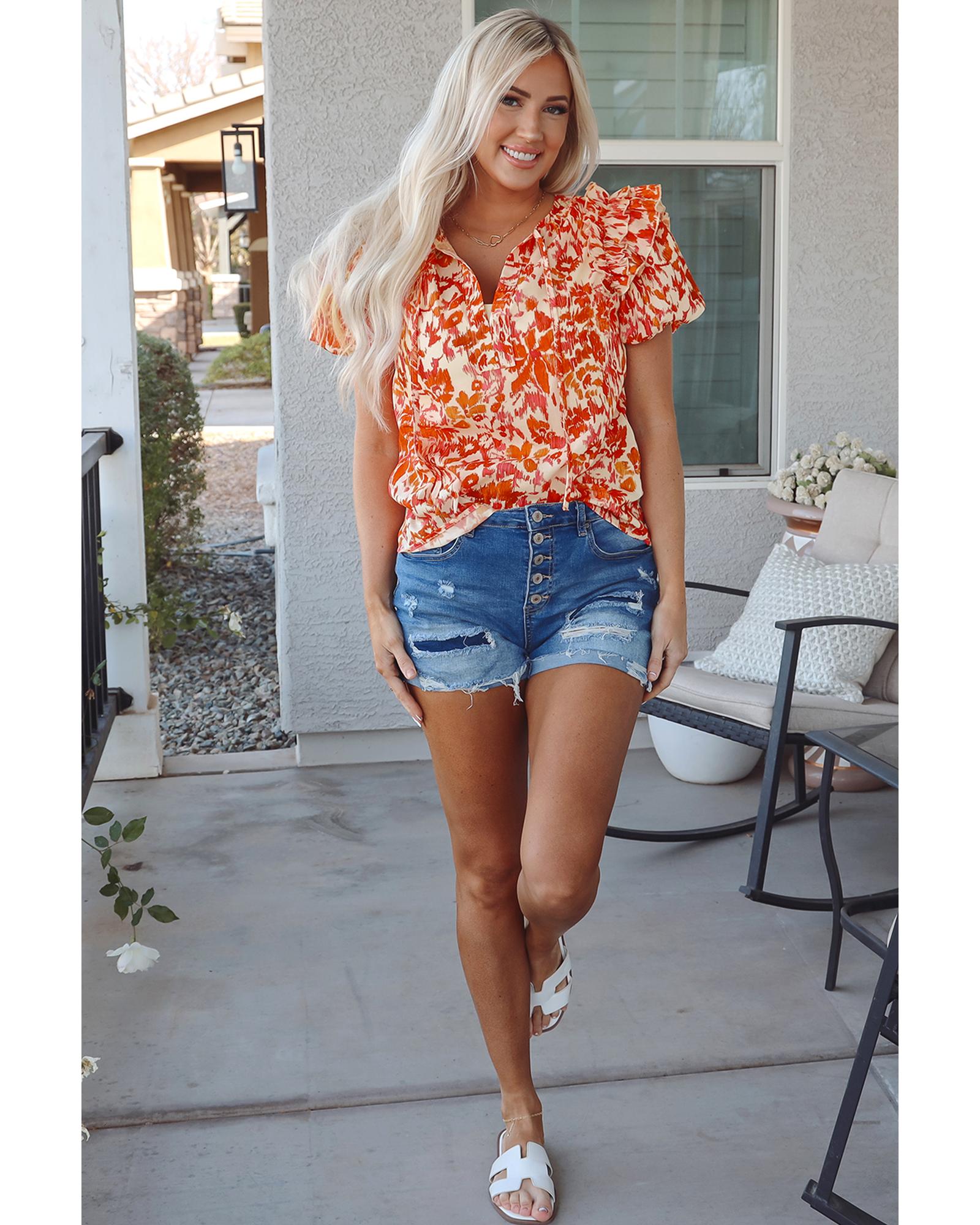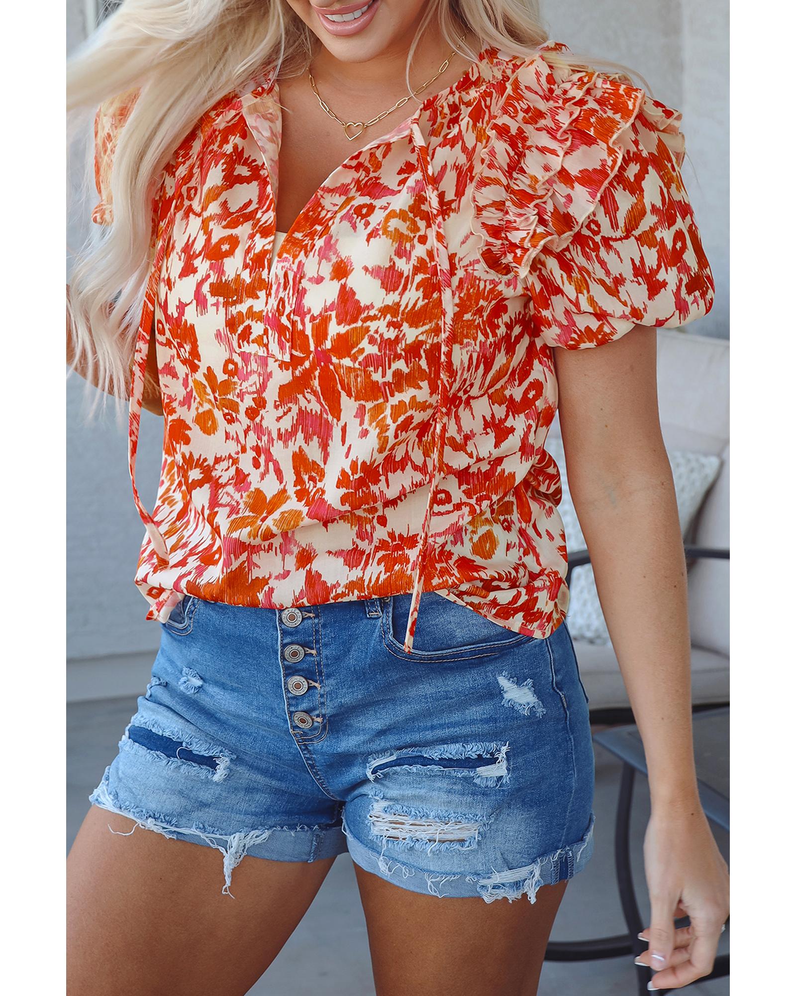 Orange Floral Print Ruffled Short Puff Sleeve Split Neck Blouse – XL