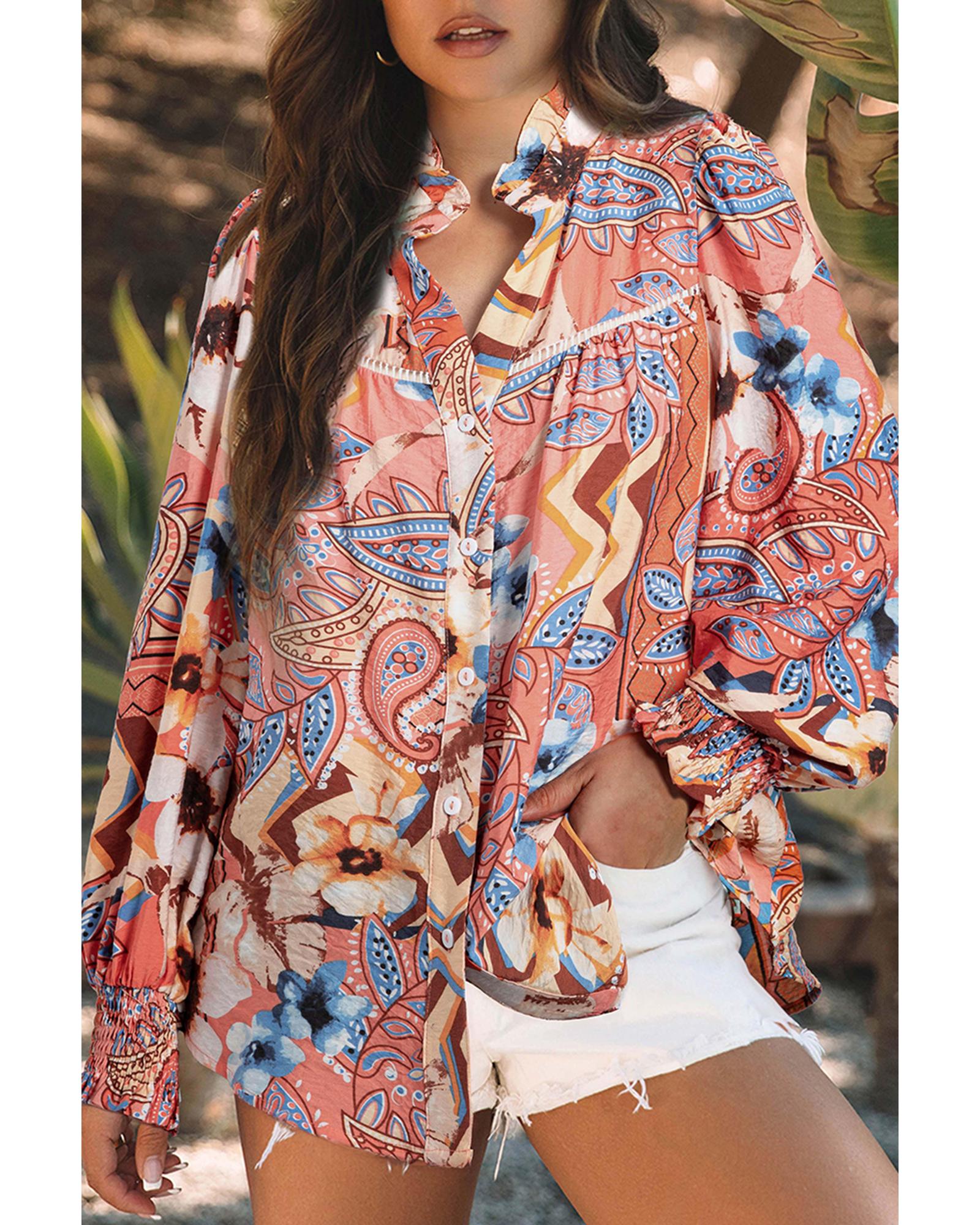 Orange Floral Print Shirred Cuff Buttoned Loose Shirt - S