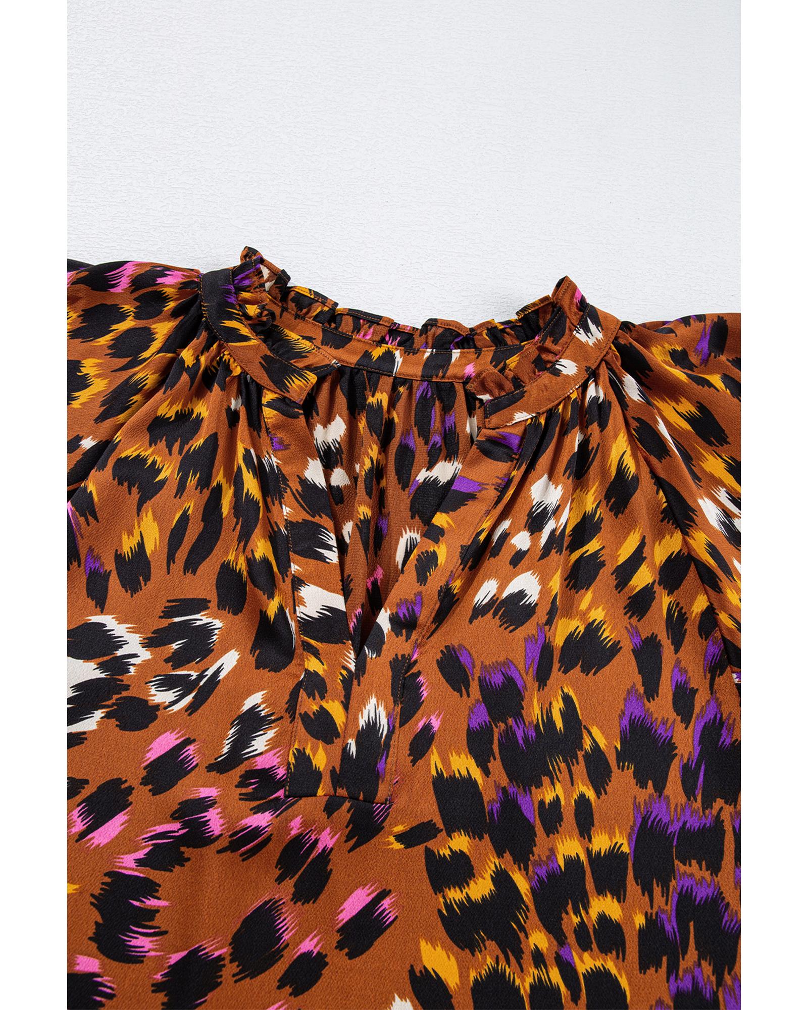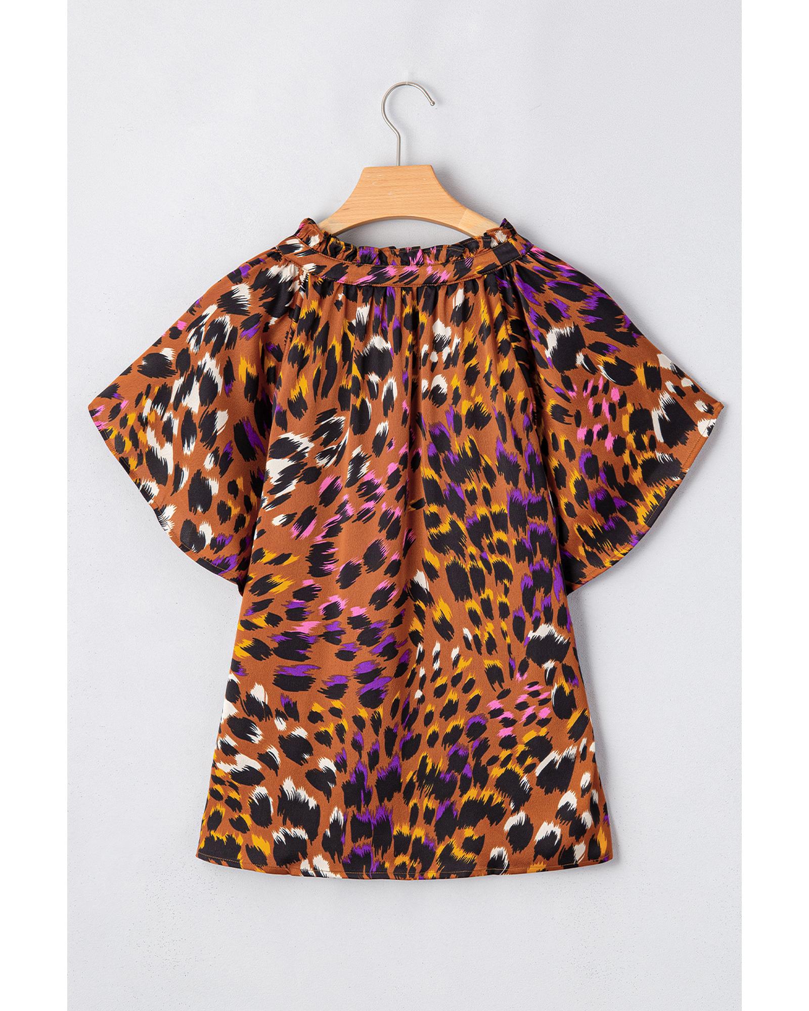 Orange Leopard Printed Draped Short Sleeve Slit V Neck Blouse – M