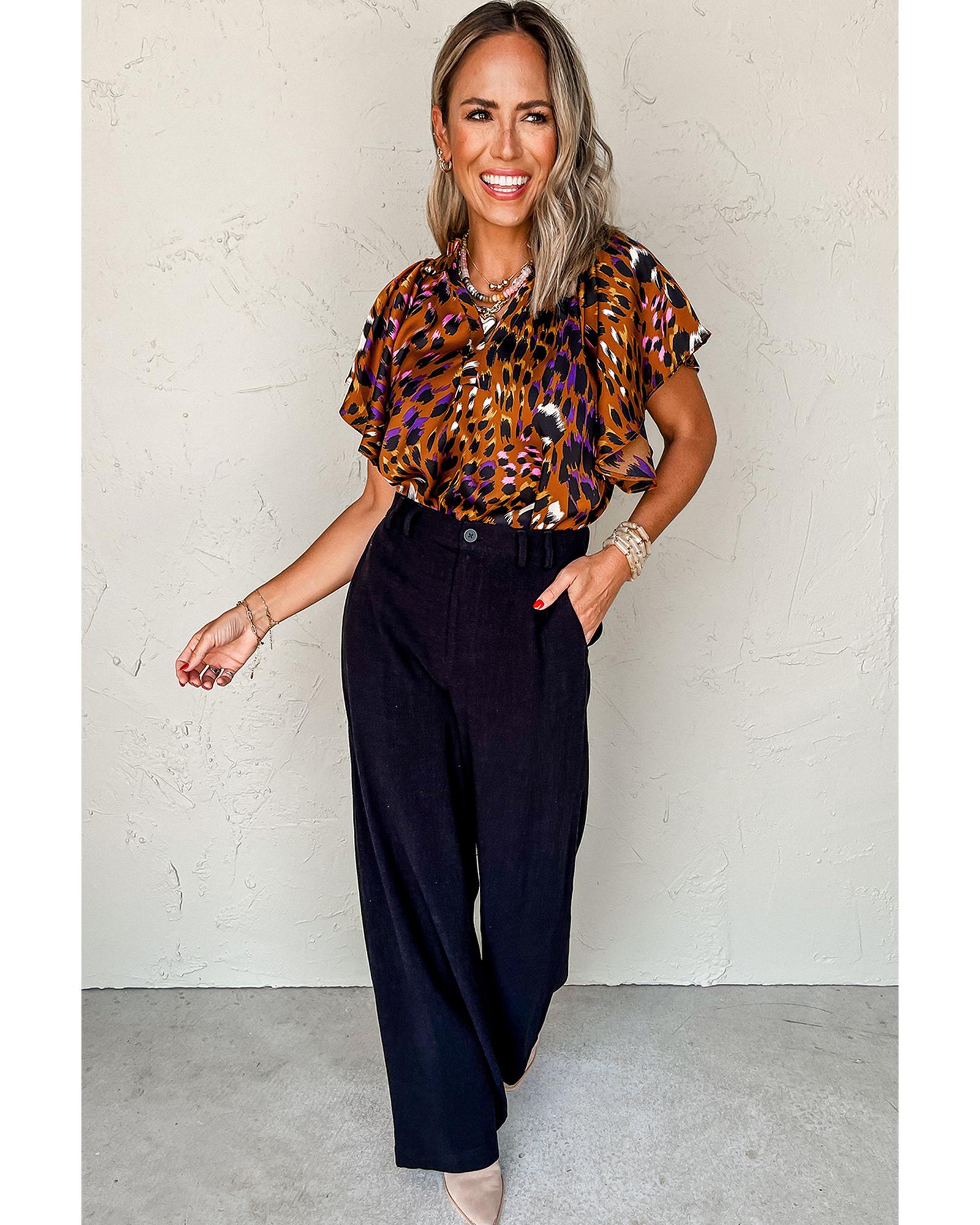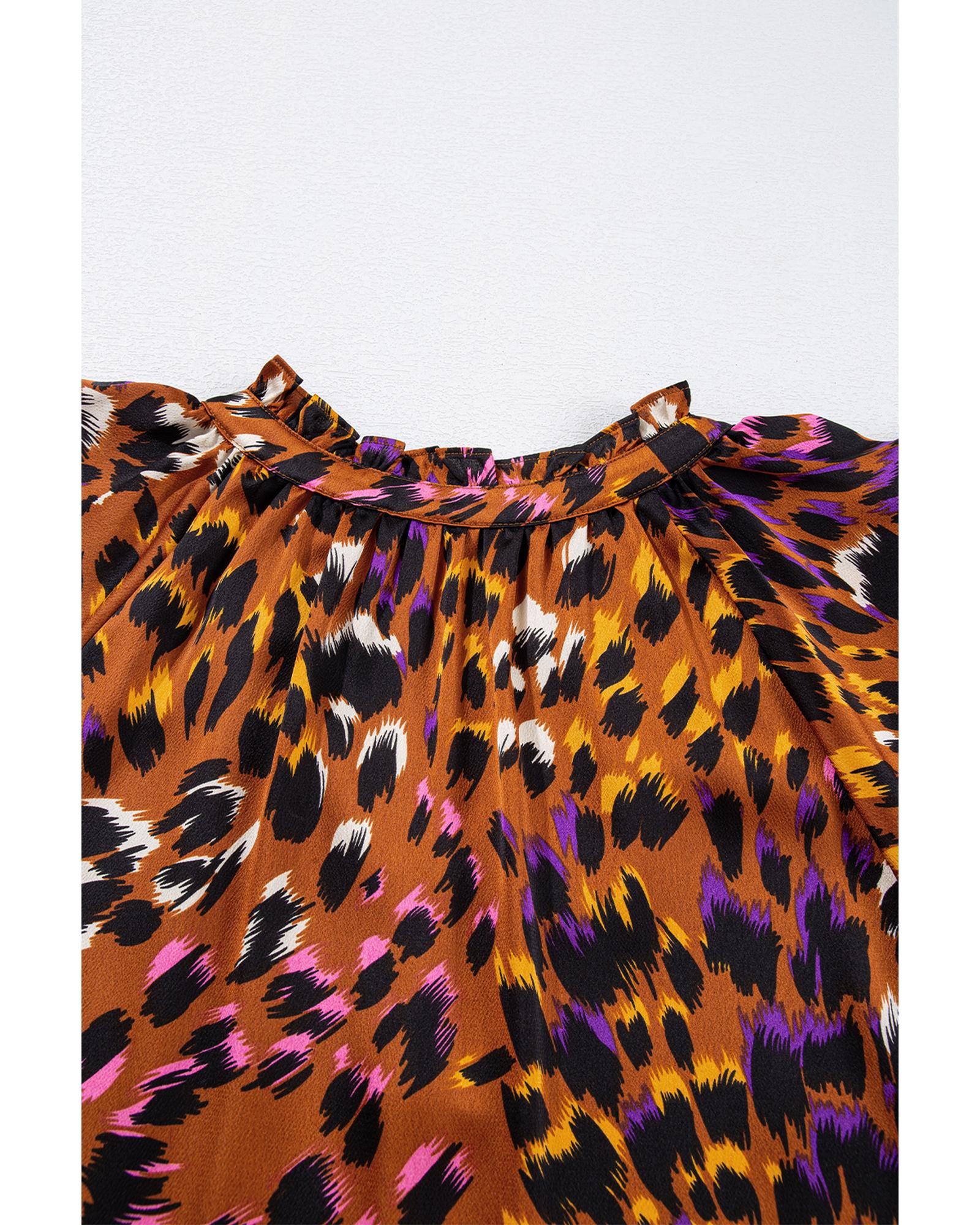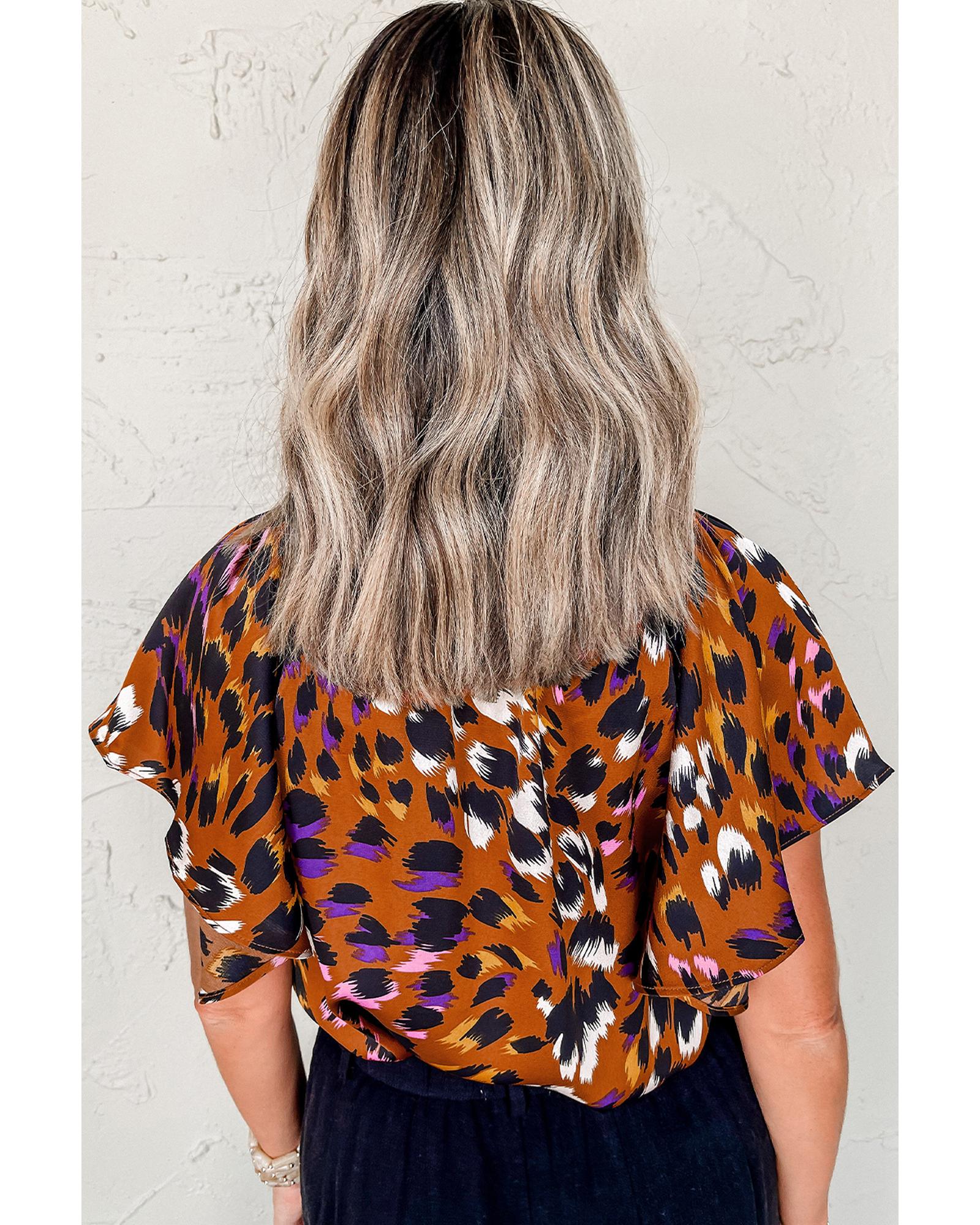 Orange Leopard Printed Draped Short Sleeve Slit V Neck Blouse – S
