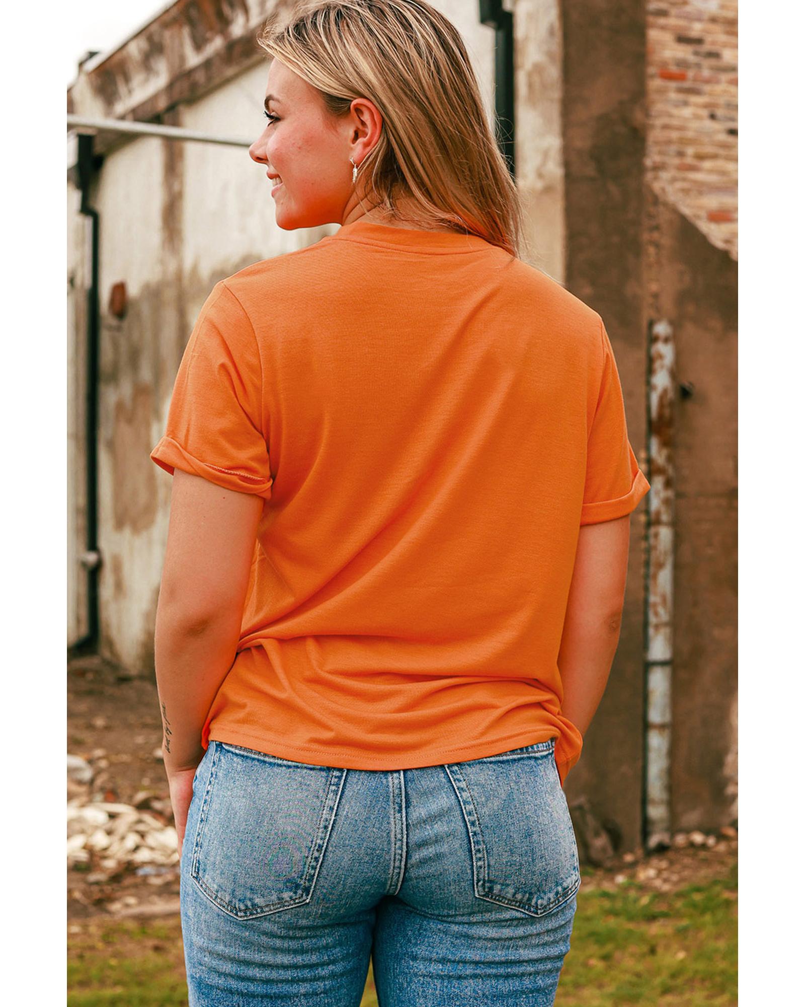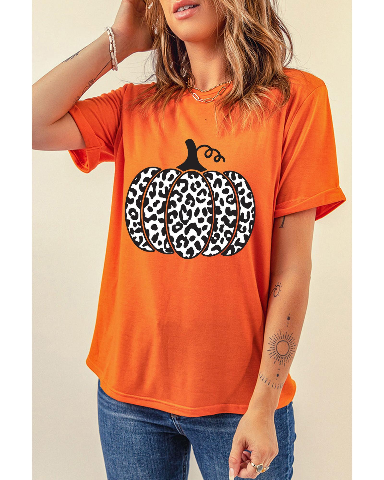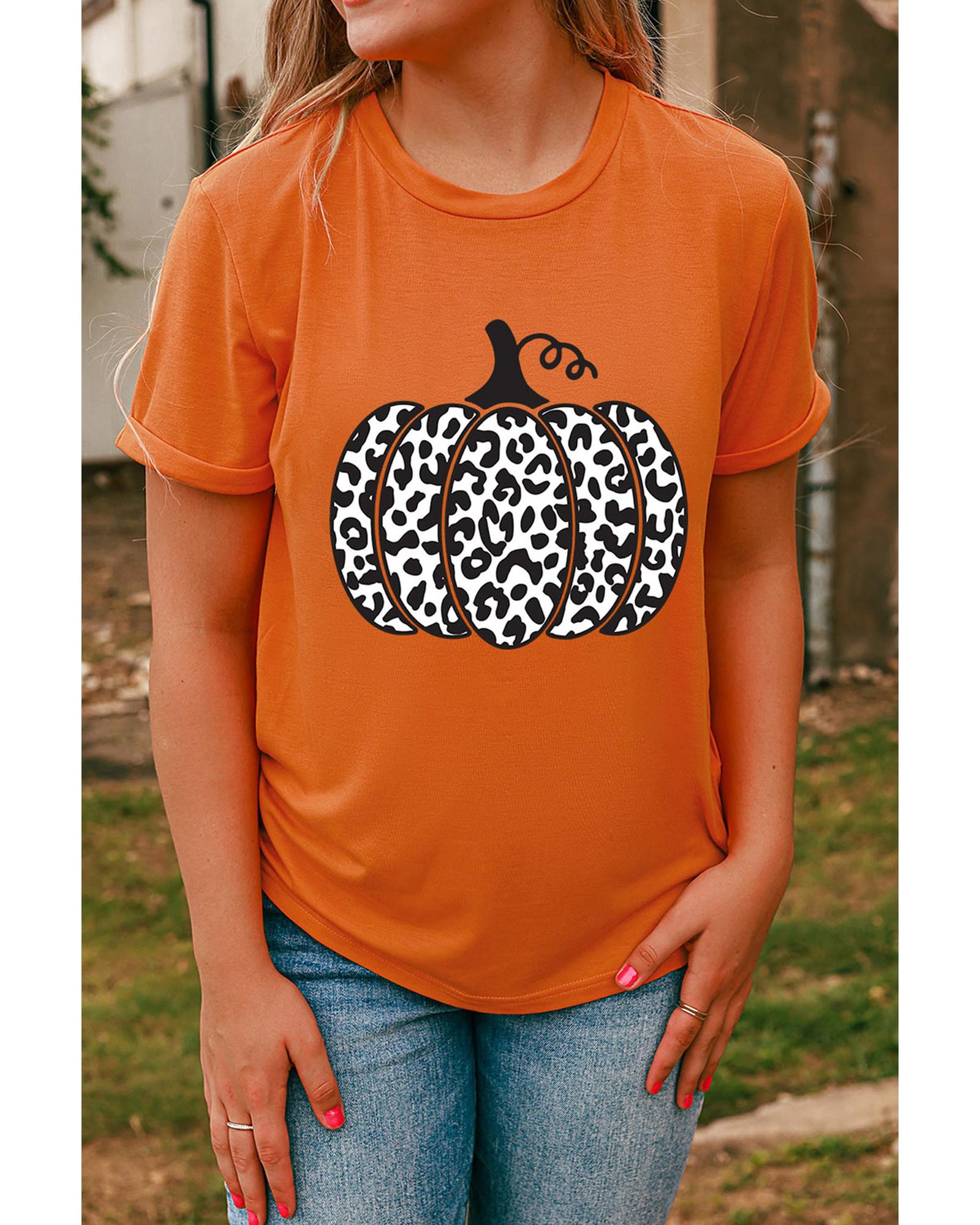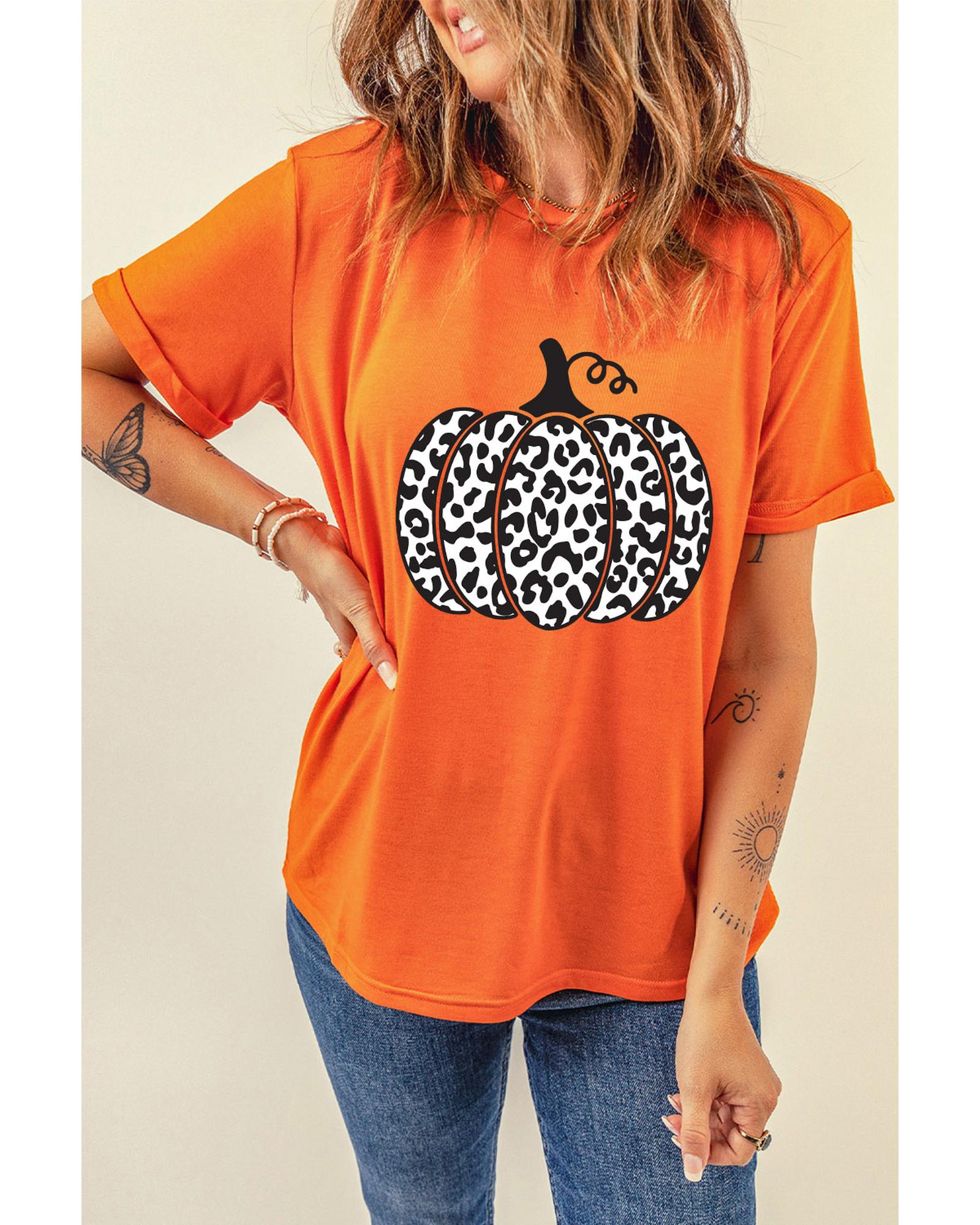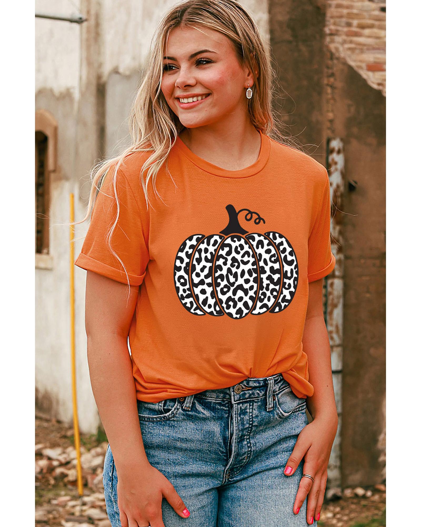 Stylish and trendy Orange Leopard Pumpkin Graphic Daily Fashion Tee Made with high - quality materials for a comfortable fit Features a unique leopard pumpkin graphic design Available in multiple sizes for a perfect fit Pairs well with jeans or shorts for a casual and chic look Ideal for daily wear Must