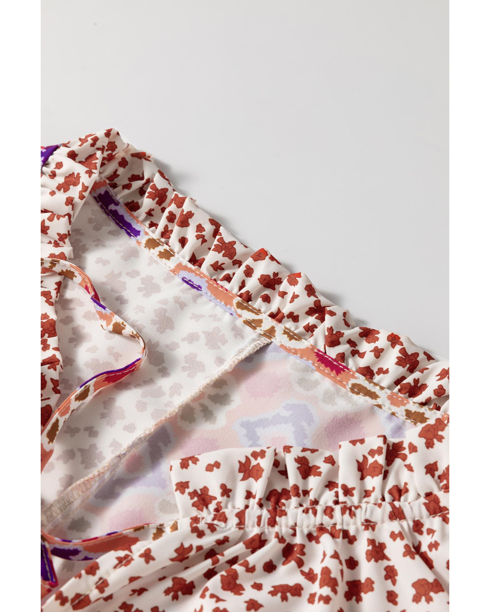 Orange Mixed Floral Printed Long Sleeve Tied V Neck Blouse – L