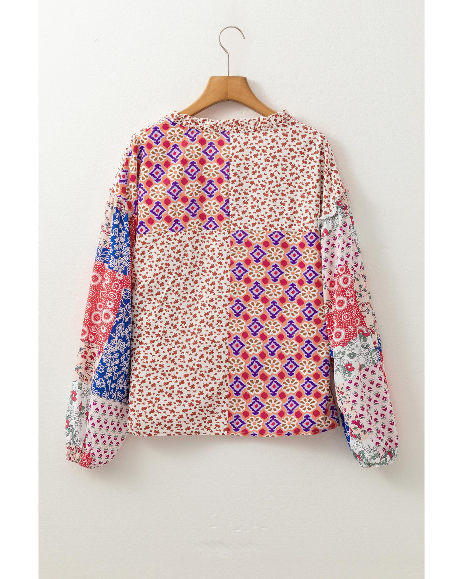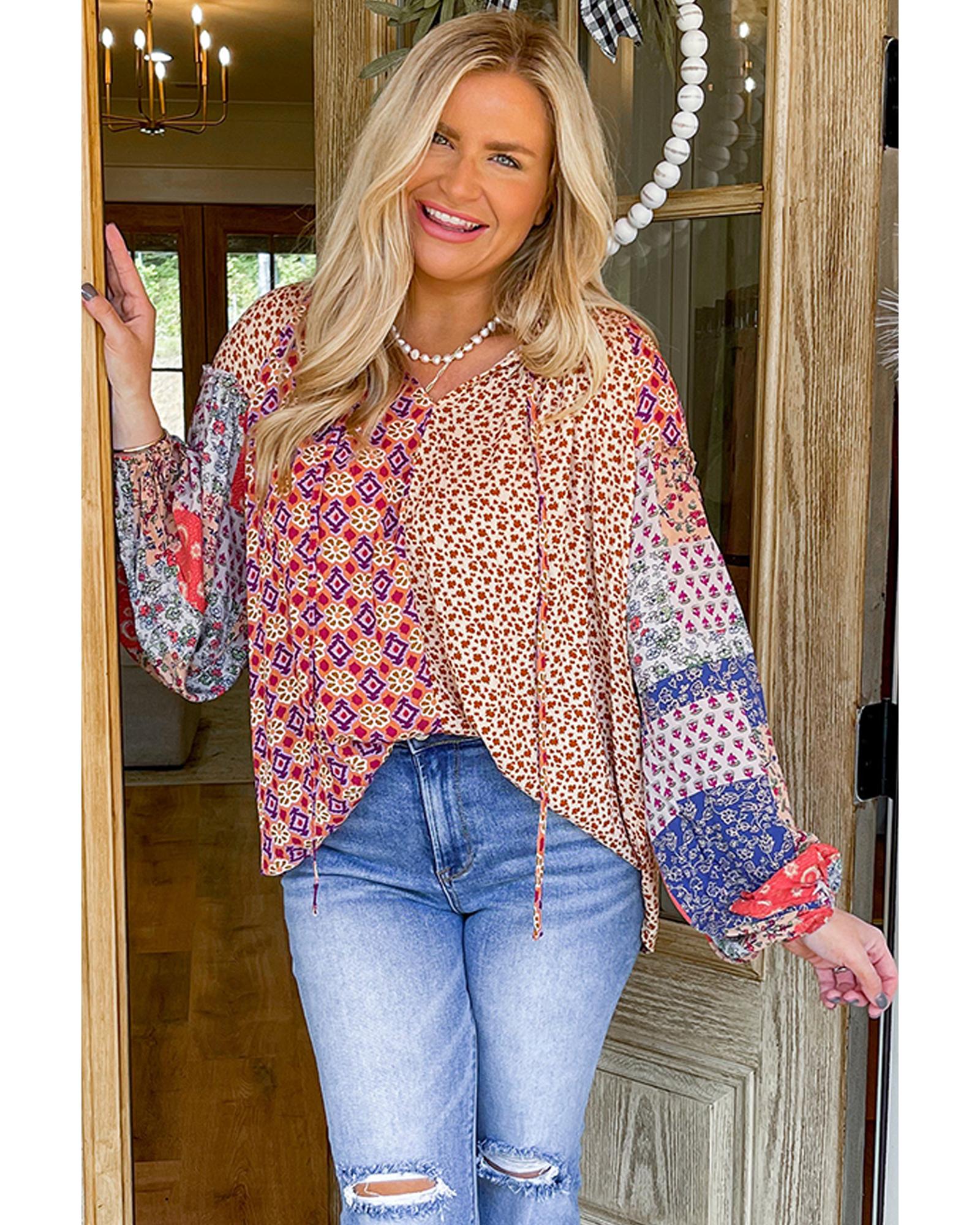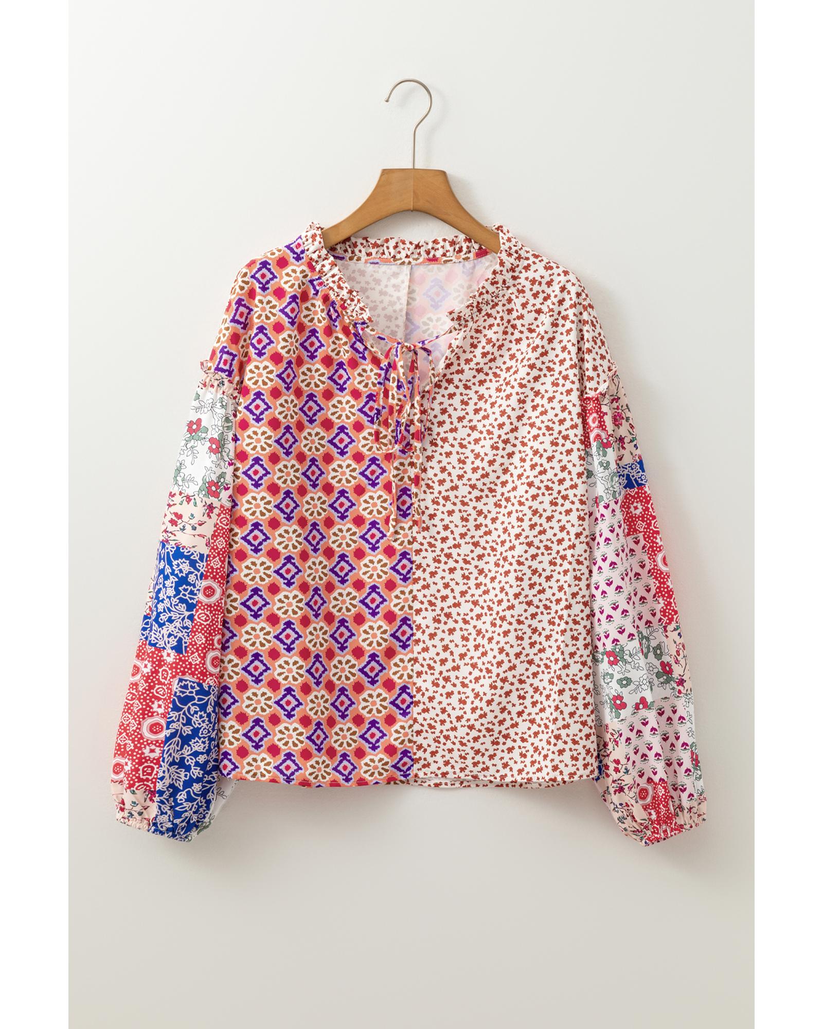 Orange Mixed Floral Printed Long Sleeve Tied V Neck Blouse – S