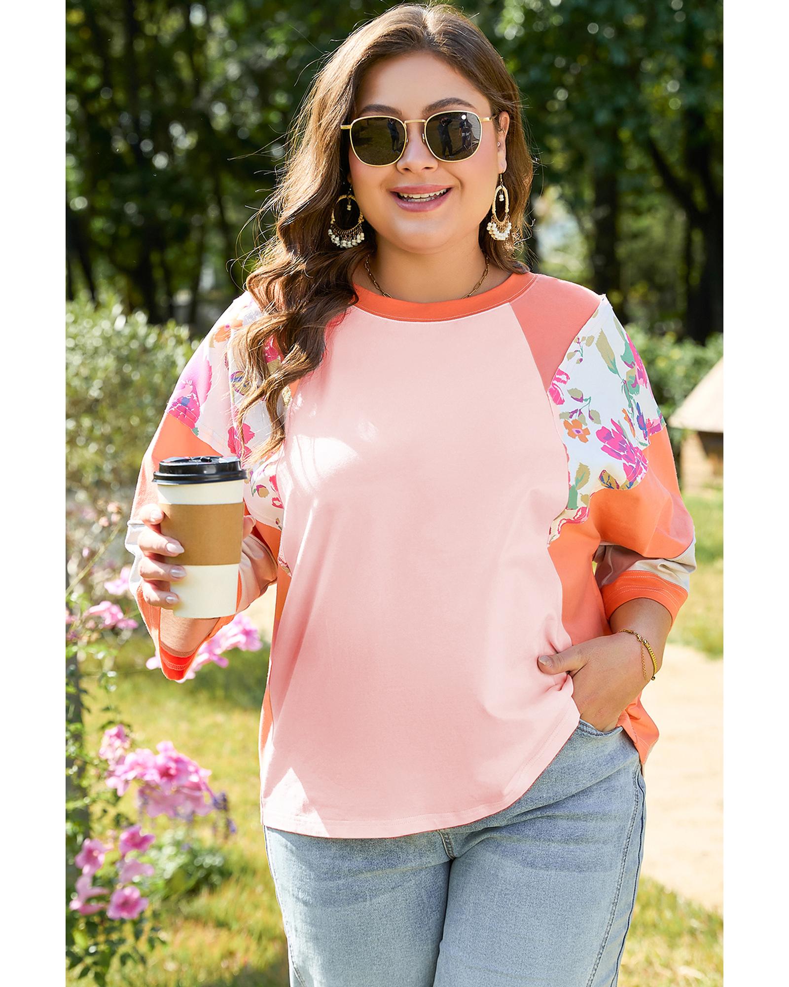 Orange Plus Size Floral Print Patchwork Raglan Half Sleeve Top – 2X
