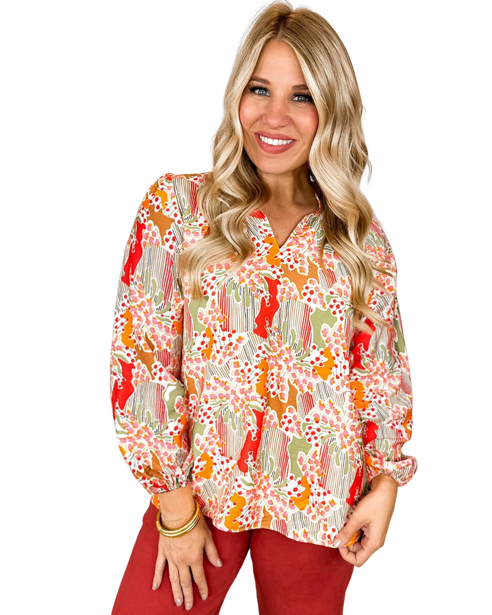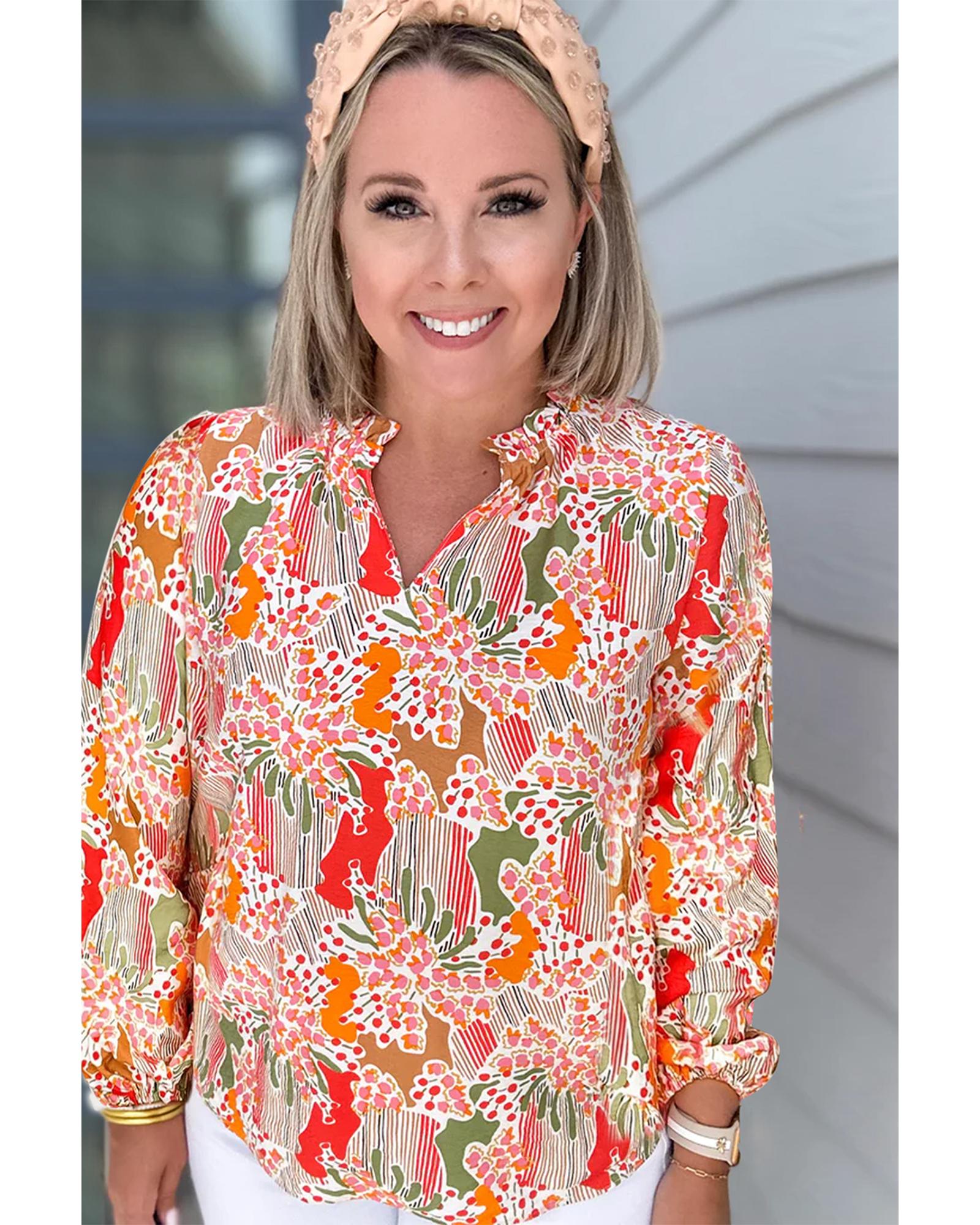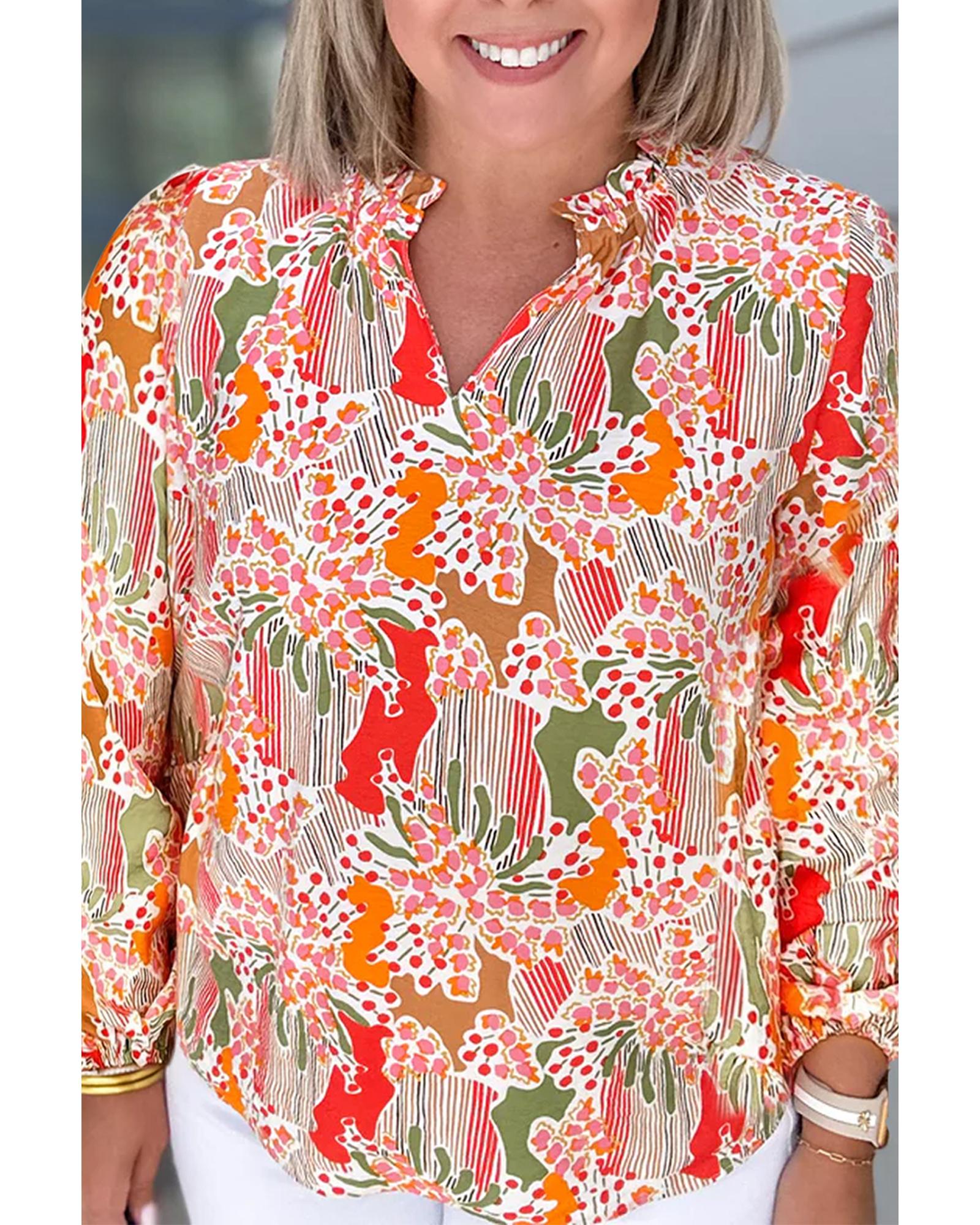 Orange Printed Floral Abstract Print Frilled V Neck Plus Size Blouse – 2X