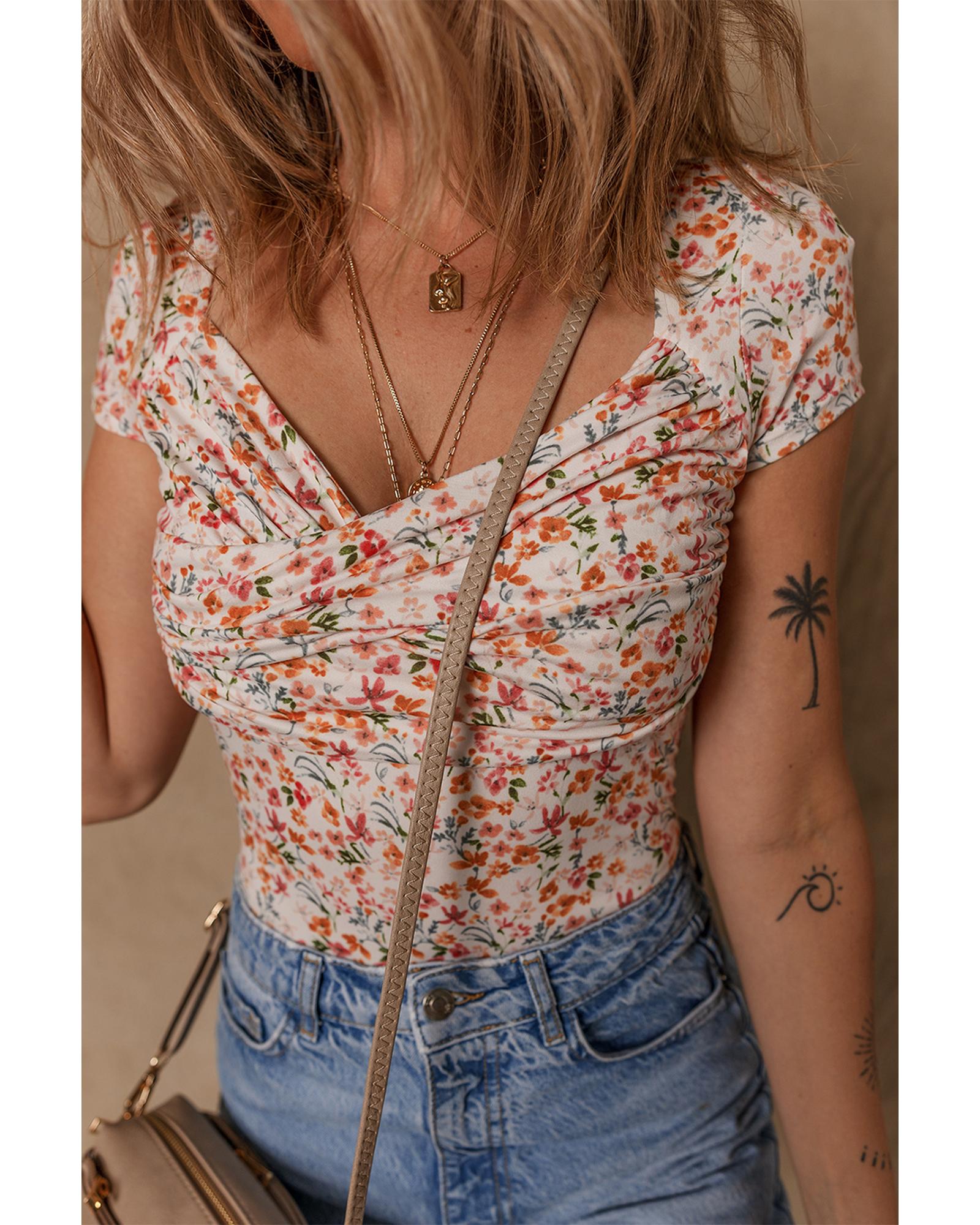 Orange Short Sleeve Floral Ruched Sweetheart Bodysuit – L