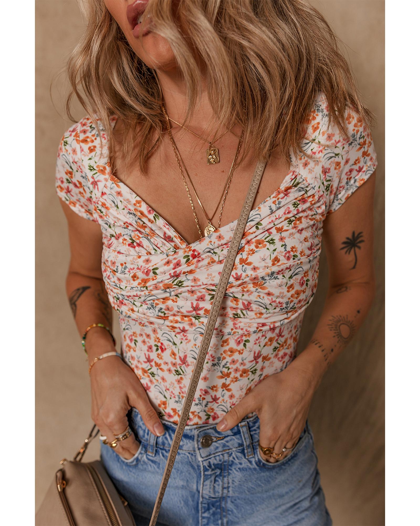 Orange Short Sleeve Floral Ruched Sweetheart Bodysuit – S