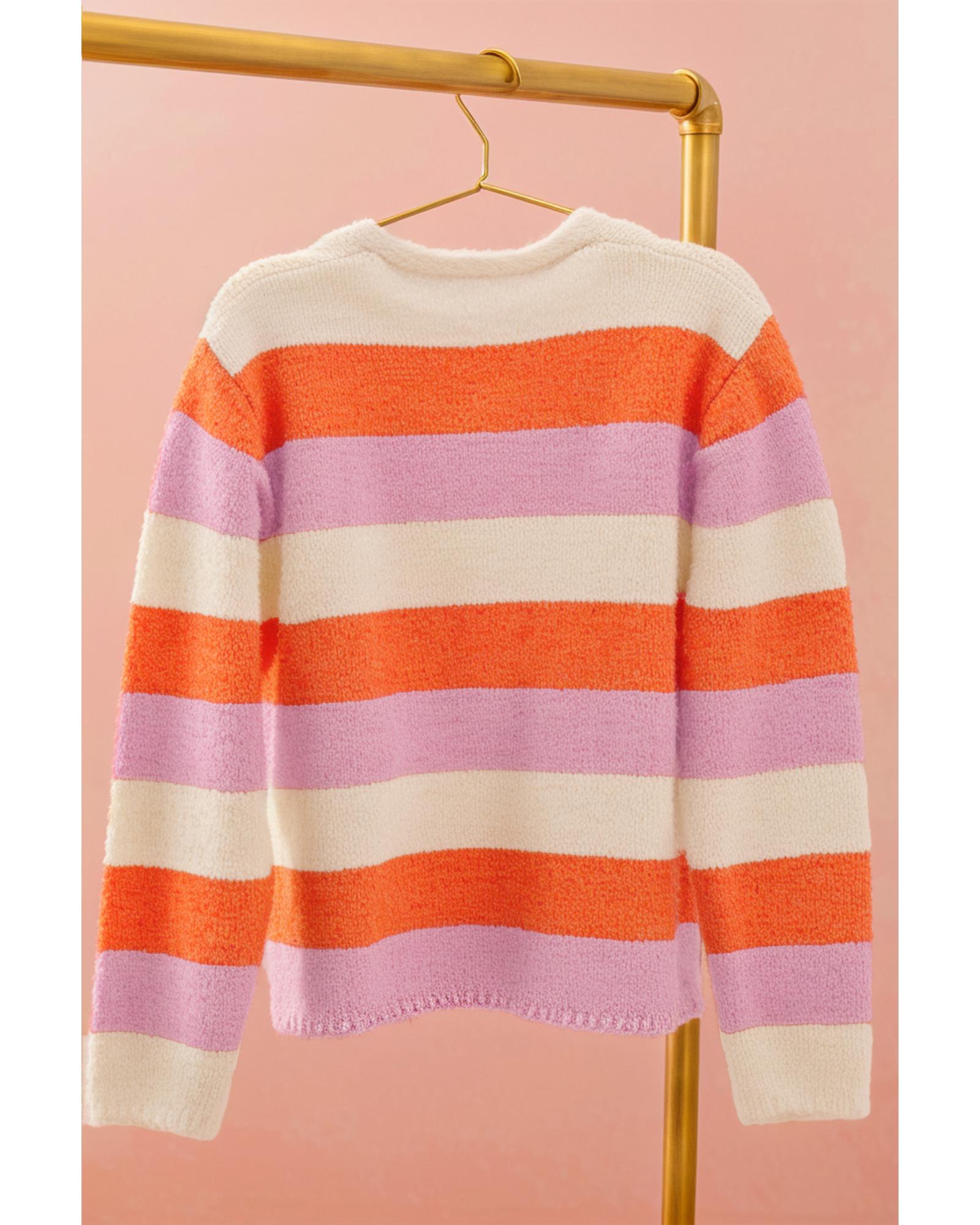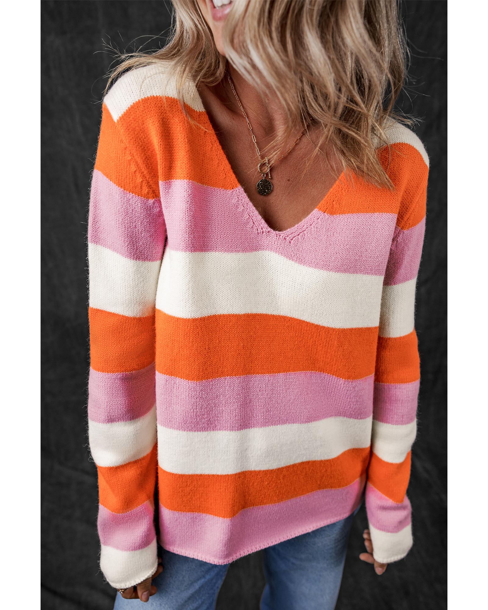 Orange Stripe Colorblock V Neck Casual Sweater – M