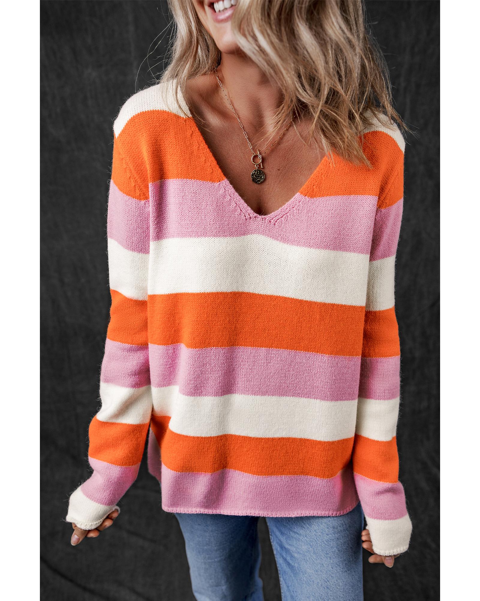 Orange Stripe Colorblock V Neck Casual Sweater – S